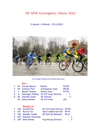 GP MTB Euroregionu Silesia 2012 2.závod – Orlová – 15.4.2012 Foto Radek Šviderký (SK Šafrata Bohumín) 1. 24 2. 25 3. 1 4. 6 5. 30 29 1. 2. 3. 4. 5. 138 101 140 103 105 Elita : Dzirski Marcin Schwarz Petr Musiol Tomasz Neulinger Ondřej Smedek Josef Kubica Roman Masters A : Kovařík Ivo Byrtus Ivo Galuška Tomáš Kamecki Stanislaw Bollo Roman Rybnik Schimpanze team Choma team SK Jiří team Ostrava SK Sentido SK Jiří team 52:58 55:08 57:00 - 1 - 3 dfn SK Jiří team Ostrava 53:09 Sport Klapka Karviná 54:41 SK Šafrata Bohumín 56:11 - 1 Yogi Racing Ostrava - 2 143 Kawecki Dariusz dfn Masters B : 1. 151 Sedláček Jiří 2. 154 Bluszcz Stefan 3. 170 Grzempa Grzegorz 4. 156 Baier Jan Junioři : 1. 202 Svrčina Karel 2. 215 Heczko Filip 3. 213 Stolařík Tomáš 4. 214 Orzel Dominik 5. 212 Jakl Tomáš 6. 206 Keisler Jiří 1. 2. 3. 4. 5. 6. 7. 8. 1. 2. 3. 4. 5. 6. 7. 8. SK Jiří team Ostrava 29:18 SK Šafrata Bohumín - 1 E-Rower B.B. - 1 SK Šafrata Bohumín - 1 SK Jiří team Ostrava 51:05 TŽ Třinec 52:57 SK Jiří team Ostrava - 1 MTB Silesia - 2 SK Jiří team Ostrava - 2 SK Jiří team Ostrava - 2 289 257 286 255 253 290 254 256 Kadeti : Junior mlodszy : Průdek Matěj Prejda Václav Nowak Piotr Szewczyk Michal Prudlo Pawel Petruňa Vojtěch Czuprinski Jakub Kubiš David 310 348 309 303 311 310 308 347 Žáci starší : Mlodzik : Wagner Jakub Gawlowicz Wiktor Herman Ondřej Voznička Vojtěch Hašek Daniel Pelikán Tomáš Petřík Jakub Joannidis Michalis Bike 2000 SK Jiří team Ostrava GK Gliwice Cieszyn Choma team Schimpanzee team SK Šafrata Bohumín VH team MTB Silesia Rybnik VRV team SK Jiří team Ostrava BAG Bike VRV team VRV team Bike 2000 52:58 29:09 30:01 32:18 34:44 35:52 - 1 - 2 16:52 18:09 19:23 20:48 21:47 21:55 21:56 - 1 1. 2. 3. 4. 5. 6. 7. 8. 9. 10. 11. 12. 1. 2. 3. 4. 5. 1. 2. 3. 4. 5. 1. 2. 3. 4. 5. 6. 7. 395 351 357 392 356 396 361 391 397 355 359 360 405 408 403 406 401 407 94 93 98 99 92 341 344 343 346 345 342 307 Źak / Mladší žáci : Stoček Bruno Bike 2000 Huráč Vojtěch Feso Petřvald Olszar Antoni Cieszyn Hašek Max BAG Bike Sitko Adrian KTS Tychy Zajíc Daniel Bike 2000 Tuharský Erich Schimpanzee team Mareš Matěj Adámek Antonín Bike 2000 Czech Maciej Wodzislaw Bohdalovský Jiří SK Jiří team Ostrava Swaczyna Tomáš Schimpanzee team 19:41 21:04 21:59 21:59 24:14 25:25 25:29 25:59 26:15 26:38 - 1 - 1 Mlodszy źak: Předžáci : Pomiklo Daniel BAG Bike Voznička Ondřej SK Jiří team Ostrava Grzegorzek Julian Vall Jan Kawecki Igor Handlíř Marek disk. Kobiety Elita : Ženy : Macíková Lucie Bartošová Denisa Drabik Dagmara Socha Justyna Rajská Lenka Ghost - mojekolo 33:40 SK Maxbike Orlová 35:35 Choma team Choma team - 1 SK Šafrata Bohumín - 1 Mlodzicka + juniorka ml. St.žákyně + kadetky : Prejdová Marie Tvarůžková Tereza Nováková Barbora Knapková Denisa Krupová Lucie Pytlová Markéta Joannidu Marie SK Jiří team Ostrava VRV team VRV team VRV team VRV team BAG Bike Bike 2000 19:11 19:19 20:28 21:41 21:48 24:31 24:31 8. 349 Pilchovská Aneta 1. 2. 3. 4. 1. 2. 3. 4. 5. SK Šafrata Bohumín 394 398 390 393 Źak – dziewczyny : Mladší žákyně : Hermanová Veronika Faroń Wiktoria Bojková Michaela Gajdáčková Petra 448 449 440 450 404 Ml. Źak – dziewczyny : Předžákyně : Pytlová Eva BAG Bike Pala Zuzana Gibas Dominika Choma Laura Choma team Chrzaszcz Olivia Choma team VRV team VKS Gymnazium Bike 2000 SK Šafrata Bohumín 28:38 16:13 17:08 26:59 29:17 Výsledky i průběžné pořadí budou zveřejňovány na našich klubových stránkách : http://sksafrata.netstranky.cz/mtb-gp-silesia-2012.html Další závody seriálu : 6.5. 27.5. 10.6. 17.6. 1.9. Bohumín Rydultowy Wodzislaw Horní Suchá Rydultowy - finále