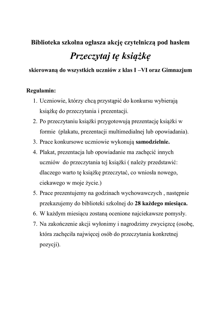 Biblioteka szkolna ogłasza akcję czytelniczą pod hasłem Przeczytaj tę książkę skierowaną do wszystkich uczniów z klas I –VI oraz Gimnazjum Regulamin: 1. Uczniowie, którzy chcą przystąpić do konkursu wybierają książkę do przeczytania i prezentacji. 2. Po przeczytaniu książki przygotowują prezentację książki w formie (plakatu, prezentacji multimedialnej lub opowiadania). 3. Prace konkursowe uczniowie wykonują samodzielnie. 4. Plakat, prezentacja lub opowiadanie ma zachęcić innych uczniów do przeczytania tej książki ( należy przedstawić: dlaczego warto tę książkę przeczytać, co wniosła nowego, ciekawego w moje życie.) 5. Prace prezentujemy na godzinach wychowawczych , następnie przekazujemy do biblioteki szkolnej do 28 każdego miesiąca. 6. W każdym miesiącu zostaną ocenione najciekawsze pomysły. 7. Na zakończenie akcji wyłonimy i nagrodzimy zwycięzcę (osobę, która zachęciła najwięcej osób do przeczytania konkretnej pozycji).