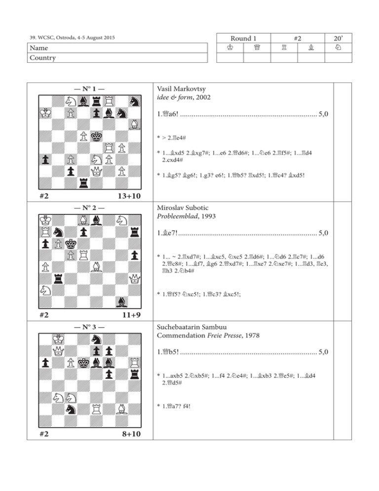 Round 1 ¢ £ 39. WCSC, Ostroda, 4-5 August 2015 Name Country — N° 1 — XIIIIIIIIY 9-+NvlrtR-sn0 9mK-zP-zplsn-0 9-+-+-+-vL0 9+-+Pmk-+-0 9-+-+-tRP+0 9zp-zP-sNP+-0 9-+p+Q+P+0 9+-+r+-+-0 xiiiiiiiiy #213+10 — N° 2 — XIIIIIIIIY 9K+-vLl+N+0 9tRn+p+-+r0 9pzPk+-+-+0 9+-zPR+-+p0 9P+-+L+-+0 9+r+-+-+Q0 9N+-+-+-+0 9+-+-+-vl-0 xiiiiiiiiy #211+9 — N° 3 — XIIIIIIIIY 9-mK-+n+-+0 9+Q+-zpp+-0 9p+Pmklvl-tR0 9+-+-+p+r0 9-+-+-+-+0 9+NsN-+-+-0 9-+n+R+L+0 9+-+-+-+-0 xiiiiiiiiy #28+10 #2 ¦ ¥ Vasil Markovtsy idee & form, 2002 1.£a6!........................................................................ 5,0 ** > 2.¦e4# ** 1...¥xd5 2.¥xg7#; 1...e6 2.£d6#; 1...¤e6 2.¦f5#; 1...¦d4 2.cxd4# ** 1.¥g5? ¥g6!; 1.g3? e6!; 1.£b5? ¦xd5!; 1.£c4? ¥xd5! Miroslav Subotic Probleemblad, 1993 1.¥e7!......................................................................... 5,0 ** 1... ~ 2.¦xd7#; 1...¥xc5, ¤xc5 2.¦d6#; 1...¤d6 2.¦c7#; 1...d6 2.£c8#; 1...¥f7, ¥g6 2.£xd7#; 1...¦xe7 2.¤xe7#; 1...¦d3, ¦e3, ¦h3 2.¤b4# ** 1.£f5? ¤xc5!; 1.£c3? ¥xc5!; Suchebaatarin Sambuu Commendation Freie Presse, 1978 1.£b5!........................................................................ 5,0 ** 1...axb5 2.¤xb5#; 1...f4 2.¤e4#; 1...¥xb3 2.£e5#; 1...¥d4 2.£d5# ** 1.£a7? f4! 20’ ¤ Round 2 ¢ £ 39. WCSC, Ostroda, 4-5 August 2015 Name Country — N° 4 — XIIIIIIIIY 9-+-sN-+-+0 9+-+-zpp+-0 9-mKp+-+-vl0 9sN-zPk+-+l0 9-zP-+Rzprsn0 9+-+-+pzp-0 9-+-+-+-+0 9+L+-+-sn-0 xiiiiiiiiy #37+12 — N° 5 — XIIIIIIIIY 9Nvl-+-sNK+0 9+PzpLzp-wQ-0 9-tr-mkp+p+0 9+-+-tR-+-0 9-wqRzP-+-+0 9+-zp-+-+-0 9l+Ptr-+-+0 9+-+-+-vL-0 xiiiiiiiiy #311+11 — N° 6 — XIIIIIIIIY 9-+-+N+-sn0 9+p+Rzpr+l0 9-+-+-zp-+0 9+-+Pmk-+-0 9L+-zp-+PvL0 9+-zp-+pmK-0 9-zp-zP-sNP+0 9wQq+-+-+-0 xiiiiiiiiy #311+12 #3 ¦ ¥ Volker Zipf 1st honourable mention Freie Presse, 1978 1.¢a7! (> 2.¤c4) 1...¥g6 2.¤dxc6 1...f5 2.¤axc6 ** 1.¤axc6? ¤f5!; 1.¤dxc6? ¤g6! ** 1.¢c7? ¥g7!; 1.¢b7? ¤f5!; 1.¢a6? f2! @ = 1,5 / 3,0 / 5,0 Uri Avner & Shlomo Seider Die Schwalbe, 1987 1.d5! (> 2.¦ee4).............................................................. 1,0 1...c6 2.£f7........................................................... 1,0 1...c5 2.¤xg6......................................................... 1,0 1...£xc4, ¥xc4 2.¦xe6+........................................ 0,5 1...£a5, £b5 2.¤xg6............................................ 0,5 1...¦d4, ¦f2, ¦g2, ¦h2 2.¦xe6+............................ 0,5 1...¦e2 2.¦xe2 ...................................................... 0,5 Yuri Fokin & Nikolai Ivanov 1st prize Baby 50 JT, 1993 1.¥c6! (> 2.¦xe7+) 1...£f5, £g6 2.£e1+ 1...d3 2.£a4 1...bxc6 2.£a5 1...e6 2.£a3 1...¤g6 2.£a7 @ = 1,0 / 2,0 / 2,5 / 3,0 / 4,0 / 5,0 60’ ¤ 39. WCSC, Ostroda, 4-5 August 2015 Name Country — N° 7 — XIIIIIIIIY 9-+k+-+-+0 9+-+l+-+-0 9-+-+-+-+0 9tRP+-+-+-0 9-+-+-+r+0 9zp-zp-+-+-0 9-+-zPK+L+0 9+-+-+-+-0 xiiiiiiiiy =5+5 — N° 8 — XIIIIIIIIY 9L+-+K+q+0 9+-zP-zp-+N0 9-+-+-+-vL0 9+-+P+-+-0 9-+-+-+-+0 9+-+k+-+-0 9-sn-tr-+-+0 9+-+-+N+-0 xiiiiiiiiy =7+5 — N° 9 — XIIIIIIIIY 9-+-+-+-+0 9snp+-+-+-0 9p+-+-+-+0 9+-+-+-vL-0 9N+r+-+-+0 9mkp+-+-+-0 9-+-+-+-+0 9+K+-+-tR-0 xiiiiiiiiy +4+6 Round 3 ¢ £ eg ¦ ¥ Martin Minski Original for Die Schwalbe, 2016 1.¥e4.......................................................................... 2,0 1...¦xe4+ 2.¢d3 ¦a4 3.¦xa4 ¥xb5+ 4.¦c4+............ 2,0 4...¥xc4 5.¢xc3......................................................... 1,0 5...a2 6.¢b2 = 5...¢c7 6.¢c2 ¥a2 7.¢c3 ¢b6 8.¢b4 = 5...¥d3 6.¢b3 = Michal Hlinka & Karel Husák 2nd prize L’Italia Scacchistica, 1992 (correction) 1.¤f8.......................................................................... 1,0 1...¦c2 2.¥c6 ¤c4 3.¥b5........................................... 1,0 3...¢d4 4.¥g7+.......................................................... 1,0 4...¢xd5 5.¥xc4+ ¦xc4 6.¤e3+ ¢d6 7.¤f5+.......... 1,0 7...¢xc7 8.¤xe7........................................................ 1,0 8...¦e4 9.¥e5+ ¦xe5 stalemate 8...£xg7 9.¤e6+ = Abram Gurvich 2nd prize Shakhmaty, 1929 (version) 1.¤b2......................................................................... 1,0 1...¦e4 2.¥e3............................................................ 1,0 2...¤c6 3.¥c5+ ¤b4 4.¤d3 a5 5.¥xb4+................... 1,0 5...axb4 6.¦g8............................................................ 1,0 6...¦e6 7.¦a8+ ¦a6 8.¦xa6+ bxa6 9.¤b2................ 1,0 9...a5 10.¢a1 a4 11.¤c4# 100’ ¤ Round 4 ¢ £ 39. WCSC, Ostroda, 4-5 August 2015 Name Country — N° 10 — XIIIIIIIIY 9l+-+-+-+0 9+-+p+-sn-0 9-+-zP-zp-sn0 9+-+-zp-mkN0 9-+-+PsNLzp0 9+-+-tr-tRr0 9-+-+P+-vl0 9+-+-+-+K0 xiiiiiiiiy H#2 4 sol. 8+11 — N° 11 — XIIIIIIIIY 9-+-+L+-+0 9+-+q+-+-0 9-+-+-zp-+0 9+p+-snp+-0 9-+PzPP+-tR0 9+-+k+-+p0 9K+-+-+-sn0 9+-+-+-+-0 xiiiiiiiiy H#3 b)qd6 c)qd56+8 — N° 12 — XIIIIIIIIY 9-+-+-+-+0 9+-+-zp-+-0 9-+-+-+-+0 9+p+-+-+-0 9-+kzp-+-+0 9zppvl-+-+-0 9ptrpvLp+-+0 9wqnmK-+-sn-0 xiiiiiiiiy H#6 2 sol. 2+14 H# ¦ ¥ Unto Heinonen Die Schwalbe, 2000 I) 1.¦exg3 ¤e6+ 2.¢xg4 ¤xf6# II) 1.exf4 ¥f5+ 2.¢xh5 ¥g6# III) 1.¤xh5 ¥f5+ 2.¥xg3+ ¤xh3# IV) 1.¤xg4 ¤xf6 2.¢xf4 ¦xg4# @ = 1,0 / 2,5 / 4,0 / 5,0 Christopher Jones Original for WCSC 2015 a) 1.¤eg4 exf5 2.¢e4 ¦xg4+ 3.¢xf5 ¥xd7# b) 1.fxe4 dxe5 2.¢d4 ¥g6 3.¢xe5 ¦xe4# c) 1.¤c6 cxd5 2.¢c4 e5 3.¢xd5 ¥f7# @ = 1,5 / 3,0 / 5,0 Wilfried Neef Original for mpk-Blätter 2015 I) 1.¥b4 ¥f4 2.¤c3+ ¢d2 3.d3 ¢e3 4.¤b1 ¢e4 5.¢c3 ¢d5 6.¤d2 ¥e5#........................ 2,5 II) 1.¤h3 ¥xc3 2.¤d2+ ¢xd2 3.£h1 ¥xb2 4.¢b4 ¢d3 5.£a8 ¢xd4 6.£a4 ¥c3#...................... 2,5 50’ ¤ Round 5 ¢ £ 39. WCSC, Ostroda, 4-5 August 2015 Name Country — N° 13 — XIIIIIIIIY 9-vl-+-+-+0 9+-+-+-+-0 9-+-zP-+L+0 9zp-zP-+-+-0 9-+-+-mk-sN0 9+-+-+p+-0 9-+K+-+-+0 9+-+-+-wQ-0 xiiiiiiiiy #46+4 — N° 14 — XIIIIIIIIY 9-+-vL-snN+0 9zpp+lzp-vl-0 9n+p+P+-+0 
