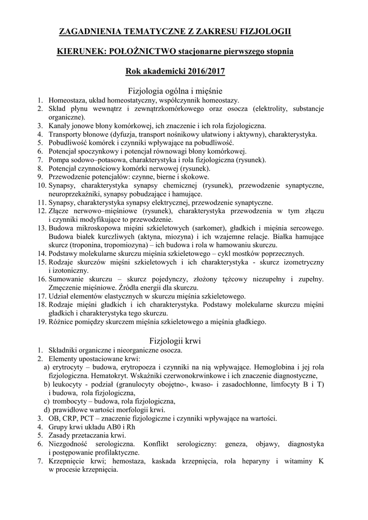 ZAGADNIENIA TEMATYCZNE Z ZAKRESU FIZJOLOGII KIERUNEK: POŁOŻNICTWO stacjonarne pierwszego stopnia Rok akademicki 2016/2017 Fizjologia ogólna i mięśnie 1. Homeostaza, układ homeostatyczny, współczynnik homeostazy. 2. Skład płynu wewnątrz i zewnątrzkomórkowego oraz osocza (elektrolity, substancje organiczne). 3. Kanały jonowe błony komórkowej, ich znaczenie i ich rola fizjologiczna. 4. Transporty błonowe (dyfuzja, transport nośnikowy ułatwiony i aktywny), charakterystyka. 5. Pobudliwość komórek i czynniki wpływające na pobudliwość. 6. Potencjał spoczynkowy i potencjał równowagi błony komórkowej. 7. Pompa sodowo–potasowa, charakterystyka i rola fizjologiczna (rysunek). 8. Potencjał czynnościowy komórki nerwowej (rysunek). 9. Przewodzenie potencjałów: czynne, bierne i skokowe. 10. Synapsy, charakterystyka synapsy chemicznej (rysunek), przewodzenie synaptyczne, neuroprzekaźniki, synapsy pobudzające i hamujące. 11. Synapsy, charakterystyka synapsy elektrycznej, przewodzenie synaptyczne. 12. Złącze nerwowo–mięśniowe (rysunek), charakterystyka przewodzenia w tym złączu i czynniki modyfikujące to przewodzenie. 13. Budowa mikroskopowa mięśni szkieletowych (sarkomer), gładkich i mięśnia sercowego. Budowa białek kurczliwych (aktyna, miozyna) i ich wzajemne relacje. Białka hamujące skurcz (troponina, tropomiozyna) – ich budowa i rola w hamowaniu skurczu. 14. Podstawy molekularne skurczu mięśnia szkieletowego – cykl mostków poprzecznych. 15. Rodzaje skurczów mięśni szkieletowych i ich charakterystyka - skurcz izometryczny i izotoniczny. 16. Sumowanie skurczu – skurcz pojedynczy, złożony tężcowy niezupełny i zupełny. Zmęczenie mięśniowe. Źródła energii dla skurczu. 17. Udział elementów elastycznych w skurczu mięśnia szkieletowego. 18. Rodzaje mięśni gładkich i ich charakterystyka. Podstawy molekularne skurczu mięśni gładkich i charakterystyka tego skurczu. 19. Różnice pomiędzy skurczem mięśnia szkieletowego a mięśnia gładkiego. Fizjologii krwi 1. Składniki organiczne i nieorganiczne osocza. 2. Elementy upostaciowane krwi: a) erytrocyty – budowa, erytropoeza i czynniki na nią wpływające. Hemoglobina i jej rola fizjologiczna. Hematokryt. Wskaźniki czerwonokrwinkowe i ich znaczenie diagnostyczne, b) leukocyty - podział (granulocyty obojętno-, kwaso- i zasadochłonne, limfocyty B i T) i budowa, rola fizjologiczna, c) trombocyty – budowa, rola fizjologiczna, d) prawidłowe wartości morfologii krwi. 3. OB, CRP, PCT – znaczenie fizjologiczne i czynniki wpływające na wartości. 4. Grupy krwi układu AB0 i Rh 5. Zasady przetaczania krwi. 6. Niezgodność serologiczna. Konflikt serologiczny: geneza, objawy, diagnostyka i postępowanie profilaktyczne. 7. Krzepnięcie krwi; hemostaza, kaskada krzepnięcia, rola heparyny i witaminy K w procesie krzepnięcia. 8. Fibrynoliza, czynniki zapobiegające krzepnięciu krwi w naczyniach. Neurofizjologia 1. Podział układu nerwowego. 2. Budowa komórki nerwowej oraz rodzaje neuronów (ruchowe, czuciowe, interneurony) i ich cechy charakterystyczne. 3. Degeneracja (pojęcie i rodzaje), nadwrażliwość odnerwieniowa, regeneracja i udział neurotrofin w regeneracji. 4. Komórki gleju, ich podział i rola fizjologiczna. 5. Bariera krew – mózg i jej znaczenie fizjologiczne. 6. Płyn mózgowo – rdzeniowy – krążenie i znaczenie fizjologiczne. 7. Rdzeń kręgowy: budowa rdzenia, prawo Bella-Magendiego. 8. Odruch rozciągowy, łuk odruchowy tego odruchu i jego znaczenie fizjologiczne. 9. Odruch zgięciowy, łuk odruchowy tego odruchu i jego znaczenie fizjologiczne 10. Odruch odwrócony rozciągowy, łuk odruchowy tego odruchu i jego znaczenie fizjologiczne. 11. Regulacja napięcia mięśniowego na poziomie rdzenia kręgowego. 12. Dolny neuron motoryczny (DNM): lokalizacja, objawy uszkodzenia. 13. Uszkodzenie rdzenia kręgowego – szok rdzeniowy. 14. Kora ruchowa (dokładna lokalizacja) i jej organizacja, homunkulus ruchowy, droga piramidowa – przebieg i charakterystyka, GNM i objawy jego uszkodzenia. 15. Jądra podstawy mózgu – charakterystyka, znaczenie fizjologiczne, uszkodzenie jąder podstawnych - zespół Parkinsona. 16. Móżdżek, podział anatomiczno-fizjologiczny, rola w organizacji i planowaniu ruchów oraz utrzymaniu równowagi, poprawka móżdżkowa, uszkodzenia móżdżku. 17. Oś czuciowa: receptory, ich podział, transdukcja czuciowa (kodowanie analogowo-cyfrowe) adaptacja receptorów. 18. Drogi czuciowe: układ tylnopowrózkowy i droga rdzeniowo-wzgórzowa, charakterystyka przewodzenia w tych drogach. 19. Kora czuciowa, homunkulus czuciowy. Plastyczność kory czuciowej. 20. Ból - charakterystyka nocyceptorów, transmisja bólu (podwójna), percepcja bólu. Lokalizacja i działanie bramek bólu. Zstępujący układ analgetyczny mózgu. Rola endogennych opiatów. 21. Termorecepcja. 22. Aktywacja mózgu: układ siatkowaty pnia mózgu (US). RAS i układ wzgórzowy. Rola US w regulacji napięcia mięśniowego, stanów snu i czuwania. 23. Sen - jego rodzaje i charakterystyka. 24. Podwzgórze – budowa, połączenia nerwowe. 25. Rola podwzgórza w kontroli układu autonomicznego. 26. Rola podwzgórza w kontroli układu dokrewnego – dwa typy połączeń z przysadką mózgową oraz sposoby regulowania wydzielania hormonów przez przysadkę. 27. Rytmy okołodobowe – lokalizacja ośrodka i mechanizm jego aktywacji. 28. Regulacja temperatury ciała – lokalizacja ośrodka termoregulacji, zmiany hormonalne, fizjologiczne i behawioralne w odpowiedzi na wzrost i spadek temperatury otoczenia, gorączka – mechanizm powstawania i rola fizjologiczna. 29. Regulacja przyjmowania pokarmu – lokalizacja ośrodka głodu i sytości, ich regulacja hormonalna, regulacja przyjmowania pokarmu, rola leptyny. 30. Regulacja objętości i osmolarności płynów ustrojowych. 31. Układ limbiczny – budowa i połączenia. 32. Rola fizjologiczna układu limbiczne