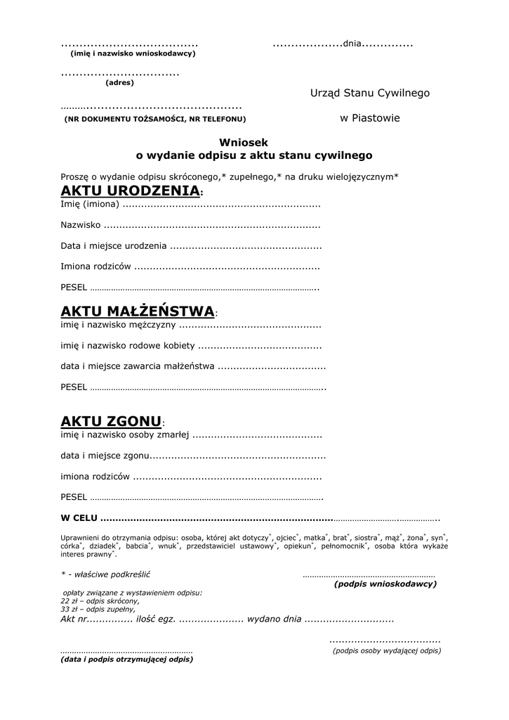 ..................................... ...................dnia.............. (imię i nazwisko wnioskodawcy) ................................ (adres) ……….......................................... Urząd Stanu Cywilnego w Piastowie (NR DOKUMENTU TOŻSAMOŚCI, NR TELEFONU) Wniosek o wydanie odpisu z aktu stanu cywilnego Proszę o wydanie odpisu skróconego,* zupełnego,* na druku wielojęzycznym* AKTU URODZENIA: Imię (imiona) ................................................................ Nazwisko ...................................................................... Data i miejsce urodzenia ................................................. Imiona rodziców ............................................................ PESEL …………………………………………………………………………………….. AKTU MAŁŻEŃSTWA: imię i nazwisko mężczyzny .............................................. imię i nazwisko rodowe kobiety ........................................ data i miejsce zawarcia małżeństwa ................................... PESEL ……………………………………………………………………………………….. AKTU ZGONU: imię i nazwisko osoby zmarłej .......................................... data i miejsce zgonu......................................................... imiona rodziców ............................................................. PESEL ………………………………………………………………………………………. W CELU …………………………………………………………………………………………….…………….. Uprawnieni do otrzymania odpisu: osoba, której akt dotyczy*, ojciec*, matka*, brat*, siostra*, mąż*, żona*, syn*, córka*, dziadek*, babcia*, wnuk*, przedstawiciel ustawowy*, opiekun*, pełnomocnik*, osoba która wykaże interes prawny*. * - właściwe podkreślić ………………………………………………… (podpis wnioskodawcy) opłaty związane z wystawieniem odpisu: 22 zł – odpis skrócony, 33 zł – odpis zupełny, Akt nr............... ilość egz. ..................... wydano dnia ............................. .................................... ………………………………………………… (data i podpis otrzymującej odpis) (podpis osoby wydającej odpis)