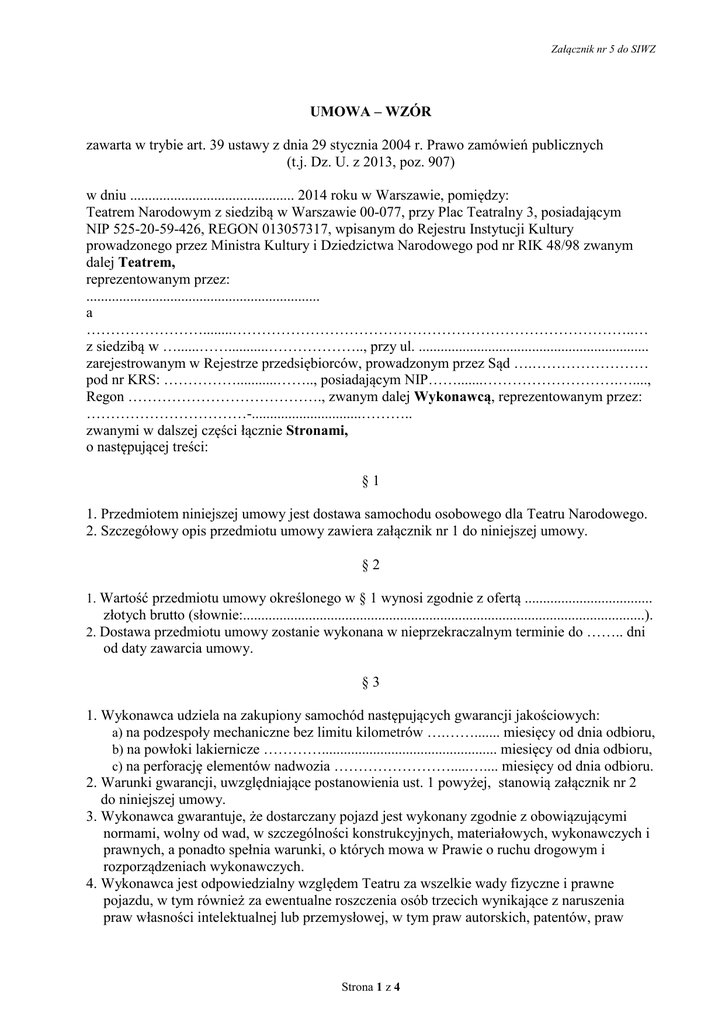 Załącznik nr 5 do SIWZ UMOWA – WZÓR zawarta w trybie art. 39 ustawy z dnia 29 stycznia 2004 r. Prawo zamówień publicznych (t.j. Dz. U. z 2013, poz. 907) w dniu ............................................. 2014 roku w Warszawie, pomiędzy: Teatrem Narodowym z siedzibą w Warszawie 00-077, przy Plac Teatralny 3, posiadającym NIP 525-20-59-426, REGON 013057317, wpisanym do Rejestru Instytucji Kultury prowadzonego przez Ministra Kultury i Dziedzictwa Narodowego pod nr RIK 48/98 zwanym dalej Teatrem, reprezentowanym przez: ................................................................ a ……………………........………………………………………………………………………..… z siedzibą w …......……...........……………….., przy ul. ............................................................... zarejestrowanym w Rejestrze przedsiębiorców, prowadzonym przez Sąd ….…………………… pod nr KRS: ……………...........…….., posiadającym NIP…….......……………………….…...., Regon …………………………………., zwanym dalej Wykonawcą, reprezentowanym przez: ……………………………-..............................……….. zwanymi w dalszej części łącznie Stronami, o następującej treści: §1 1. Przedmiotem niniejszej umowy jest dostawa samochodu osobowego dla Teatru Narodowego. 2. Szczegółowy opis przedmiotu umowy zawiera załącznik nr 1 do niniejszej umowy. §2 1. Wartość przedmiotu umowy określonego w § 1 wynosi zgodnie z ofertą ................................... złotych brutto (słownie:..............................................................................................................). 2. Dostawa przedmiotu umowy zostanie wykonana w nieprzekraczalnym terminie do …….. dni od daty zawarcia umowy. §3 1. Wykonawca udziela na zakupiony samochód następujących gwarancji jakościowych: a) na podzespoły mechaniczne bez limitu kilometrów ….……....... miesięcy od dnia odbioru, b) na powłoki lakiernicze …………................................................ miesięcy od dnia odbioru, c) na perforację elementów nadwozia …………………….....….... miesięcy od dnia odbioru. 2. Warunki gwarancji, uwzględniające postanowienia ust. 1 powyżej, stanowią załącznik nr 2 do niniejszej umowy. 3. Wykonawca gwarantuje, że dostarczany pojazd jest wykonany zgodnie z obowiązującymi normami, wolny od wad, w szczególności konstrukcyjnych, materiałowych, wykonawczych i prawnych, a ponadto spełnia warunki, o których mowa w Prawie o ruchu drogowym i rozporządzeniach wykonawczych. 4. Wykonawca jest odpowiedzialny względem Teatru za wszelkie wady fizyczne i prawne pojazdu, w tym również za ewentualne roszczenia osób trzecich wynikające z naruszenia praw własności intelektualnej lub przemysłowej, w tym praw autorskich, patentów, praw Strona 1 z 4 Załącznik nr 5 do SIWZ ochronnych na znaki towarowe oraz praw z rejestracji na wzory użytkowe i przemysłowe, pozostające w związku z ich wprowadzeniem do obrotu na terytorium Rzeczypospolitej Polskiej. §4 1. Strony ustalają następującą procedurę realizacji dostawy: a) miejsce dostawy: Teatr Narodowy, Warszawa ul. Wierzbowa 3 portiernia C, wjazd od strony ulicy Niecałej, w terminie wcześniej ustalonym pisemnie i zaakceptowanym przez Teatr, b) dostawa zostanie zrealizowana na koszt i ryzyko Wykonawcy. Dzień dostawy pojazdu zostanie uzgodniony pisemnie z Teatrem z min. jednodniowym wyprzedzeniem, c) samochód będzie posiadał kompletną dokumentację, w tym książkę gwarancyjną, instrukcję obsługi w języku polskim, kartę pojazdu, książkę przeglądów okresowych, wyciąg ze świadectwa homologacji, dokumentację techniczną (książki gwarancyjne) urządzeń montowanych dodatkowo, d) Wykonawca odpowiada za bezpieczeństwo dostarczanego pojazdu, aż do momentu protokolarnego przekazania pojazdu w siedzibie Teatru. Wykonawca zobowiązany jest ponadto należycie zabezpieczyć pojazd na czas jego przechowywania i przewozu, e) w przypadku stwierdzenia przy odbiorze przez Teatr niezgodności przedmiotu zamówienia ze specyfikacją, o której mowa w § 1 ust. 2 umowy, a także złej jakości dostarczonego pojazdu, Wykonawca zobowiązany jest do jego wymiany na wolny od wad, zachowując termin dostawy, o którym mowa w § 2 ust. 2, f) odbiór techniczny dostarczonego pojazdu odbędzie się w obecności przedstawicieli obydwu Stron i zakończony zostanie podpisaniem protokołu zdawczo-odbiorczego samochodu bez uwag (załącznik nr 3 do umowy). g) odpowiedzialność za dostarczony samochód przechodzi na Teatr z chwilą podpisania protokołu odbioru zdawczo-odbiorczego samochodu bez uwag. §5 1. Ze strony Wykonawcy osobą odpowiedzialną za realizację umowy będzie ................................................................................................................................................... tel. ........................................................................ 2. Ze strony Teatru osobą odpowiedzialną za realizację umowy będzie .................................................................................................................................................... tel. ........................................................................ §6 1. Podstawę do dokonania płatności za przedmiot zamówienia stanowić będzie faktura VAT, wystawiona przez Wykonawcę na podstawie podpisanego przez obie Strony protokołu, o którym mowa w § 4 ust. 1 lit. f) umowy. 2. Płatność przekazana będzie na konto Wykonawcy wskazane na fakturze, w terminie 14 dni od daty otrzymania przez Zamawiającego prawidłowo wystawionej faktury. 3. Za datę zapłaty należności uważa się datę złożenia przez Teatr polecenia przelewu do banku. Strona 2 z 4 Załącznik nr 5 do SIWZ §7 1. Wykonawca zostanie obciążony przez Teatr karą umowną w przypadku odst