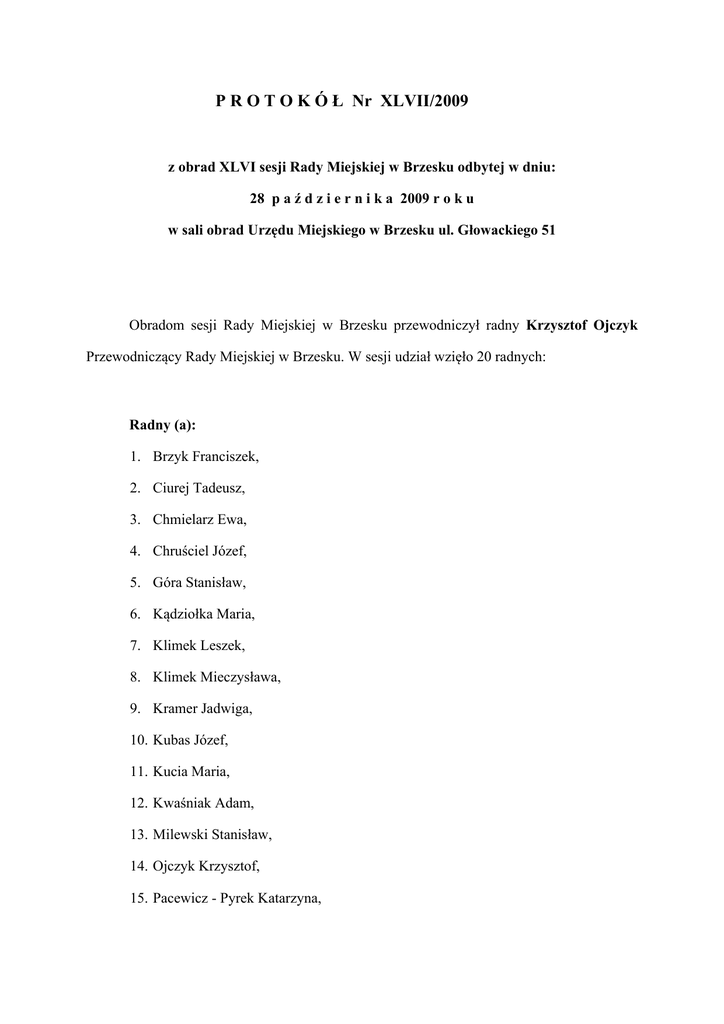 P R O T O K Ó Ł Nr XLVII/2009 z obrad XLVI sesji Rady Miejskiej w Brzesku odbytej w dniu: 28 p a ź d z i e r n i k a 2009 r o k u w sali obrad Urzędu Miejskiego w Brzesku ul. Głowackiego 51 Obradom sesji Rady Miejskiej w Brzesku przewodniczył radny Krzysztof Ojczyk Przewodniczący Rady Miejskiej w Brzesku. W sesji udział wzięło 20 radnych: Radny (a): 1. Brzyk Franciszek, 2. Ciurej Tadeusz, 3. Chmielarz Ewa, 4. Chruściel Józef, 5. Góra Stanisław, 6. Kądziołka Maria, 7. Klimek Leszek, 8. Klimek Mieczysława, 9. Kramer Jadwiga, 10. Kubas Józef, 11. Kucia Maria, 12. Kwaśniak Adam, 13. Milewski Stanisław, 14. Ojczyk Krzysztof, 15. Pacewicz - Pyrek Katarzyna, 2 16. Pasierb Tadeusz, 17. Pikuła Lech, 18. Smołucha Adam, 19. Warzecha Apolonia, 20. Wiśniowski Mirosław. Radni nieobecni usprawiedliwieni : 1. Adamczyk Marek. Ponadto udział w sesji wzięli: 1. Burmistrz Brzeska Grzegorz Wawryka, 2. Zastępca Burmistrza Brzeska Jerzy Tyrkiel, 3. Skarbnik Gminy Celina Łanocha, 4. Sekretarz Gminy Stanisław Sułek, 5. Zaproszeni goście wg załączonej listy obecności. Ad 1. Otwarcie sesji i stwierdzenie prawomocności obrad. Przewodniczący Rady Miejskiej Krzysztof Ojczyk otworzył obrady XLVII sesji Rady Miejskiej w Brzesku. Powitał zebranych na sali obrad Radnych, Panów Burmistrzów, Panią Skarbnik, Pana Sekretarza, Pana Posła Edwarda Czesaka oraz zaproszonych gości i stwierdził, że na stan 21 radnych w obradach sesji uczestniczy 20 radnych, a więc wymagana liczba radnych do podejmowania prawomocnych uchwał. Ad 2. Przedstawienie porządku obrad. 3 Przewodniczący Rady Miejskiej Krzysztof Ojczyk poinformował, że porządek obrad wraz z materiałami został radnym doręczony w ustawowym terminie, w związku z czym zapytał: Czy wszyscy radni otrzymali materiały na dzisiejszą sesję? Uwag nie ma, przewodniczący stwierdził, że materiały zostały prawidłowo doręczone. Następnie przedstawił porządek obrad XLVII sesji Rady Miejskiej w Brzesku. Przewodniczący zapytał czy są wnioski do porządku obrad sesji – uwag i wniosków nie było. Porządek obrad XLVII sesji: 1. Otwarcie sesji i stwierdzenie prawomocności obrad. 2. Przedstawienie porządku obrad. 3. Przyjęcie Protokołu z poprzedniej sesji. 4. Wręczenie stypendiów Burmistrza Brzeska dla uczniów za szczególne osiągnięcia. 5. Interpelacje radnych. 6. Zapytania radnych. 7. Zapytania przewodniczących jednostek pomocniczych Gminy. 8. Zapytania przewodniczącego Młodzieżowej Rady Gminy. 9. Pisemne sprawozdanie Burmistrza z jego działalności za okres od ostatniej sesji. 10. Sprawozdanie Burmistrza z realizacji uchwał Rady Miejskiej za okres od ostatniej sesji. 11. Sprawozdanie z posiedzeń komisji stałych i doraźnych Rady Miejskiej za okres od ostatniej sesji. 12. Informacja Przewodniczącego Rady Miejskiej dotycząca oświadczeń majątkowych osób zobowiązanych do ich złożenia (art. 24 ”h” ust. 12 ustawy o samorządzie gminnym). 13. Informacja Burmistrza Brzeska dotycząca oświadczeń majątkowych osób zobowiązanych do ich złożenia (art. 24 ”h” ust. 12 ustawy o samorządzie gminnym). 14. Ocena stanu dróg gminnych z uwzględnieniem remontów i inwestycji roku bieżącego. 4 15. Ocena stanu sanitarnego i estetycznego miasta Brzeska ze szczególnym uwzględnieniem terenów zielonych. 16. Bieżąca ocena funkcjonowania Spółek MPK i BZK – informacja na temat bieżącej działalności oraz sytuacji finansowej tych Spółek. 17. Informacja o stanie realizacji zadań oświatowych za poprzedni rok szkolny w szkołach prowadzonych przez Gminę Brzesko. 18. Podjęcie uchwał w sprawach: 1) zmiany Uchwały Budżetowej Gminy Brzesko na rok 2009, 2) udzielenia pomocy finansowej Powiatowi Brzeskiemu. 19. Odpowiedzi na interpelacje i zapytania radnych. 20. Odpowiedzi na zapytania przewodniczących jednostek pomocniczych Gminy. 21. Odpowiedzi na zapytania przewodniczącego Młodzieżowej Rady Gminy. 22. Wolne wnioski i zapytania. 23. Zamknięcie obrad sesji. Ad 3. Przyjęcie protokołu z poprzedniej sesji. Przewodniczący Rady Miejskiej Krzysztof Ojczyk poinformował, że protokół z poprzedniej sesji Rady Miejskiej z dnia 7 października 2009 roku był wyłożony do wglądu w Biurze Rady Miejskiej. Nikt z państwa radnych nie wniósł do przedłożonego protokołu uwag. W tym momencie zwrócił się z zapytaniem: Czy są uwagi radnych do protokołu? Uwag nie było, a zatem Przewodniczący wnosi o przyjęcie protokołu z ostatniej sesji. Przewodniczący Rady Miejskiej Krzysztof Ojczyk poddał pod głosowanie przyjęcie protokołu z obrad sesji odbytej w dniu 7 października 2009 roku. Protokół Nr XLVI/2009 z 5 obrad sesji Rady Miejskiej w Brzesku został przyjęty jednogłośnie (18 radnych obecnych podczas głosowania). Ad 4. Wręczenie stypendiów Burmistrza Brzeska dla uczniów za szczególne osiągnięcia. Burmistrz Brzeska Grzegorz Wawryka w imieniu własnym oraz radnych Rady Miejskiej złożył gratulacje wszystkim wyróżnionym uczniom. Pogratulował również rodzicom i podziękował za troskę jaką otaczają swoje dzieci oraz dbają o ich wychowanie. Uważa, że takie uroczyste wręczenie stypendiów jest podkreśleniem zasług tych uczniów. Życzył wszystkim wyróżnionym kolejnych sukcesów w przyszłości. Następuje wręczenie stypendiów przez Burmistrza Brzeska oraz Naczelnika Wydziału Edukacji Józefa Cierniaka poszczególnym uczniom. Stypendia Burmistrza Brzeska otrzymali: 1. Zając Michał; 2. Wojdak Wojciech; 3. Zuzanna Stawiarska; 4. Magdalena Wołek; 5. Monika Klecka; 6. Piotr Put; 7. Jadwiga Legutko; 8. Sara Pytel; 9. Gabriela Ruszaj; 10. Mateusz Leś; 11. Paweł Jemioło; 12. Anna Topolska; 13. Tomasz Mika; 14. Marta Świątek; 6 15. Jakub Ćwik; 16. Klaudia Budzyn; 17. Karolina Płaczek; 18. Radosław Zachara; 19. Karol Podgórski; 20. Marcin Migda; 21. Bożena Bawół; 22. Anna Listwan; 23. Wioleta Obara; Przewodniczący Rady Miejskiej Krzysztof Ojczyk równi