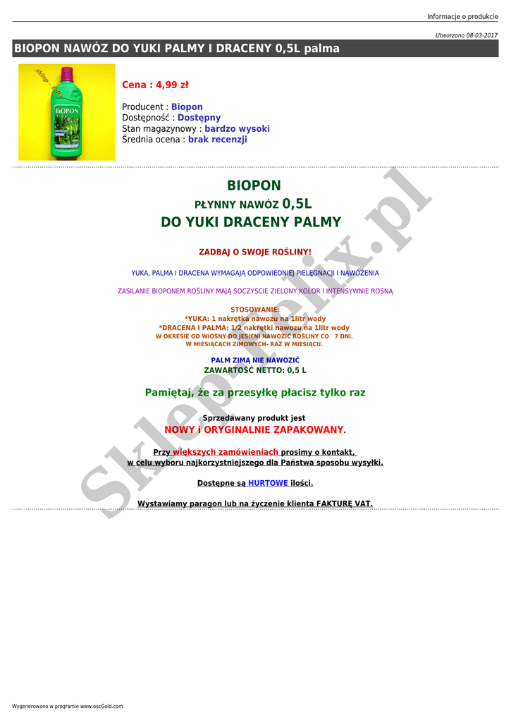 Informacje o produkcie Utworzono 08-03-2017 BIOPON NAWÓZ DO YUKI PALMY I DRACENY 0,5L palma Cena : 4,99 zł Producent : Biopon Dostępność : Dostępny Stan magazynowy : bardzo wysoki Średnia ocena : brak recenzji BIOPON .p l 0,5L DO YUKI DRACENY PALMY PŁYNNY NAWÓZ Fe lix ZADBAJ O SWOJE ROŚLINY! YUKA, PALMA I DRACENA WYMAGAJĄ ODPOWIEDNIEJ PIELĘGNACJI I NAWOŻENIA ZASILANIE BIOPONEM ROŚLINY MAJĄ SOCZYSCIE ZIELONY KOLOR I INTENSYWNIE ROSNĄ STOSOWANIE: *YUKA: 1 nakrętka nawozu na 1litr wody *DRACENA I PALMA: 1/2 nakrętki nawozu na 1litr wody W OKRESIE OD WIOSNY DO JESIENI NAWOZIĆ ROŚLINY CO 7 DNI. W MIESIĄCACH ZIMOWYCH- RAZ W MIESIĄCU. PALM ZIMĄ NIE NAWOZIĆ Sk le p- ZAWARTOŚĆ NETTO: 0,5 L Pamiętaj, że za przesyłkę płacisz tylko raz Sprzedawany produkt jest NOWY i ORYGINALNIE ZAPAKOWANY. Przy większych zamówieniach prosimy o kontakt, w celu wyboru najkorzystniejszego dla Państwa sposobu wysyłki. Dostępne są HURTOWE ilości. Wystawiamy paragon lub na życzenie klienta FAKTURĘ VAT. Wygenerowano w programie www.oscGold.com