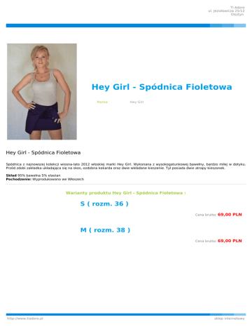 Ti Adoro ul. Jeziołowicza 25/12 Olsztyn Hey Girl - Spódnica Fioletowa Marka: Hey Girl Hey Girl - Spódnica Fioletowa Spódnica z najnowszej kolekcji wiosna-lato 2012 włoskiej marki Hey Girl. Wykonana z wysokogatunkowej bawełny, bardzo miłej w dotyku. Przód zdobi zakładka układająca się na skos, ozdobna kokarda oraz dwie wkładane kieszenie. Tył posiada dwie atrapy kieszonek. Skład 95% bawełna 5% elastan Pochodzenie: Wyprodukowano we Włoszech Warianty produktu Hey Girl - Spódnica Fioletowa : S ( rozm. 36 ) Cena brutto: 69,00 PLN Cena brutto: 69,00 PLN M ( rozm. 38 ) http://www.tiadoro.pl sklep internetowy