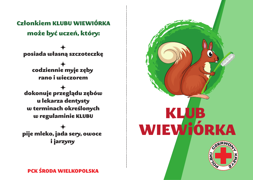 Członkiem KLUBU WIEWIÓRKA może być uczeń, który: posiada własną szczoteczkę codziennie myje zęby rano i wieczorem dokonuje przeglądu zębów u lekarza dentysty w terminach określonych w regulaminie KLUBU pije mleko, jada sery, owoce i jarzyny PCK ŚRODA WIELKOPOLSKA KLUB WIEWiÓRKA LEGITYMACJA CZŁONKOWSKA Imię .......................................................................................................... Nazwisko ........................................................................................ Szkoła ................................................................................................... ............................................................................................................................ ............................................................................................................................