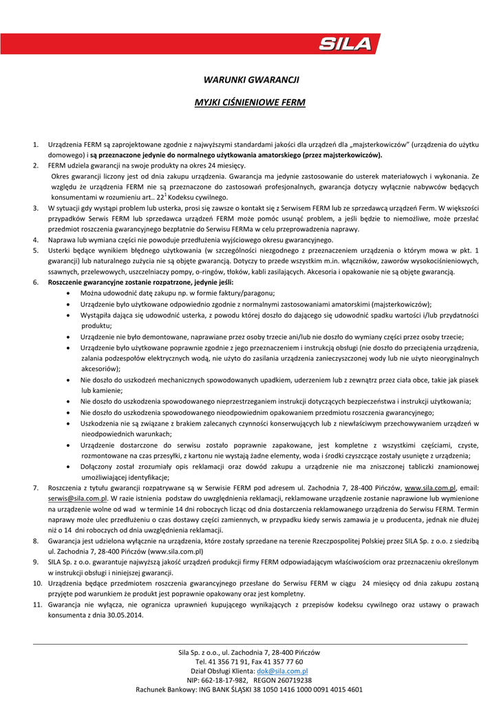 WARUNKI GWARANCJI MYJKI CIŚNIENIOWE FERM 1. Urządzenia FERM są zaprojektowane zgodnie z najwyższymi standardami jakości dla urządzeń dla „majsterkowiczów” (urządzenia do użytku domowego) i są przeznaczone jedynie do normalnego użytkowania amatorskiego (przez majsterkowiczów). 2. FERM udziela gwarancji na swoje produkty na okres 24 miesięcy. Okres gwarancji liczony jest od dnia zakupu urządzenia. Gwarancja ma jedynie zastosowanie do usterek materiałowych i wykonania. Ze względu że urządzenia FERM nie są przeznaczone do zastosowań profesjonalnych, gwarancja dotyczy wyłącznie nabywców będących 1 konsumentami w rozumieniu art.. 22 Kodeksu cywilnego. 3. W sytuacji gdy wystąpi problem lub usterka, prosi się zawsze o kontakt się z Serwisem FERM lub ze sprzedawcą urządzeń Ferm. W większości przypadków Serwis FERM lub sprzedawca urządzeń FERM może pomóc usunąć problem, a jeśli będzie to niemożliwe, może przesłać przedmiot roszczenia gwarancyjnego bezpłatnie do Serwisu FERMa w celu przeprowadzenia naprawy. 4. Naprawa lub wymiana części nie powoduje przedłużenia wyjściowego okresu gwarancyjnego. 5. Usterki będące wynikiem błędnego użytkowania (w szczególności niezgodnego z przeznaczeniem urządzenia o którym mowa w pkt. 1 gwarancji) lub naturalnego zużycia nie są objęte gwarancją. Dotyczy to przede wszystkim m.in. włączników, zaworów wysokociśnieniowych, ssawnych, przelewowych, uszczelniaczy pompy, o-ringów, tłoków, kabli zasilających. Akcesoria i opakowanie nie są objęte gwarancją. 6. Roszczenie gwarancyjne zostanie rozpatrzone, jedynie jeśli: Można udowodnić datę zakupu np. w formie faktury/paragonu; Urządzenie było użytkowane odpowiednio zgodnie z normalnymi zastosowaniami amatorskimi (majsterkowiczów); Wystąpiła dająca się udowodnić usterka, z powodu której doszło do dającego się udowodnić spadku wartości i/lub przydatności produktu; Urządzenie nie było demontowane, naprawiane przez osoby trzecie ani/lub nie doszło do wymiany części przez osoby trzecie; Urządzenie było użytkowane poprawnie zgodnie z jego przeznaczeniem i instrukcją obsługi (nie doszło do przeciążenia urządzenia, zalania podzespołów elektrycznych wodą, nie użyto do zasilania urządzenia zanieczyszczonej wody lub nie użyto nieoryginalnych akcesoriów); Nie doszło do uszkodzeń mechanicznych spowodowanych upadkiem, uderzeniem lub z zewnątrz przez ciała obce, takie jak piasek lub kamienie; Nie doszło do uszkodzenia spowodowanego nieprzestrzeganiem instrukcji dotyczących bezpieczeństwa i instrukcji użytkowania; Nie doszło do uszkodzenia spowodowanego nieodpowiednim opakowaniem przedmiotu roszczenia gwarancyjnego; Uszkodzenia nie są związane z brakiem zalecanych czynności konserwujących lub z niewłaściwym przechowywaniem urządzeń w nieodpowiednich warunkach; Urządzenie dostarczone do serwisu zostało poprawnie zapakowane, jest kompletne z wszystkimi częściami, czyste, rozmontowane na czas przesyłki, z kartonu nie wystają żadne elementy, woda i środki czyszczące zostały usunięte z urządzenia; Dołączony został zrozumiały opis reklamacji oraz dowód zakupu a urządzenie nie ma zniszczonej tabliczki znamionowej umożliwiającej identyfikacje; 7. Roszczenia z tytułu gwarancji rozpatrywane są w Serwisie FERM pod adresem ul. Zachodnia 7, 28-400 Pińczów, www.sila.com.pl, email: [email protected]. W razie istnienia podstaw do uwzględnienia reklamacji, reklamowane urządzenie zostanie naprawione lub wymienione na urządzenie wolne od wad w terminie 14 dni roboczych licząc od dnia dostarczenia reklamowanego urządzenia do Serwisu FERM. Termin naprawy może ulec przedłużeniu o czas dostawy części zamiennych, w przypadku kiedy serwis zamawia je u producenta, jednak nie dłużej niż o 14 dni roboczych od dnia uwzględnienia reklamacji. 8. Gwarancja jest udzielona wyłącznie na urządzenia, które zostały sprzedane na terenie Rzeczpospolitej Polskiej przez SILA Sp. z o.o. z siedzibą ul. Zachodnia 7, 28-400 Pińczów (www.sila.com.pl) 9. SILA Sp. z o.o. gwarantuje najwyższą jakość urządzeń produkcji firmy FERM odpowiadającym właściwościom oraz przeznaczeniu określonym w instrukcji obsługi i niniejszej gwarancji. 10. Urządzenia będące przedmiotem roszczenia gwarancyjnego przesłane do Serwisu FERM w ciągu 24 miesięcy od dnia zakupu zostaną przyjęte pod warunkiem że produkt jest poprawnie opakowany oraz jest kompletny. 11. Gwarancja nie wyłącza, nie ogranicza uprawnień kupującego wynikających z przepisów kodeksu cywilnego oraz ustawy o prawach konsumenta z dnia 30.05.2014. Sila Sp. z o.o., ul. Zachodnia 7, 28-400 Pińczów Tel. 41 356 71 91, Fax 41 357 77 60 Dział Obsługi Klienta: [email protected] NIP: 662-18-17-982, REGON 260719238 Rachunek Bankowy: ING BANK ŚLĄSKI 38 1050 1416 1000 0091 4015 4601