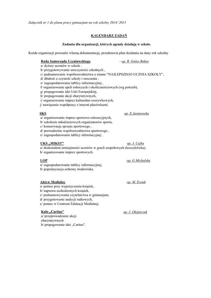 Załącznik nr 1 do planu pracy gimnazjum na rok szkolny 2014/ 2015