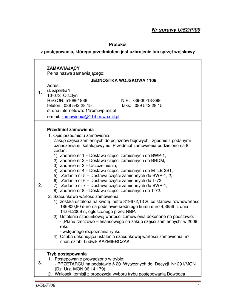 Nr sprawy U/52/P/09 - Biuletyn Informacji Publicznej MON