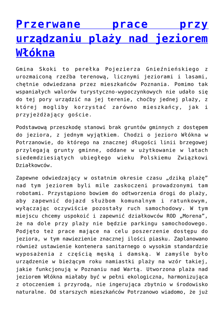 Przerwane prace przy urządzaniu plaży nad jeziorem Włókna Gmina Skoki to perełka Pojezierza Gnieźnieńskiego z urozmaiconą rzeźba terenową, licznymi jeziorami i lasami, chętnie odwiedzana przez mieszkańców Poznania. Pomimo tak wspaniałych walorów turystyczno-wypoczynkowych nie udało się do tej pory urządzić na jej terenie, choćby jednej plaży, z której mogliby korzystać przyjeżdżający goście. zarówno mieszkańcy, jak i Podstawową przeszkodę stanowi brak gruntów gminnych z dostępem do jeziora, z jednym wyjątkiem. Chodzi o jezioro Włókna w Potrzanowie, do którego na znacznej długości linii brzegowej przylegają grunty gminne, oddane w użytkowanie w latach siedemdziesiątych ubiegłego wieku Polskiemu Związkowi Działkowców. Zapewne odwiedzający w ostatnim okresie czasu „dziką plażę” nad tym jeziorem byli mile zaskoczeni prowadzonymi tam robotami. Przystąpiono bowiem do odtworzenia drogi do plaży, aby zapewnić dojazd służbom komunalnym i ratunkowym, wyłączając oczywiście pozostały ruch samochodowy. W tym miejscu chcemy uspokoić i zapewnić działkowców ROD „Morena”, że na dole przy plaży nie będzie parkingu samochodowego. Podjęto też prace mające na celu poszerzenie dostępu do jeziora, w tym nawiezienie znacznej ilości piasku. Zaplanowano również ustawienie kontenera sanitarnego o wysokim standardzie wyposażenia z częścią męską i damską. W zamyśle było urządzenie w bieżącym roku namiastki plaży na wzór takiej, jakie funkcjonują w Poznaniu nad Wartą. Utworzona plaża nad jeziorem Włókna miałaby być w pełni ekologiczna, harmonizująca z otoczeniem i przyrodą, nie ingerująca zbytnio w środowisko naturalne. Od starszych mieszkańców Potrzanowo wiadomo, że już w okresie przedwojennym w czasie wojny, a także w okresie powojennym istniała tu piękna plaża z szerokim dostępem do lustra wody z zejściem schodami od strony pałacu. Może w domowych archiwach naszych mieszkańców zachowały się jeszcze fotografie plaży nad jeziorem Włókna z dawnych lat ? Chętnie je zobaczymy i opublikujemy. Podajemy numer telefonu, pod którym można kontaktować się w tej sprawie: 61 8925-814 lub 815. Niestety rozpoczęte prace nad urządzeniem plaży zostały przerwane pod naciskiem zdecydowanych żądań działkowców ROD „Morena”, którzy zagrozili, w przypadku kontynuacji prac, skierowaniem sprawy na drogę postępowania sądowego. Roboty wykonane dotychczas zostaną zabezpieczone z myślą, że do ich kontynuacji przystąpi się w roku przyszłym, po definitywnym załatwieniu i uporządkowaniu spraw gruntowych. Reakcja działkowców bardzo zaskoczyła urzędników. Na spotkaniu w dniu 3 czerwca br. w Urzędzie Miasta i Gminy w Skokach, pomimo kwestii spornych dotyczących gruntów nad jeziorem Włókna, przedstawiciele ROD Morena i PZD Poznań zapewniali, że nie widzą żadnych przeszkód w prowadzeniu robót zmierzających do urządzenia w tym miejscu plaży. Tymczasem czas pokazał, że od swojej deklaracji odstąpili strasząc urzędników i Gminę Skoki drogą sądową. Czyżby postępowanie Zarządu ROD „Morena” było próbą szantażu, w celu wymuszenia na gminie daleko idących ustępstw w zakresie powierzchni i granic gruntów, jakie mają zostać przekazane w użytkowanie Polskiemu Związkowi Działkowców w ramach tego ogrodu? Na to pytanie odpowiedzi muszą udzielić sobie sami działkowcy. Skąd ten spór? Mieszkańcom gminy Skoki należy się w tej kwestii kilka słów wyjaśnień. Aktualnie na wniosek Polskiego Związku Działkowców przez Burmistrza Miasta i Gminy Skoki prowadzone jest postępowanie w sprawie stwierdzenia nabycia z mocy Ustawy z dnia 13 grudnia 2013 roku o rodzinnych ogrodach działkowych prawa użytkowania gruntów w Potrzanowie – ROD Morena. W toku prowadzonego postępowania zdecydowano o podziale geodezyjnym nieruchomości nr 500/2 w Potrzanowie na dwie odrębne działki. Jedną działkę użytkować będzie nadal ROD Morena. W skład jej gruntów wchodzić będzie teren ogrodzony płotem oraz teren poza ogrodzeniem sięgający do linii brzegowej jeziora na szerokości ok. 150 m wraz z budynkiem hangaru, boiskami i przystanią wodną. Druga działka pozostanie we władaniu Gminy Skoki jako teren ogólnodostępny, bowiem nie ma tutaj żadnej infrastruktury i urządzeń ogrodowych ROD Morena. Są to grunty przylegające do jeziora, z istniejąca „dziką plażą” , półwyspem i całym parkiem przy pałacu. Grunty te mają istotne i strategiczne znaczenie dla Gminy Skoki. Dają możliwość i szansę urządzenia w bliskim terminie plaży nad tym jeziorem oraz zapewniają warunki do rozwoju w niedalekiej przyszłości innych form wypoczynku związanych z jeziorem np. przystań sprzętu wodnego. Członkowie ROD „Morena” nie uznają przeprowadzonego projektu podziału i żądają pozostawienia w granicach ogrodu kilku kolejnych hektarów terenu ogólnego poza ogrodzeniem łącznie z półwyspem. Roszczą sobie oni prawo użytkowania całej nieruchomości z ewentualnym odstępstwem oddania niewielkiej części w miejscu obecnej „dzikiej plaży”. Jak zakończy się prowadzona batalia o plażę i grunty nad jeziorem Włókna, jak zachowają się działkowcy, trudno dziś przewidzieć. Może sami działkowcy i zarząd ogrodu w końcu zrozumieją, że tak niewielka liczba osób gospodarująca na 130 działkach, nie może zawłaszczać tylko pod swoje potrzeby tak pięknych terenów nad jeziorem Włókna. Być może działkowcy zrezygnują dobrowolnie z tych terenów w imię solidarności z miejscowym społeczeństwem. Zbigniew Gronowicz