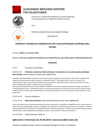 Centrum im. Aleksandra Brücknera i Instytut Slawistyki na Uniwersytecie im. Friedricha Schillera w Jenie oraz Federalny Związek Nauczycieli Języka Polskiego zapraszają na Szkolenie metodyczno-dydaktyczne dla nauczycieli języka polskiego jako obcego Termin: sobota, 27 czerwca 2015 Miejsce: FSU Jena, Institut für Slawistik, Ernst-Abbe-Platz 8, sala 218 (2 piętro, Multimediazentrum) PROGRAM 10:15 Powitanie uczestników 10:30-12:15 Podejście zadaniowe/ukierunkowane na działanie w nauczaniu języka polskiego jako obcego, Marzena Baran (Uniwersytet Jagielloński) Współczesna glottodydaktyka polonistyczna stoi przed nowymi problemami i wyzwaniami. Lektor języka polskiego jako obcego zazwyczaj prowadzi zajęcia w grupach „wielopoziomowych” i heterogenicznych, pracuje z uczącymi się o zróżnicowanym zapleczu kulturowym oraz odmiennych potrzebach i zainteresowaniach. Najnowsze metody nauczania języka polskiego jako obcego są odpowiedzią na te wyzwania. Na warsztatach zaprezentowane zostanie podejście zadaniowe w nauczaniu języka polskiego jako obcego z naciskiem na rozwój kompetencji socjo- i międzykulturowych oraz praktyczne rozwiązania proponowane przez Centrum Języka i Kultury Polskiej w Świecie Uniwersytetu Jagiellońskiego. Warsztaty będą składać się z 45-minutowej prezentacji i godzinnej części praktycznej. 12:15-13:15 Przerwa obiadowa 13:15-15:15 Warsztaty dramowe, Weronika Rodzińska (Uniwersytet Jagielloński) Celem warsztatów jest prezentacja podstawowych technik dramowych ze specjalnym uwzględnieniem ich wykorzystania w nauczaniu języka polskiego jako obcego czy drugiego. Na warsztatach omawiane będą typy ćwiczeń z podziałem zarówno na poziomy językowe jak i sprawności czy podsystemy języka, które mają doskonalić. Finalną częścią spotkania będzie grupowe projektowanie i próba przygotowania własnego ćwiczenia z wykorzystaniem poznanych propozycji. 15:15-15:30 Podsumowanie szkolenia Zgłoszenia i informacje do 25.06.2015: [email protected] Szkolenie uzyskało dotację z funduszu Bundesbeauftragte für Kultur und Medien.
