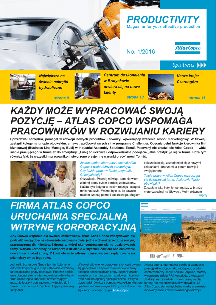 PRODUCTIVITY Magazine for your effective production No. 1/2016 Spis treści Największe na świecie nakrętki hydrauliczne strona 9 Centrum doskonalenia w Bratysławie otwiera się na nowe talenty strona 10 Nasze kraje: Czarnogóra strona 11 KAŻDY MOŻE WYPRACOWAĆ SWOJĄ POZYCJĘ – ATLAS COPCO WSPOMAGA PRACOWNIKÓW W ROZWIJANIU KARIERY Sprzedawał narzędzia, pomagał w rozwoju nowych produktów i stworzył wywierający wrażenie zespół marketingowy. W Szwecji zastąpił kolegę na urlopie ojcowskim, a nawet spróbował swych sił w programie Challenger. Obecnie pełni funkcję kierownika linii biznesowej (Business Line Manager, BLM) w Industrial Assembly Solutions. Tomáš Pasovský nie znudził się Atlas Copco — widzi siebie pracującego w firmie aż do emerytury. „Lubię to uczciwe i odpowiedzialne podejście, jakie praktykuje się w firmie. Poza tym również fakt, że wszystkim pracownikom stworzono przyjemne warunki pracy” mówi Tomáš. Jesteś osobą, która może ocenić Atlas Copco z wielu różnych perspektyw. Czy każda praca w firmie przynosiła Ci satysfakcję? Oczywiście. Prawdę mówiąc, sam nie wiem, z której pracy byłem bardziej zadowolony. Każda była jedyna w swoim rodzaju i czegoś mnie nauczyła. Ważne było to, że zawsze miałem szansę poznać coś nowego. Mogłem dokształcać się, zaznajamiać się z nowymi działaniami i branżami, a potem rozwijać swoją karierę. Twoja praca w Atlas Copco rozpoczęła się dziewięć lat temu. Jakie były Twoje obowiązki? Zacząłem jako inżynier sprzedaży w branży motoryzacyjnej na Słowacji. Moim głównym FIRMA ATLAS COPCO URUCHAMIA SPECJALNĄ WITRYNĘ KORPORACYJNĄ Aby ułatwić wsparcie dla swoich udziałowców, firma Atlas Copco zdecydowała się podzielić swoją obecną stronę internetową na dwie: jedną o charakterze biznesowym, przeznaczoną dla klientów, i drugą, w której skoncentrowano się na udziałowcach firmy. Witryna korporacyjna rozpoczęła działanie w styczniu. Zawiera ona całkowicie nową treść i układ strony. Z kolei otwarcie witryny biznesowej jest zaplanowane na późniejszy okres tego roku. Jednostki biznesowe Grupy, jak i funkcjonalne jednostki korporacyjne mają całkowicie odmienny zakres działań i grupy docelowe. Poprzez podzielenie obecnej strony internetowej na dwie witryny firma Atlas Copco zapewnia odwiedzającym znacznie lepszy i uporządkowany dostęp do informacji oraz funkcji, których szukają w pierwszej kolejności. W nowej witrynie korporacyjnej skoncentrowano się generalnie na społecznym aspekcie firmy: osobach poszukujących pracy, dziennikarzach, inwestorach, organizacjach rządowych i prywatnych oraz na ogólnej opinii publicznej. Witryna przychodzi również z pomocą wszystkim klientom i partnerom biznesowym, którzy chcą dowiedzieć się czegoś więcej o grupie Atlas Copco. „Nowa strona internetowa powinna wzmocnić pozycję Atlas Copco jako wiodącego producenta w branży” mówi Annika Berglund, starszy wiceprezes działu PR i kontaktów z władzami. „Patrząc na zawartość i nowoczesny wygląd strony, nie ma najmniejszej wątpliwości, że Atlas Copco stanowi globalną markę w zakresie innowacyjności i zrównoważonego rozwoju”. Świat Atlas Copco Productivity Magazine 1 / 2016 SPIS TREŚCI Strona tytułowa Cyril Eštok, General Manager 1 Świat Atlas Copco Każdy może wypracować swoją pozycję – – Atlas Copco wspomaga pracowników w rozwijaniu kariery Firma Atlas Copco uruchamia specjalną witrynę korporacyjną Prolog 3 Nowości produktowe Każdy może wypracować swoją pozycję – – Atlas Copco wspomaga pracowników w rozwijaniu kariery Tierp Works na drodze do wprowadzenia montażu LEAN Skupienie na kliencie w segmentach marketingowych PROLOG Szanowni Czytelnicy, Zapraszam do lektury nowego numeru naszego magazynu. Myślę, że pozwoli ona poszerzyć spojrzenie na działalność naszej firmy. W numerze znajdziecie Państwo kilka niekonwencjonalnych rozwiązań, poznacie kolejny obszar świata oraz interesujących ludzi. Krótko mówiąc, dowiecie się Państwo więcej na temat firmy, w której spędzamy większość swojego czasu. Jednym z tematów przewodnich tego numeru jest wspieranie młodych talentów. Przejawia się ona we współpracy ze studentami lub w możliwościach rozwoju kariery, jakie oferujemy naszym kolegom. Na początku tego roku w Centrum Doskonalenia prowadzono kursy dla studentów szkół wyższych. Nasz dział kadr wykonał fantastyczną pracę, dostarczając wielu użytecznych informacji. Wielu studentów piątego roku nie miało wcześniej doświadczenia w ramach praktyk zawodowych. Większość z nich nie wiedziała również zbyt wiele o naszej firmie. Niektórzy byli w stanie powiedzieć, że jesteśmy „międzynarodową firmą produkującą sprężarki”. Atlas Copco kojarzyła im się z dobrą atmosferą pracy i przyjaznym zespołem pracowników. Dobre wrażenie wywarła na nich interesująca praca, możliwości kariery zawodowej i środowisko, które motywuje pracowników do dalszej nauki i samorozwoju. Rozwiązania użytkowników Bardzo się cieszę z tego, jak byliśmy postrzegani w oczach studentów. Koniec końców, są to nasi przyszli współpracownicy, kierownicy i klienci. Ich opinia napełnia mnie optymizmem w kwestii tego, że mamy cel, do którego możemy dążyć. Społeczna odpowiedzialność biznesu Może warto również wysłać tym studentom kopię niniejszego numeru. Po lekturze wywiadu z Tomášem Pasovským przekonaliby się, że ich oczekiwania są jednym z celów naszej firmy. Wspieranie młodych talentów stanowi zatem jeden z naszych priorytetów. Lepszym rozwiązaniem jest samodzielne kształcenie kadry menedżerskiej niż szukanie jej w innym miejscu. Tomáš w swoim wywiadzie opisuje, jak zaczynał swoją karierę jako sprzedawca. Mówi o programach Atlas Copco, w których wziął udział, oraz o drodze, która zaprowadziła go na stanowisko zarządzaj