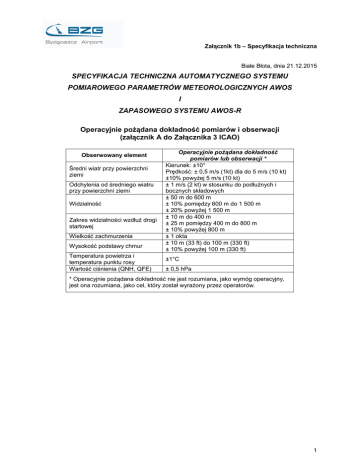 Załącznik 1b – Specyfikacja techniczna Białe Błota, dnia 21.12.2015 SPECYFIKACJA TECHNICZNA AUTOMATYCZNEGO SYSTEMU POMIAROWEGO PARAMETRÓW METEOROLOGICZNYCH AWOS I ZAPASOWEGO SYSTEMU AWOS-R Operacyjnie pożądana dokładność pomiarów i obserwacji (załącznik A do Załącznika 3 ICAO) Obserwowany element Średni wiatr przy powierzchni ziemi Odchylenia od średniego wiatru przy powierzchni ziemi Widzialność Zakres widzialności wzdłuż drogi startowej Wielkość zachmurzenia Wysokość podstawy chmur Temperatura powietrza i temperatura punktu rosy Wartość ciśnienia (QNH, QFE) Operacyjnie pożądana dokładność pomiarów lub obserwacji * Kierunek: ±10° Prędkość: ± 0,5 m/s (1kt) dla do 5 m/s (10 kt) ±10% powyżej 5 m/s (10 kt) ± 1 m/s (2 kt) w stosunku do podłużnych i bocznych składowych ± 50 m do 600 m ± 10% pomiędzy 600 m do 1 500 m ± 20% powyżej 1 500 m ± 10 m do 400 m ± 25 m pomiędzy 400 m do 800 m ± 10% powyżej 800 m ± 1 okta ± 10 m (33 ft) do 100 m (330 ft) ± 10% powyżej 100 m (330 ft) ±1°C ± 0,5 hPa * Operacyjnie pożądana dokładność nie jest rozumiana, jako wymóg operacyjny, jest ona rozumiana, jako cel, który został wyrażony przez operatorów. 1 Załącznik 1b – Specyfikacja techniczna Wartości parametrów czujników meteorologicznych opracowana na podstawie „Podręcznika automatycznych systemów meteorologicznych na lotniskach” (ICAO, dok. nr 9837) Czujnik Temperatura Wilgotność Ciśnienie Zakres Pomiarowy -40 ÷ 60 °C 5 ÷ 100% RH 850 ÷ 1100hPa Rozdzielczość 0.1°C 1% RH 0.1hPa Prędkość Wiatru 0 ÷ 50 m/s 0,1 m/s Kierunek Wiatru 0 ÷ 360° 5° Widzialność wzdłuż drogi startowej RVR 10m ÷ 2000m Widzialność >50 m÷ 10km lub większy Podstawa chmur 0 ÷ 3600 m lub większy 0 – 700 m dla widzialności pionowej ±25m do 400m 400m <±50m ≤ 800m ±100m powyżej 800 m <±50m do 800m 800m <100m ≤ 5km < 1km powyżej 5 km 33 ft poniżej 5000 ft, 100 ft powyżej 5000 ft Okres uśredniania 1minuta 1minuta 1minuta 3 sekundy, 2 minuty, 10 minut 3 sekundy, 2 minuty, 10 minut 1minuta, 10 minut 1minuta 1 minuta, 30 minut 2 1 cd/m lub 10%, którakolwiek wartość jest większa Dostosowany do RVR 0,05mm/h do 999mm/h 0,05mm/h Opad: 1minuta 0 ÷ 56 km, 0 ÷ 360° pierścienie 0 ÷ 9 km, 9 ÷ 19 km, 19 ÷56 km oktant 45° 1 minuta Miernik luminancji tła 2÷40000cd/m Pogoda bieżąca Detektor wyładowań 2 Dodatkowe wymagania dotyczące parametrów technicznych czujników/urządzeń Czujnik Temperatura/wilgotność Ciśnienie Prędkość i kierunek wiatru Widzialność wzdłuż drogi startowej - RVR Podstawa chmur Pogoda bieżąca Opis osłona radiacyjna/klatka meteorologiczna zintegrowane 3 przetworniki ciśnienia dla zwiększenia stabilności pomiaru; możliwość połączenia serwisowego w celu programowej diagnostyki i zmian podstawowych ustawień, osłona/klatka meteorologiczna metoda pomiaru: ultradźwiękowa; kompensacja wpływu temperatury, wilgotności i ciśnienia; system grzewczy; wysokość czujnika: 10m nad gruntem; zabezpieczenie przed ptakami. zintegrowany czujnik jasności tła; uwzględnia natężenie oświetlenia drogi startowej, jeśli włączone graficzna analiza warstw zachmurzenia; system grzewczy; prezentacja analizy danych w formie kodów zgodnych z tabelami WMO nr 4678 i 4680; wykrywanie: opadów marznących (FZ), gradu (GR), krupy śnieżnej (GS), ziaren lodowych/deszczu lodowego (PL) , śniegu (SN), śniegu ziarnistego (SG), deszczu (RA), mżawki (DZ), 2 Załącznik 1b – Specyfikacja techniczna Wymagania dotyczące prezentacji pomiarów i wyników szacowania następujących elementów meteorologicznych Element meteorologiczny Wymagania prezentacji − − Prędkość i kierunek wiatru, wyrażony graficznie różą wiatrów jak i wartością tabelaryczną − − − − − widzialność przeważająca i/lub minimalna; widzialność dla TDZ progu wykorzystywanego do operacji lądowania; kierunkowe zmiany widzialności; jednostki – metry(m). − − − − 1 minutowa średnia RVR; 10 minutowa średnia RVR z tendencją; dla każdego sektora drogi startowej; jednostki– metry (m). − − Widzialność Widzialność wzdłuż drogi startowej - RVR aktualna wartość prędkości i kierunku wiatru; oddzielne prezentacje dla średniej 10 minutowej (kierunek i prędkość, rozrzut kierunków), oraz średniej 2 minutowej (kierunek i prędkość) z rozrzutem kierunków (za 10 minut); minimalna i maksymalna prędkość wiatru za okres ostatnich 10 minut; składowe wiatru, tj. poprzeczna i podłużna wartość wektora prędkości wiatru określona w stosunku do kierunku drogi startowej (średnia prędkość za 2 minuty wykorzystywanej do operacji lądowania); jednostki prędkości węzły (kt, możliwość przełączenia na m/s); przełączenie przez użytkownika kierunku drogi startowej, co powoduje zmianę wykorzystywanych czujników 3 Załącznik 1b – Specyfikacja techniczna − Pogoda bieżąca Wysokość podstawy chmur/widzialność pionowa − − − − − − − − − − − Temperatury powietrza i wilgotność względna − − − Ciśnienie − − − − − wskaźników pogody zgodnie z tabelą WMO 4678 i 4680 (w opcji AUTO); suma opadu w mm; suma opadu z ostatniej minuty ; suma opadu narastająco w czasie 24 godzin; reset wyniku po 24 godzinach; szacowanie natężenia opadu. każdej warstwy chmur; ilości wykrytych warstw – minimum trzy; szacowanie wielkości pokrycia nieba przez poszczególne warstwy dla każdego z ceilometrów oraz reprezentatywnej dla lotniska; widzialności pionowej do wysokości minimum 700 ft; jednostki – stopy (ft, możliwość przełączenia na metry) 0 temperatura powietrza i temperatura punktu rosy ( C) oraz wilgotność względna (%) na wysokości 2 m nad powierzchnią gruntu; temperatura powietrza maksymalna i minimalna za ostatnie 12 godziny; temperatura powietrza na wysokości 5 cm nad powierzchnią gruntu 0 ( C) minimalna temperatura powietrza