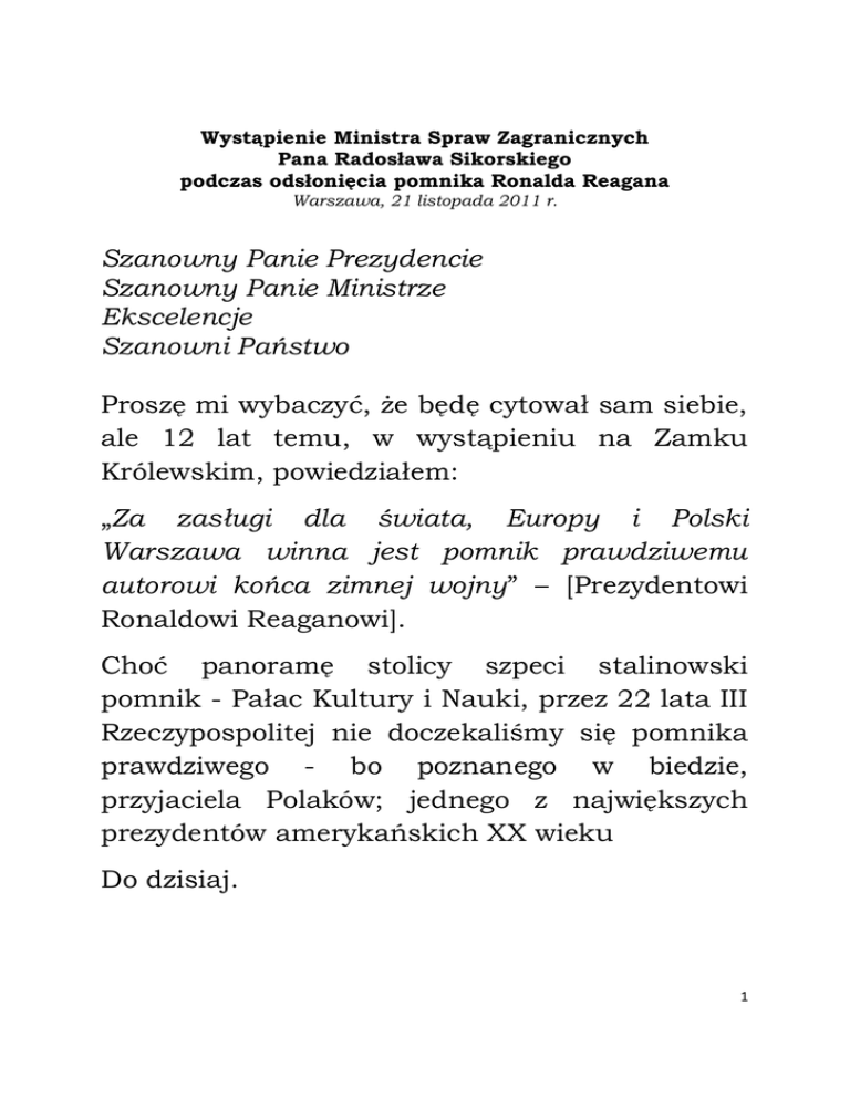 Wystąpienie Ministra Spraw Zagranicznych Pana Radosława Sikorskiego podczas odsłonięcia pomnika Ronalda Reagana Warszawa, 21 listopada 2011 r. Szanowny Panie Prezydencie Szanowny Panie Ministrze Ekscelencje Szanowni Państwo Proszę mi wybaczyć, że będę cytował sam siebie, ale 12 lat temu, w wystąpieniu na Zamku Królewskim, powiedziałem: „Za zasługi dla świata, Europy i Polski Warszawa winna jest pomnik prawdziwemu autorowi końca zimnej wojny” – [Prezydentowi Ronaldowi Reaganowi]. Choć panoramę stolicy szpeci stalinowski pomnik - Pałac Kultury i Nauki, przez 22 lata III Rzeczypospolitej nie doczekaliśmy się pomnika prawdziwego - bo poznanego w biedzie, przyjaciela Polaków; jednego z największych prezydentów amerykańskich XX wieku Do dzisiaj. 1 Nikt w Polsce nie powinien mieć wątpliwości, że ten zaszczyt należał się Prezydentowi Reaganowi. Wśród polityków zachodnich, za wyjątkiem Lady Thatcher, on najlepiej pojmował istotę komunizmu: jako reżimu, który pozbawił ludzi zarówno godnej egzystencji, jak i wolności. Ronald Reagan nazwał ten system po imieniu „imperium zła.” A Polskę uważał za klucz do jego obalenia. W latach 60-tych – w nakręconym przez siebie filmie dokumentalnym – podejmował temat mordu oficerów polskich w Katyniu. Znał historie zrywów wolnościowych Polaków podczas II wojny światowej na tyle, by nie mylić Powstania Warszawskiego z Powstaniem w Getcie Warszawskim. Jako Prezydent, często briefingi zaczynał od pytania: „Co dzieje się dziś w Polsce?” Po wprowadzeniu stanu wojennego Prezydent Reagan zapalił w oknie Białego Domu świeczkę na znak solidarności z naszą „Solidarnością”. 2 Wsparcie niezależnego związku zawodowego stało się dla Reagana na tyle priorytetowe, że czasami określano go mianem „członka ‘Solidarności’ w Białym Domu.” Tylko z 1983 roku istnieje 216 stron z wypowiedziami Reagana na temat Polski. Propaganda PRL wytoczyła przeciwko Reaganowi arsenał epitetów, takich jak: „kowboj”, „trzeciorzędny aktorzyna,” „pogromca kurczaków.” Pisano: „Chce doprowadzić do bankructwa i końca ZSRR, z całą bezczelnością dąży do zmiany ustroju w Europie Wschodniej.” W tym trzeba przyznać komunistom rację: tak, Prezydent Reagan prowadził krucjatę, lecz nie przeciw Polsce, a za tę, jaką dzisiaj mamy niepodległą, szanującą prawa człowieka i wolność gospodarczą. Reagan obiecał wysłać komunizm na śmietnik historii i tej obietnicy dotrzymał. Za to właśnie będzie miał ten pomnik. 3