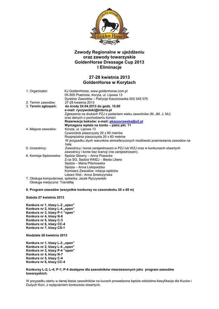 Zawody Regionalne w ujeżdżeniu oraz zawody towarzyskie GoldenHorse Dressage Cup 2013 I Eliminacje 27-28 kwietnia 2013 GoldenHorse w Korytach 1. Organizator: KJ GoldenHorse, www.goldenhorse.com.pl 05-505 Prażmów, Koryta, ul. Lipowa 13 Dyrektor Zawodów – Patrycja Kaczorowska 502 545 575 2. Termin zawodów: 27-28 kwietnia 2013 3. Termin zgłoszeń: do środy 24.04.2013 do godz. 15.00 e-mail: [email protected] Zgłoszenia na drukach PZJ z podaniem wieku zawodnika (M, JM, J, MJ) oraz danych o pochodzeniu konia/i. Rezerwacja boksów: e-mail: [email protected] Wymagana wpłata na konto – patrz pkt. 11 4. Miejsce zawodów: Koryta, ul. Lipowa 13 Czworobok piaszczysty 20 x 60 metrów Rozprężalnia piaszczysta 20 x 60 metrów W przypadku złych warunków atmosferycznych możliwość przeniesienia zawodów na halę 5. Uczestnicy: Zawodnicy i konie zarejestrowani w PZJ lub WZJ oraz w konkursach otwartych zawodnicy i konie bez licencji (nie zarejestrowani). 6. Komisja Sędziowska: Sędzia Główny – Anna Piasecka Z-ca SG, Sędzia WMZJ – Beata Libera Sędzia – Maria Pilichowska Sędzia – Anna Listopadzka Komisarz Zawodów: rotacja sędziów Lekarz Wet.: Anna Smelczyńska 7. Obsługa komputerowa, spikerka: Jacek Ryczywolski Obsługa medyczna: TransMaj 8. Program zawodów (wszystkie konkursy na czworoboku 20 x 60 m) Sobota 27 kwietnia 2013 Konkurs nr 1, klasy L-2 „open” Konkurs nr 2, klasy L-4 „open” Konkurs nr 3, klasy P-1 ”open” Konkurs nr 4, klasy N-6 Konkurs nr 5, klasy C-3 Konkurs nr 6, klasy CC-4 Konkurs nr 7, klasy CS-1 Niedziela 28 kwietnia 2013 Konkurs nr 1, klasy L-2 „open” Konkurs nr 2, klasy L-4 „open” Konkurs nr 3, klasy P-4 ”open” Konkurs nr 4, klasy N-7 Konkurs nr 5, klasy C-4 Konkurs nr 6, klasy CC-4 Konkursy L-2; L-4; P-1; P-4 dostępne dla zawodników niezrzeszonych jako program zawodów towarzyskich. W przypadku startu w danej klasie zawodników na kucach prowadzona będzie oddzielna klasyfikacja dla Kuców i Dużych Koni, z wyłączeniem konkursów otwartych. Szczegółowe godziny rozpoczęcia konkursów sobotnich oraz poszczególnych przejazdów opublikowane będą w czwartek 25.04.2013 ok godziny 20.00 na stronach www.goldehorse.com.pl oraz na fanpage facebook. 9. Zawody rozgrywane zgodnie z Przepisami i Regulaminem PZJ. Zawodników i konie obowiązuje dokumentacja wg regulaminów i przepisów PZJ. Osoby bez licencji (nie zarejestrowane), w konkursach „open”, obowiązują aktualne badania lekarskie, ubezpieczenie NNW oraz w przypadku osób niepełnoletnich zgoda rodziców lub opiekunów prawnych. W przypadku koni w konkursach otwartych wymagany jest paszport z aktualnymi szczepieniami. Zawodnicy w konkursach otwartych mają obowiązek startować w kaskach. Zawodnicy zrzeszeni zgodnie z obowiązującymi przepisami Dyscypliny Ujeżdżenia 2013. 10. Nie przewiduje się odprawy technicznej. Zawodnicy zobowiązani są do przedstawienia dokumentów i wniesienia opłat na minimum godzinę przed rozpoczęciem konkursu. 11. Opłaty: - Wpisowe: 100 PLN / jeden start; 150 PLN / dwa starty za dzień; 180 PLN / jeden start; 250 PLN / 2 starty za 2 dni - Boksy mobilne: 70 PLN/ za dzień; 140 PLN/2 dni; 150 PLN/ 3 dni od piątku do niedzieli (ze słomą, siano własne) . Ilość boksów ograniczona, decyduje kolejność zgłoszeń. Zgłoszenia boksów: e-mail: [email protected] Rezerwacja boksu wyłącznie po wpłacie na konto: AFS M.Kaczorowski 48249000050000450079483351 - zgłoszenia po terminie: 20 PLN - zgodne z Przepisami B PZJ zmiany na listach startowych powinny być wniesione do 30 minut przed rozpoczęciem konkursu. Po tym terminie i w innych przypadkach obowiązuje opłata manipulacyjna w wysokości 20 PLN. 12. Nagrody: Flots dla 25% koni w konkursie, puchary nagrody rzeczowe i finansowe. W najliczniejszym konkursie w niedzielę 28 kwietnia do wygrania paka jeździecka o wartości 800,-. W klasie N i C 28 kwietnia nagrody pieniężne (200;150;50) Ogólna pula nagród: 7000 PLN 13. Noclegi: w przypadku osób startujących 2 dni nocleg w pokoju 3 osobowym 25,-/doba Pokój 2 osobowy z łazienką /100,Pokój 3 osobowy z łazienką /120,- W sobotę wieczorem zapraszamy wszystkich na ognisko. 14. Catering – na terenie zawodów. 15. Organizator nie ponosi odpowiedzialności za kradzieże, wypadki i inne szkody mogące powstać w trakcie zawodów oraz w czasie transportu na i po zawodach. 16. Organizator zastrzega sobie prawo do korekt w programie i propozycjach zawodów. 17. Zawody zatwierdzone przez WMZJ. KODEKS POSTĘPOWANIA ZGODNEGO Z DOBREM KONIA FEI wymaga, od wszystkich osób zaangażowanych w jakikolwiek sposób w międzynarodowy sport jeździecki, przestrzegania Kodeksu Postępowania z Koniem oraz uznania i zaakceptowania zasady, że dobro konia zawsze jest najważniejsze i nigdy nie może być podporządkowane rywalizacji sportowej ani wpływom komercyjnym. 1. Dobro konia jest wartością nadrzędną ponad wszelkimi innymi wymaganiami na wszystkich etapach treningu i przygotowań konia do startu w zawodach. a) Prawidłowe postępowanie z koniem Warunki stajenne, karmienie i trening muszą być zgodne z zasadami prawidłowego postępowania z koniem oraz nie mogą zaburzać jego dobrostanu. Nie będzie tolerowane jakiekolwiek postępowanie, które może spowodować cierpienie fizyczne lub psychiczne konia podczas trwania zawodów lub poza nimi. b) Metody treningowe Konie mogą być poddawane jedynie takiemu treningowi, który odpowiada ich możliwościom fizycznym i poziomowi dojrzałości do danej dyscypliny. Nie mogą być poddawane żadnym metodom szkoleniowym, które są brutalne i powodują strach, lub do których konie nie zostały odpowiednio przygotowane. c) Kucie i sprzęt Dbałość o kopyta i kucie musi spełniać wysokie standardy. Sprzęt musi być tak zaprojektowany i dopasowany, aby uniknąć ryzyka uszkodzenia ciała. d) Transport Podczas transportu konie muszą być w pełni zabezpieczone przed urazami i innymi zagrożeniam