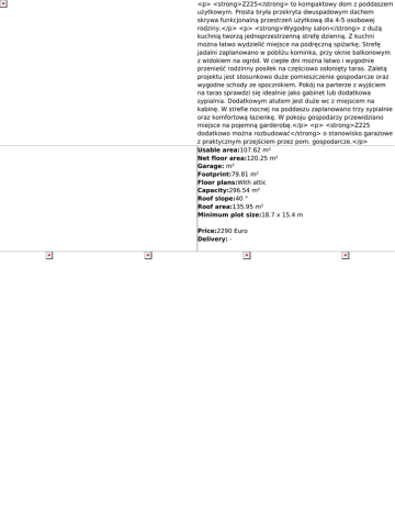 <p> <strong>Z225</strong> to kompaktowy dom z poddaszem użytkowym. Prosta bryła przekryta dwuspadowym dachem skrywa funkcjonalną przestrzeń użytkową dla 4-5 osobowej rodziny.</p> <p> <strong>Wygodny salon</strong> z dużą kuchnią tworzą jednoprzestrzenną strefę dzienną. Z kuchni można łatwo wydzielić miejsce na podręczną spiżarkę. Strefę jadalni zaplanowano w pobliżu kominka, przy oknie balkonowym z widokiem na ogród. W ciepłe dni można łatwo i wygodnie przenieść rodzinny posiłek na częściowo osłonięty taras. Zaletą projektu jest stosunkowo duże pomieszczenie gospodarcze oraz wygodne schody ze spocznikiem. Pokój na parterze z wyjściem na taras sprawdzi się idealnie jako gabinet lub dodatkowa sypialnia. Dodatkowym atutem jest duże wc z miejscem na kabinę. W strefie nocnej na poddaszu zaplanowano trzy sypialnie oraz komfortową łazienkę. W pokoju gospodarzy przewidziano miejsce na pojemną garderobę.</p> <p> <strong>Z225 dodatkowo można rozbudować</strong> o stanowisko garażowe z praktycznym przejściem przez pom. gospodarcze.</p> Usable area:107.62 m² Net floor area:120.25 m² Garage: m² Footprint:79.81 m² Floor plans:With attic Capacity:296.54 m² Roof slope:40 ° Roof area:135.95 m² Minimum plot size:18.7 x 15.4 m Price:2290 Euro Delivery: -