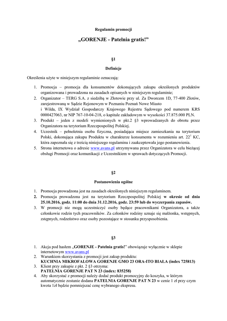 Regulamin promocji „GORENJE - Patelnia gratis!” §1 Definicje Określenia użyte w niniejszym regulaminie oznaczają: 1. Promocja – promocja dla konsumentów dokonujących zakupu określonych produktów organizowana i prowadzona na zasadach opisanych w niniejszym regulaminie; 2. Organizator – TERG S.A. z siedzibą w Złotowie przy ul. Za Dworcem 1D, 77-400 Złotów, zarejestrowaną w Sądzie Rejonowym w Poznaniu Poznań Nowe Miasto i Wilda, IX Wydział Gospodarczy Krajowego Rejestru Sądowego pod numerem KRS 0000427063, nr NIP 767-10-04-218, o kapitale zakładowym w wysokości 37.875.000 PLN. 3. Produkt – jeden z modeli wymienionych w pkt.2 §3 wprowadzanych do obrotu przez Organizatora na terytorium Rzeczpospolitej Polskiej. 4. Uczestnik – pełnoletnia osoba fizyczna, posiadająca miejsce zamieszkania na terytorium Polski, dokonująca zakupu Produktu w charakterze konsumenta w rozumieniu art. 22 1 KC, która zapoznała się z treścią niniejszego regulaminu i zaakceptowała jego postanowienia. 5. Strona internetowa o adresie www.avans.pl utrzymywana przez Organizatora w celu bieżącej obsługi Promocji oraz komunikacji z Uczestnikiem w sprawach dotyczących Promocji. §2 Postanowienia ogólne 1. Promocja prowadzona jest na zasadach określonych niniejszym regulaminem. 2. Promocja prowadzona jest na terytorium Rzeczpospolitej Polskiej w okresie od dnia 25.10.2016, godz. 11:00 do dnia 31.12.2016, godz. 23:59 lub do wyczerpania zapasów. 3. W promocji nie mogą uczestniczyć osoby będące pracownikami Organizatora, a także członkowie rodzin tych pracowników. Za członków rodziny uznaje się małżonka, wstępnych, zstępnych, rodzeństwo oraz osoby pozostające w stosunku przysposobienia. §3 1. Akcja pod hasłem „GORENJE - Patelnia gratis!” obowiązuje wyłącznie w sklepie internetowym www.avans.pl 2. Warunkiem skorzystania z promocji jest zakup produktu: KUCHNIA MIKROFALOWA GORENJE GMO 23 ORA-ITO BIAŁA (index 725813) 3. Klient przy zakupie z pkt. 2 §3 otrzyma: PATELNIA GORENJE PAT N 23 (index: 835258) 4. Aby skorzystać z promocji należy dodać produkt promocyjny do koszyka, w którym automatycznie zostanie dodana PATELNIA GORENJE PAT N 23 w cenie 1 zł przy czym kwota 1zł będzie pomniejszać cenę wybranego ekspresu. 5. W przypadku zwrotu zakupionego produktu, zwrotowi podlega również produkt gratisowy, otrzymany wraz z produktem głównym. 6. W przypadku zakupu na raty w okresie obowiązywania akcji warunkiem skorzystania z aktualnych promocji ratalnych jest indywidualna ocena zdolności kredytowej Klienta przez bank. W przypadku negatywnej odpowiedzi banku na wniosek kredytowy Klienta zostaną zaproponowane inne alternatywne formy płatności. (Wysokość rat zaprezentowanych w akcji nie zawiera ubezpieczenia. RRSO dla kredytu w opcji bez ubezpieczenia wynosi 0%. Minimalna wartość brutto towaru nabywanego w systemie ratalnym wynosi 100zł. Ubezpieczenie spłaty kredytu ma charakter dobrowolny i stanowi zabezpieczenie pożyczki/kredytu w momencie zgody Klienta na zawarcie umowy ubezpieczenia kredytu. Stopa procentowa dla kredytu 0% w zakresie od 3 do 40 miesięcy wynosi od 0% do 32,6% w zależności od wybranego banku i rodzaju ubezpieczenia.) 7. Materiały reklamowe zaprezentowane na stronie www.avans.pl nie stanowią oferty w rozumieniu art.66§ 1K.C §4 Reklamacje 1. Reklamacje związane z Promocją mogą być zgłaszane mailowo na stronie: http://www.avans.pl/s,zanim_zlozysz , przez cały czas trwania promocji, jednak nie później niż w terminie 21 dni od dnia jej zakończenia. 2. Reklamacje spóźnione nie będą rozpatrywane. Organizator rozpatruje reklamacje oraz przekazuje informacje zainteresowanemu w terminie do 14 (czternastu) dni od daty wpłynięcia reklamacji. Za przekazanie odpowiedzi na reklamację w terminie 14 uznaje się wysłanie listu poleconego w tym terminie. §5 Ochrona danych osobowych 1. Administratorem danych osobowych jest Organizator. 2. Dane osobowe Uczestników przetwarzane będą przy zachowaniu zasad określonych w ustawie z dnia 29 sierpnia 1997 r. o ochronie danych osobowych (Dz. U. 2002 Nr 101 poz. 926 z póź. zm.) w celu przeprowadzenia Promocji i wyłonienia osób nagrodzonych. Podanie danych osobowych jest dobrowolne, jednak jest niezbędne w celu wzięcia udziału w Promocji, przyznania i odbioru nagród i prezentów. Uczestnikowi przysługuje prawo wglądu do danych osobowych, ich poprawiania oraz żądania ich usunięcia. 3. Przetwarzanie danych osobowych obejmować będzie zakres danych wskazanych w formularzu rejestracyjnym. Za odrębną zgodą Uczestnika wyrażoną w zgłoszeniu Organizatorowi przysługiwać będzie prawo do przetwarzania danych osobowych w celach marketingowych oraz prawo przesyłania informacji handlowej drogą elektroniczną. 4. Uczestnik jest zobowiązany do informowania Organizatora na piśmie o każdej zmianie w zakresie danych osobowych. Niezależnie od innych postanowień niniejszego regulaminu, w przypadku nie dokonania aktualizacji danych osobowych przez Uczestnika Organizator nie ponosi odpowiedzialności za opóźnienie lub brak działania spowodowany brakiem takiej aktualizacji, a w szczególności za niemożność wydania nagrody w konkursie lub prezentu. §7 Postanowienia końcowe 1. Regulamin wchodzi w życie z dniem 25.10.2016 i będzie dostępny w okresie trwania Promocji w siedzibie Organizatora oraz na karcie produktu pod emblematem promocji. 2. Tytuły poszczególnych punktów regulaminu mają charakter informacyjny i nie stanowią części regulaminu. 3. We wszystkich sprawach dotyczących Promocji, a nieuregulowanych regulaminem mają zastosowanie przepisy prawa polskiego. 4. Niniejsza Promocja nie jest grą losową ani zakładem wzajemnym, których wynik zależy od przypadku (przeprowadzenie losowania) w rozumieniu art. 2 ustawy z dnia 19 listopada 2009 roku o grach hazardowych (Dz. U. Nr 201 poz. 1540).