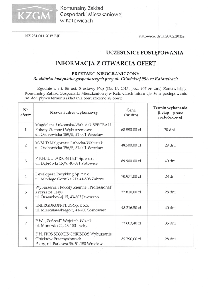 Komurnlny Zaklad Gospodarki Mieszkaniowej w Katowicach informuje 2e w postgpowaniu