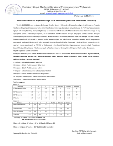 Powiatowy Zespół Placówek Oświatowo-Wychowawczych w Wejherowie 84-200 Wejherowo, ul 3 Maja 49 Tel/Fax (058) 672 45 92 e-mail: [email protected] , [email protected] Wejherowo 11.05.2016 r. Mistrzostwa Powiatu Wejherowskiego Szkół Podstawowych w Mini Piłce Nożnej Dziewcząt W dniu 11.05.2016 roku na boisku Gminnego Ośrodka Sportu i Rekreacji w Choczewie, odbyły się Mistrzostwa Powiatu Wejherowskiego Szkół Podstawowych w Mini Piłce Nożnej Dziewcząt. Zawody te były eliminacją do Półfinału Wojewódzkich Igrzysk Młodzieży Szkolnej, który odbędzie się w Gościcinie. Były to czwarte Mistrzostwa Powiatu Wejherowskiego w tej dyscyplinie sportu. Frekwencja dopisała, bo w zawodach wzięło udział 8 drużyn. Zwycięzcą turnieju została drużyna Samorządowej Szkoły Podstawowej z Gościcina, która w meczu finałowym pokonała ekipę z Luzina po rzutach karnych. Poziom rywalizacji był wysoki, a mecze bardzo emocjonujące Na zakończenie zawodów zespoły zostały nagrodzone pucharami, medalami i dyplomami, które wręczali: Dyrektor Zespołu Szkół w Choczewie – Andrzej Soboń oraz referent ds. sportu i imprez sportowych w PZPOW w Wejherowie – Bartłomiej Woźniak. Organizatorami zawodów byli: Powiatowy Zespół Placówek Oświatowo - Wychowawczych w Wejherowie oraz Gminny Ośrodek Sportu i Rekreacji w Choczewie . Wyniki uzyskane w dniu zawodów: I miejsce – Samorządowa Szkoła Podstawowa w Gościcinie (Joanna Bobkowska, Wiktoria Czernowałów, Agata Gebhardt, Monika Kandzorra, Natalia Klas, Wiktoria Motycka, Oliwia Potrykus, Maja Puzdrowska, Agata Syska, Daria Zelewska, opiekun drużyny – Mariusz Nagórski ) II miejsce – Szkoła Podstawowa w Luzinie III miejsce – Szkoła Podstawowa nr 10 w Rumi IV miejsce – Szkoła Podstawowa w Łebnie V miejsce – Szkoła Podstawowa w Bożympolu Wielkim VI miejsce – Szkoła Podstawowa nr 6 w Wejherowie VII miejsce – Samorządowa Szkoła Podstawowa w Gniewinie VIII miejsce - Szkoła Podstawowa w Choczewie Tabela rozgrywek: Grupa A Drużyna SP Bożepole Wielkie 1 x 2 0:0 3 2:0 4 0:1 Punkty 4 Bramki 2-1 Miejsce III SSP Gościcino 0:0 x 4:1 0:0 5 4-1 II SSP Gniewino 0:2 1:4 x 0:5 0 1-11 IV SP Luzino 1:0 0:0 5:0 x 7 6-0 I Grupa B Drużyna SP nr 6 Wejherowo 1 x 2 1:0 3 0:2 4 2:2 Punkty 4 Bramki 3-4 Miejsce III SP Choczewo 0:1 x 0:1 1:1 1 1-3 IV SP nr 10 Rumia 2:0 1:0 x 0:2 6 3-2 I SP Łebno 2:2 1:1 2:0 x 5 5-3 II Półfinały: SP Luzino – SP Łebno 0:0 karne 2:0 SSP Gościcino – SP nr 10 Rumia 2:1 Mecz o III miejsce: SP Łebno – SP nr 10 Rumia 0:0 karne 0:1 Mecz o I miejsce: SP Luzino – SSP Gościcino 0:0 karne 1:3 Sporządził: Bartłomiej Woźniak Dyrektor PZPOW w Wejherowie Andrzej Byczkowski