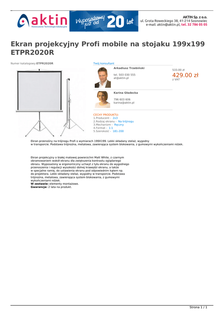 Ekran projekcyjny Profi mobile na stojaku 199x199 ETPR2020R Numer katalogowy:ETPR2020R Twój konsultant Arkadiusz Trzebiński tel. 503 030 555 [email protected] NOWOŚĆ W OFERCIE 533.00 zł 429.00 zł z VAT Karina Gładecka 796 603 606 [email protected] CECHY PRODUKTU: 1.Producent - 2x3 2.Rodzaj ekranu - Na trójnogu 3.Mechanizm - Ręczny 4.Format - 1:1 5.Szerokość - 181-200 Ekran przenośny na trójnogu Profi o wymiarach 199X199. Lekki składany stelaż, wygodny w transporcie. Podstawa trójnożna, metalowa, zawierająca system blokowania, z gumowymi wykończeniami nóżek. Ekran projekcyjny o białej matowej powierzchni Matt White, z czarnym obramowaniem wokół ekranu dla zwiększenia kontrastu oglądanego obrazu. Wyposażony w ergonomiczny uchwyt z tyłu ekranu do wygodnego przenoszenia i regulacji wysokości dolnej krawędzi ekranu, a także w specjalne ramię, do ustawienia ekranu pod odpowiednim kątem np. do projektora. Lekki składany stelaż, wygodny w transporcie. Podstawa trójnożna, metalowa, zawierająca system blokowania, z gumowymi wykończeniami nóżek. W zestawie: elementy montażowe. Gwarancja: 2 lata na produkt. Strona 1 / 1 Powered by TCPDF (www.tcpdf.org)