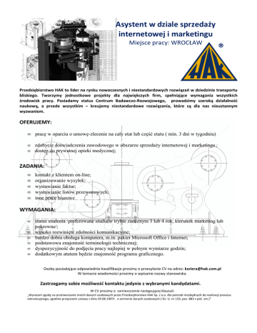 Asystent w dziale sprzedaży internetowej i marketingu Miejsce pracy: WROCŁAW Przedsiębiorstwo HAK to lider na rynku nowoczesnych i niestandardowych rozwiązań w dziedzinie transportu bliskiego. Tworzymy jednostkowe projekty dla największych firm, spełniające wymagania wszystkich środowisk pracy. Posiadamy status Centrum Badawczo-Rozwojowego, prowadzimy szeroką działalność naukową, a przede wszystkim – kreujemy niestandardowe rozwiązania, które są dla nas nieustannym wyzwaniem. OFERUJEMY: • pracę w oparciu o umowę-zlecenie na cały etat lub część etatu ( min. 3 dni w tygodniu) • • zdobycie doświadczenia zawodowego w obszarze sprzedaży internetowej i marketingu ; dostęp do prywatnej opieki medycznej; ZADANIA: • • • • • kontakt z klientem on-line; organizowanie wysyłek; wystawianie faktur; wystawianie listów przewozowych; inne prace biurowe WYMAGANIA: • • • • • • status studenta /preferowane studia w trybie zaocznym 3 lub 4 rok, kierunek marketing lub pokrewne/; wysoko rozwinięte zdolności komunikacyjne; bardzo dobra obsługa komputera, m.in. pakiet Microsoft Office i Internet; podstawowa znajomość terminologii technicznej; dyspozycyjność do podjęcia pracy najlepiej w pełnym wymiarze godzin; dodatkowym atutem będzie znajomość programu graficznego. Osoby posiadające odpowiednie kwalifikacje prosimy o przesyłanie CV na adres: [email protected] W temacie wiadomości prosimy o wpisanie nazwy stanowiska. Zastrzegamy sobie możliwość kontaktu jedynie z wybranymi kandydatami. W CV prosimy o zamieszczenie następującej klauzuli: „Wyrażam zgodę na przetwarzanie moich danych osobowych przez Przedsiębiorstwo HAK Sp. z o.o. dla potrzeb niezbędnych do realizacji procesu rekrutacyjnego, zgodnie przepisami ustawy z dnia 29.08.1997r. o ochronie danych osobowych ( Dz. U. nr 133, poz. 883 z póź. zm.)”