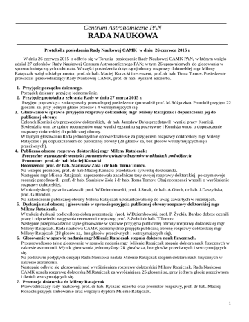 Centrum Astronomiczne PAN RADA NAUKOWA Protokół z posiedzenia Rady Naukowej CAMK w dniu 26 czerwca 2015 r W dniu 26 czerwca 2015 r odbyło się w Toruniu posiedzenie Rady Naukowej CAMK PAN, w którym wzięło udział 27 członków Rady Naukowej Centrum Astronomicznego PAN; w tym 26 uprawnionych do głosowania w sprawach dotyczących doktoratu. W części posiedzenia dotyczącej obrony rozprawy doktorskiej mgr Mileny Ratajczak wziął udział promotor, prof. dr hab. Maciej Konacki i recenzent, prof. dr hab. Toma Tomov. Posiedzenie prowadził przewodniczący Rady Naukowej CAMK, prof. dr hab. Ryszard Szczerba. 1. Przyjęcie porządku dziennego. Porządek dzienny przyjęto jednomyślnie. 2. Przyjęcie protokołu z zebrania Rady w dniu 27 marca 2015 r. Przyjęto poprawkę – zmianę osoby prowadzącej posiedzenie (prowadził prof. M.Różyczka). Protokół przyjęto 22 głosami za, przy jednym głosie przeciw i 4 wstrzymujących się. 3. Głosowanie w sprawie przyjęcia rozprawy doktorskiej mgr Mileny Ratajczak i dopuszczenia jej do publicznej obrony. Członek Komisji d/s przewodów doktorskich, dr hab. Jarosław Dyks przedstawił wyniki pracy Komisji. Stwierdziła ona, że opinie recenzentów oraz wyniki egzaminu są pozytywne i Komisja wnosi o dopuszczenie rozprawy doktorskiej do publicznej obrony. W tajnym głosowaniu Rada jednomyślnie opowiedziała się za przyjęciem rozprawy doktorskiej mgr Mileny Ratajczak i jej dopuszczeniem do publicznej obrony (28 głosów za, bez głosów wstrzymujących się i przeciwnych). 4. Publiczna obrona rozprawy doktorskiej mgr Mileny Ratajczak: Precyzyjne wyznaczanie wartości parametrów gwiazd-olbrzymów w układach podwójnych Promotor: prof. dr hab Maciej Konacki Recenzenci: prof. dr hab. Stanisław Zoła i dr hab. Toma Tomov. Na wstępie promotor, prof. dr hab Maciej Konacki przedstawił sylwetkę doktorantki. Następnie mgr Milena Ratajczak zaprezentowała zasadnicze tezy swojej rozprawy doktorskiej, po czym swoje recenzje przedstawili prof. dr hab. Stanisław Zoła i dr hab. Toma Tomov. Obaj recenzenci wnosili o wyróżnienie rozprawy doktorskiej. W toku dyskusji pytania zadawali: prof. W.Dziembowski, prof. J.Smak, dr hab. A.Olech, dr hab. J.Daszyńska, prof. G.Handler, Na zakończenie publicznej obrony Milena Ratajczak ustosunkowała się do uwag zawartych w recenzjach. 5. Dyskusja nad obroną i głosowanie w sprawie przyjęcia publicznej obrony rozprawy doktorskiej mgr Mileny Ratajczak. W trakcie dyskusji podkreślono dobrą prezentację (prof. W.Dziembowski, prof. P. Życki). Bardzo dobrze ocenili pracę i odpowiedzi na pytania recenzenci rozprawy, prof. S.Zoła i dr hab. T.Tomov. Następnie przeprowadzono tajne głosowanie w sprawie przyjęcia publicznej obrony rozprawy doktorskiej mgr Mileny Ratajczak. Rada naukowa CAMK jednomyślnie przyjęła publiczną obronę rozprawy doktorskiej mgr Mileny Ratajczak (28 głosów za, bez głosów przeciwnych i wstrzymujących się). 6. Głosowanie w sprawie nadania mgr Milenie Ratajczak stopnia doktora nauk fizycznych. Przeprowadzono tajne głosowanie w sprawie nadania mgr Milenie Ratajczak stopnia doktora nauk fizycznych w zakresie astronomii. Wynik głosowania jednomyślny: 28 głosów za, bez głosów przeciwnych i wstrzymujących się. Na podstawie podjętych decyzji Rada Naukowa nadała Milenie Ratajczak stopień doktora nauk fizycznych w zakresie astronomii. Następnie odbyło się głosowanie nad wyróżnieniem rozprawy doktorskiej Mileny Ratajczak. Rada Naukowa CAMK uznała rozprawę doktorską M.Ratajczak za wyróżniającą 25 głosami za, przy jednym głosie przeciwnym i dwóch wstrzymujących się. 7. Promocja doktorska dr Mileny Ratajczak Przewodniczący rady naukowej, prof. dr hab. Ryszard Sczerba oraz promotor rozprawy, prof. dr hab. Maciej Konacki przyjęli ślubowanie oraz wręczyli dyplom Milenie Ratajczak. 1 8. Zmiany w Regulaminie konkursów na stanowiska naukowe Przed posiedzeniem członkowie rady otrzymali tekst regulaminu konkursów z proponowanymi zmianami. Przegłosowano zmianę określającą długość kadencji na 2 lata (za -20 głosów, przeciw -2, wstrzymujących się – 3). Całość regulaminu z poprawkami uchwalono 20 głosami za, przy 6 głosach wstrzymujących się, bez sprzeciwu. 9. Wybór Komisji ds konkursów na stanowiska naukowe Do komisji ds konkursów zaproponowano siedem osób. W tajnym głosowaniu otrzymały one następującą liczbę głosów: dr hab. M.Chodorowski (25 za, 1 wstrzymujący się, 0 – przeciw), dr hab. J.Daszyńska (25 za, 0 wstrzymujących się, 1 – przeciw), prof. J.P. Lasota (24 za, 0 wstrzymujących się, 2 – przeciw), dr hab. A.Olech (25 za, 1 wstrzymujący się, 0 – przeciw), prof. B.Rudak (26 za, 0 wstrzymujących się, 0 – przeciw), prof. M.Sarna (24 za, 2 wstrzymujące się, 0 – przeciw), prof. A.Sołtan (25 za, 0 wstrzymujących się, 1 – przeciw). Komisja została więc wybrana w zaproponowanym składzie. 10.Rozstrzygnięcie konkursu na stanowiska post-doktoralne finansowane z grantu prof. W.Kluźniaka i zaopiniowanie zamiaru dyrektora w sprawie zatrudnienia na stanowisku adiunkta w CAMK. Członek komisji ds konkursu, prof. R.Moderski, przedstawił protokołu komisji w dwóch konkursach finansowanych z grantu prof. W.Kluźniaka. W konkursie na stanowisko adiunkta w dziedzinie symulacji magnetohydrodynamicznych komisja rekomenduje zatrudnienie dr Miljenko Cemeljica, a w konkursie na stanowisko adiunkta w dziedzinie symulacji hydrodynamicznych (na pół etatu) zatrudnienie dr Artura Gawryszczaka. Dyrektor CAMK, prof. P.Życki przedstawił zamiar zatrudnienia tych osób na 2 lata zgodnie z rekomendacją komisji. Rada naukowa w tajnym głosowaniu poparła zamiar dyrektora, w przypadku M.Cemeljica jednogłośnie (27 głosów za) a w przypadku A.Gawryszczaka 25 głosami za, przy 2 wstrzymujących się (bez sprzeciwu). 11. Zatwierdzenie wykonania planu finansowo-zadaniowego za rok 2014 r i przyjęcie planu na rok 2015 Dyrektor