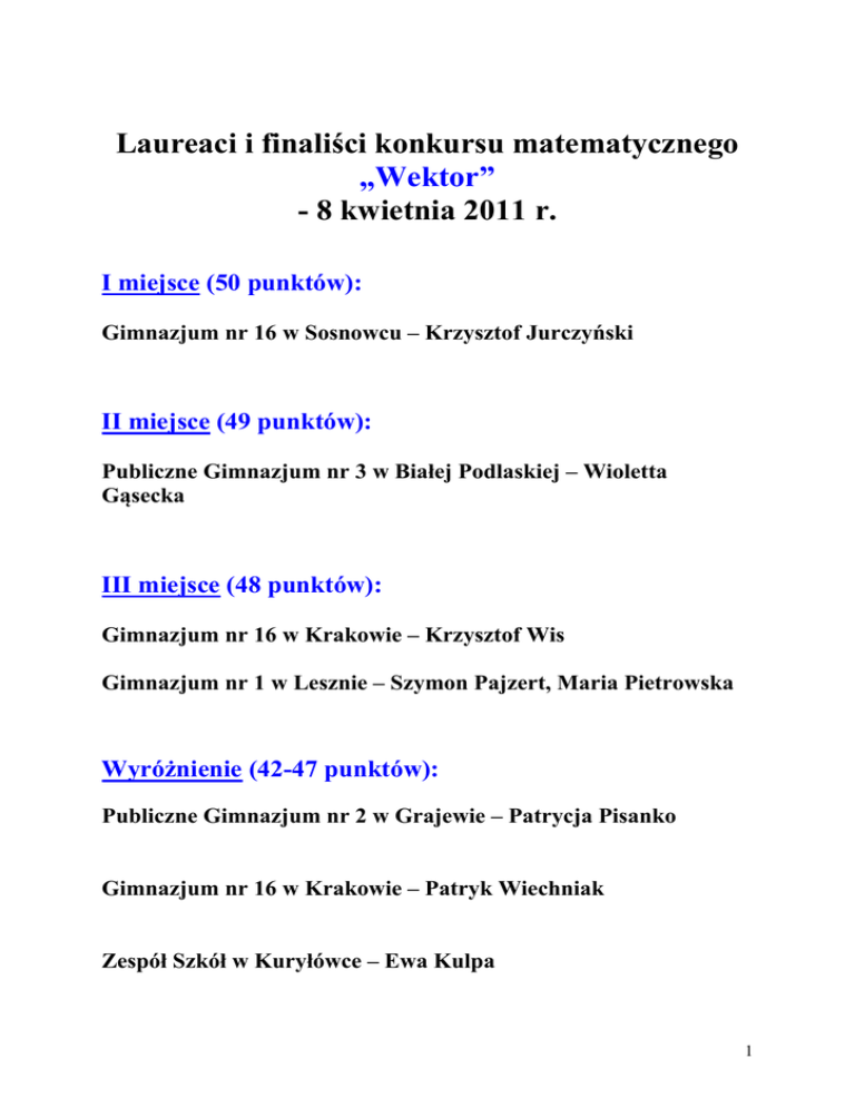 Laureaci i finaliści konkursu matematycznego „Wektor” - 8 kwietnia 2011 r. I miejsce (50 punktów): Gimnazjum nr 16 w Sosnowcu – Krzysztof Jurczyński II miejsce (49 punktów): Publiczne Gimnazjum nr 3 w Białej Podlaskiej – Wioletta Gąsecka III miejsce (48 punktów): Gimnazjum nr 16 w Krakowie – Krzysztof Wis Gimnazjum nr 1 w Lesznie – Szymon Pajzert, Maria Pietrowska Wyróżnienie (42-47 punktów): Publiczne Gimnazjum nr 2 w Grajewie – Patrycja Pisanko Gimnazjum nr 16 w Krakowie – Patryk Wiechniak Zespół Szkół w Kuryłówce – Ewa Kulpa 1 Publiczne Gimnazjum nr 3 w Białej Podlaskiej – Jakub Lipka Publiczne Gimnazjum nr 3 w Białymstoku – Marek Harasimczuk Zespół Szkół nr 23 w Bydgoszczy – Jarosław Biedowicz Gimnazjum we Florynce – Mariusz Karwala Gimnazjum w Goleszowie – Piotr Gajdzica Gimnazjum nr 9 w Gorzowie Wlkp. – Jakub Dzitkowski Publiczne Gimnazjum w Janowie Lubelskim – Piotr Golec Gimnazjum nr 1 w Jarocinie – Katarzyna Jóźwiak Miejskie Gimnazjum nr 1 w Dębicy – Natalia Kowalów, Przemysław Szymaszek Gimnazjum nr 9 w Gorzowie Wlkp. – Piotr Kosowski Gimnazjum nr 16 w Krakowie – Anna Anioł, Paweł Grochola Gimnazjum w Marklowicach - Radosław Marszolik Gimnazjum nr 4 w Myszkowie – Kamil Jastrząbek 2 Gimnazjum nr 1 w Ostródzie – Daniel Kostrzewa Gimnazjum nr 16 w Sosnowcu – Marcel Rychlewski Gimnazjum nr 4 w Legionowie – Magdalena Deptuła, Mateusz Przygoda Gimnazjum nr 1 w Lesznie – Maciej Biernaczyk, Krzysztof Marczyński Gimnazjum nr 4 im. ks. prof. J. Tischnera w Mszanie Górnej – Paweł Mucha Gimnazjum Publiczne w Niwiskach – Dawid Saj Zespół Szkół w Nozdrzcu – Wiktor Socha Gimnazjum nr 1 w Ostródzie – Łukasz Czerniak Publiczne Gimnazjum nr 3 w Radomiu – Paweł Plaskota Gimnazjum nr 16 w Sosnowcu – Monika Mączka Gimnazjum nr 1 w Lesznie – Grzegorz Łukaszczuk Miejskie Gimnazjum nr 2 w Oświęcimiu – Marcin Kaszuba 3 Gimnazjum nr 4 z Oddziałami Dwujęzycznymi w Lesznie – Szymon Karolewicz 4