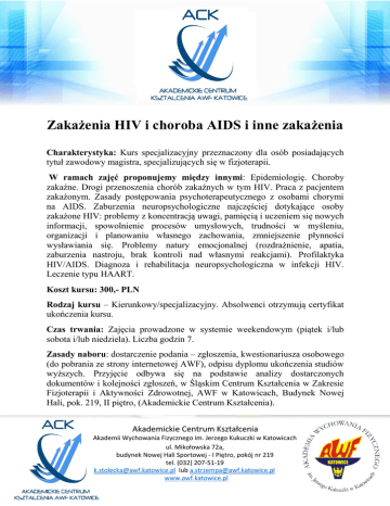 Zakażenia HIV i choroba AIDS i inne zakażenia Charakterystyka: Kurs specjalizacyjny przeznaczony dla osób posiadających tytuł zawodowy magistra, specjalizujących się w fizjoterapii. W ramach zajęć proponujemy między innymi: Epidemiologię. Choroby zakaźne. Drogi przenoszenia chorób zakaźnych w tym HIV. Praca z pacjentem zakażonym. Zasady postępowania psychoterapeutycznego z osobami chorymi na AIDS. Zaburzenia neuropsychologiczne najczęściej dotykające osoby zakażone HIV: problemy z koncentracją uwagi, pamięcią i uczeniem się nowych informacji, spowolnienie procesów umysłowych, trudności w myśleniu, organizacji i planowaniu własnego zachowania, zmniejszenie płynności wysławiania się. Problemy natury emocjonalnej (rozdrażnienie, apatia, zaburzenia nastroju, brak kontroli nad własnymi reakcjami). Profilaktyka HIV/AIDS. Diagnoza i rehabilitacja neuropsychologiczna w infekcji HIV. Leczenie typu HAART. Koszt kursu: 300,- PLN Rodzaj kursu – Kierunkowy/specjalizacyjny. Absolwenci otrzymują certyfikat ukończenia kursu. Czas trwania: Zajęcia prowadzone w systemie weekendowym (piątek i/lub sobota i/lub niedziela). Liczba godzin 7. Zasady naboru: dostarczenie podania – zgłoszenia, kwestionariusza osobowego (do pobrania ze strony internetowej AWF), odpisu dyplomu ukończenia studiów wyższych. Przyjęcie odbywa się na podstawie analizy dostarczonych dokumentów i kolejności zgłoszeń, w Śląskim Centrum Kształcenia w Zakresie Fizjoterapii i Aktywności Zdrowotnej, AWF w Katowicach, Budynek Nowej Hali, pok. 219, II piętro, (Akademickie Centrum Kształcenia). Akademickie Centrum Kształcenia Akademii Wychowania Fizycznego im. Jerzego Kukuczki w Katowicach ul. Mikołowska 72a, budynek Nowej Hali Sportowej - I Piętro, pokój nr 219 tel. (032) 207-51-19 [email protected] lub [email protected] www.awf.katowice.pl
