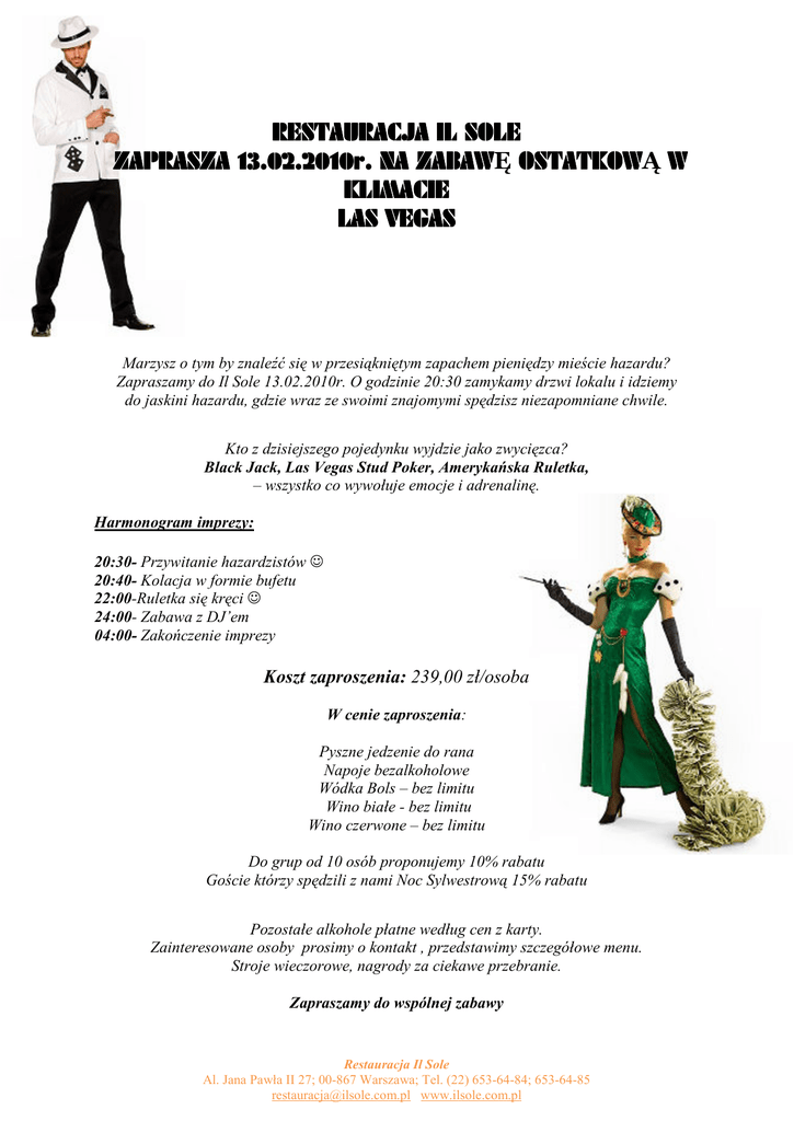 RESTAURACJA IL SOLE ZAPRASZA 13.02.2010r. 13.02.2010r. NA ZABAWĘ ZABAW OSTATKOWĄ OSTATKOW W KLIMACIE LAS VEGAS Marzysz o tym by znaleźć się w przesiąkniętym zapachem pieniędzy mieście hazardu? Zapraszamy do Il Sole 13.02.2010r. O godzinie 20:30 zamykamy drzwi lokalu i idziemy do jaskini hazardu, gdzie wraz ze swoimi znajomymi spędzisz niezapomniane chwile. Kto z dzisiejszego pojedynku wyjdzie jako zwycięzca? Black Jack, Las Vegas Stud Poker, Amerykańska Ruletka, – wszystko co wywołuje emocje i adrenalinę. Harmonogram imprezy: 20:30- Przywitanie hazardzistów ☺ 20:40- Kolacja w formie bufetu 22:00-Ruletka się kręci ☺ 24:00- Zabawa z DJ’em 04:00- Zakończenie imprezy Koszt zaproszenia: 239,00 zł/osoba W cenie zaproszenia: Pyszne jedzenie do rana Napoje bezalkoholowe Wódka Bols – bez limitu Wino białe - bez limitu Wino czerwone – bez limitu Do grup od 10 osób proponujemy 10% rabatu Goście którzy spędzili z nami Noc Sylwestrową 15% rabatu Pozostałe alkohole płatne według cen z karty. Zainteresowane osoby prosimy o kontakt , przedstawimy szczegółowe menu. Stroje wieczorowe, nagrody za ciekawe przebranie. Zapraszamy do wspólnej zabawy Restauracja Il Sole Al. Jana Pawła II 27; 00-867 Warszawa; Tel. (22) 653-64-84; 653-64-85 [email protected] www.ilsole.com.pl