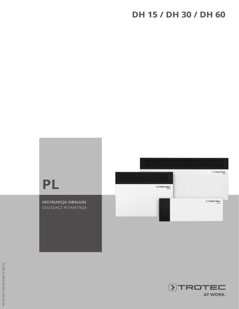 DH 15 / DH 30 / DH 60 PL TRT-BA-DH15-DH30-DH60-TC-002-PL INSTRUKCJA OBSŁUGI OSUSZACZ POWIETRZA Aktualna wersja tej instrukcji obsługi znajduje się na stronie internetowej: Spis treści Wskazówki dotyczące instrukcji obsługi ............................. 1 Bezpieczeństwo..................................................................... 2 DH 15 Informacje dotyczące urządzenia......................................... 3 Transport, montaż i przygotowanie do uruchomienia ......... 5 Obsługa .................................................................................. 8 http://download.trotec.com/?sku=1125000111&id=1 Błędy i usterki........................................................................ 9 Konserwacja ........................................................................ 10 DH 30 Załącznik techniczny........................................................... 12 Utylizacja ............................................................................. 14 Deklaracja zgodności .......................................................... 14 http://download.trotec.com/?sku=1125000116&id=1 Wskazówki dotyczące instrukcji obsługi DH 60 Symbole Zagrożenie porażeniem przez prąd elektryczny! Wskazuje na zagrożenie porażeniem przez prąd elektryczny, mogące prowadzić do obrażeń ciała lub śmierci. Niebezpieczeństwo! Wskazuje na zagrożenie wystąpienia wypadków z uczestnictwem osób. Ostrożnie! Wskazuje na zagrożenie wystąpienia szkód materialnych. Ilustracje zamieszczone w tej instrukcji obsługi przedstawiają np. model DH 30. Opisane kroki obsługi oraz objaśnienia obowiązują także dla modeli DH 15 i DH 60, jeżeli nie zamieszczono innych informacji. 1 http://download.trotec.com/?sku=1125000121&id=1 Wskazówka dotycząca odpowiedzialności prawnej Ta publikacja zastępuje wszystkie wcześniejsze wydania. Żadna część niniejszej publikacji nie może być w jakiejkolwiek formie obrabiana, powielana lub rozpowszechniana albo obrabiana elektronicznie, bez uprzedniego uzyskania pisemnej zgody firmy Trotec GmbH & Co. KG. Zmiany techniczne zastrzeżone. Wszelkie prawa zastrzeżone. Nazwy handlowe zostały wykorzystane w treści bez gwarancji prawa do dowolnego wykorzystania oraz zgodnie z pisownią stosowaną przez producenta. Wszystkie znaki towarowe są zastrzeżone. Zastrzega się prawo do wprowadzania zmian konstrukcyjnych oraz zmian kształtu/kolorów w ramach procesu ulepszeń produktu. Zakres dostawy może różnić się od zawartości ilustracji. Poniższy dokument został opracowany z zachowaniem należytej staranności. Firma Trotec GmbH & Co. KG nie ponosi odpowiedzialności za błędy w treści instrukcji obsługi lub jej niekompletność. © Trotec GmbH & Co. KG Instrukcja obsługi – Osuszacz powietrza DH 15 / DH 30 / DH 60 PL Gwarancja i odpowiedzialność Bezpieczeństwo Urządzenie odpowiada wysmaganiom dotyczącym bezpieczeństwa i higieny pracy obowiązującym na terenie Unii Europejskiej. Prawidłowość działania urządzenia została wielokrotnie sprawdzona. W przypadku wystąpienia usterek, których usunięcie nie jest możliwe mimo zastosowania się do wskazówek zawartych w rozdziale "Usterki", skontaktuj się z przedstawicielem handlowym. W przypadku zgłaszania roszczenia gwarancyjnego konieczne jest podanie numeru urządzenia (patrz tylna strona urządzenia). W przypadku niezastosowania się do zaleceń producenta, wymogów prawnych lub w przypadku przeprowadzenia modyfikacji urządzenia, jego producent nie ponosi odpowiedzialności za wynikłe szkody. Ingerencje w urządzenie lub nieautoryzowana wymiana części zamiennych może znacznie wpłynąć na bezpieczeństwo elektryczne urządzenia i prowadzi do utraty gwarancji. Producent nie ponosi żadnej odpowiedzialności za szkody rzeczowe lub obrażenia osób, wynikające z zastosowania urządzenia w sposób niezgodny z treścią tej instrukcji obsługi. Producent zastrzega prawo wprowadzenia w dowolnym momencie wynikających z procesu rozwojowego zmian konstrukcyjnych i wykonawczych. Nie ponosimy odpowiedzialności za szkody powstałe w wyniku zastosowania urządzenia niezgodnie z jego przeznaczeniem. Oznacza to także odrzucenie wszelkich roszczeń gwarancyjnych. Przed uruchomieniem urządzenia zapoznaj się z treścią instrukcji obsługi i przechowuj ją w pobliżu miejsca pracy urządzenia! • Nie eksploatuj urządzenia w pomieszczeniach, w których panuje zagrożenie wybuchem. • Nie eksploatuj urządzenia w pomieszczeniach, w których panuje agresywna atmosfera. • Upewnij się, że wlot i wylot powietrza są drożne. • Upewnij się, że wlot powietrza nie jest zanieczyszczony lub niedrożny luźnymi obiektami. • W żadnym wypadku nie wkładaj żadnych przedmiotów lub rąk do wnętrza urządzenia. • W trakcie pracy urządzenia nie przykrywaj ani nie przesuwaj go. • Nie eksploatuj ani nie obsługuj urządzenia mokrymi rękoma. • Upewnij się, że wszystkie zewnętrzne przewody elektryczne urządzenia są zabezpieczone przez uszkodzeniami (np. przez zwierzęta). W żadnym wypadku nie eksploatuj urządzenia z uszkodzonym przewodem lub przyłączem sieciowym! • Dobierz przedłużacz uwzględniając moc urządzenia, konieczną długość oraz przeznaczenie urządzenia. Całkowicie rozwiń przedłużacz. Unikaj przeciążenia elektrycznego. • Przed rozpoczęciem czynności konserwacyjnych wyciągnij wtyczkę z gniazda zasilania. Zastosowanie zgodne z przeznaczeniem Urządzenia DH 15 / DH 30 / DH 60 mogą być wykorzystywane wyłącznie jako stacjonarne, przemysłowe osuszacze kondensacyjne do osuszania i zmniejszania poziomu wilgotności powietrza wewnątrz pomieszczeń, przy zachowaniu odpowiednich danych technicznych. Zastosowanie zgodne z przeznaczeniem obejmuje: • suszenie i zmniejszanie wilgotności: – Urządzenia produkcyjne, pomieszczenia podziemne – magazynów, archiwów, laboratoriów – Pomieszczenia i powierzchnie dotknięte szkodam