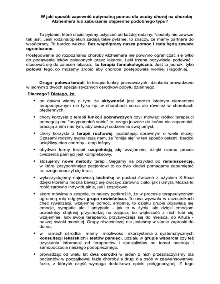 W jaki sposób zapewnić optymalną pomoc dla osoby chorej na chorobę Alzheimera lub zaburzenie otępienne podobnego typu? To pytanie, które chcielibyśmy usłyszeć od każdej rodziny. Niestety nie zawsze tak jest. Jeśli rodzina/opiekun zadają takie pytanie, to znaczy, że mamy partnera do współpracy. To bardzo ważne. Bez współpracy nasza pomoc i rada będą zawsze ograniczone. Postępowanie po rozpoznaniu choroby Alzheimera nie powinno ograniczać się tylko do podawania leków zaleconych przez lekarza. Leki trzeba oczywiście podawać i stosować się do zaleceń lekarza, to terapia farmakologiczna. Jest to jednak tyko połowa tego, co możemy zrobić aby choroba postępowała wolniej i łagodniej. Druga połowa terapii, to terapia funkcji poznawczych i działania prowadzone w jednym z dwóch specjalistycznych ośrodków pobytu dziennego. Dlaczego? Dlatego, że: od dawna wiemy o tym, że aktywność jest bardzo istotnym elementem terapeutycznym nie tylko np. w chorobach serca ale również w chorobach otępiennych, chory korzysta z terapii funkcji poznawczych czyli mówiąc krótko: terapeuci pomagają mu "przypomnieć sobie" to, czego jeszcze do końca nie zapomniał, pracują z nim nad tym, aby ćwiczył codziennie swój umysł, chory korzysta z terapii ruchowej, pozostając sprawnym o wiele dłużej. Czasami rodziny sygnalizują nam, że "omija się" w ten sposób ostatni, bardzo uciążliwy etap choroby - etap leżący. obydwie formy terapii uzupełniają się wzajemnie, dzięki czemu proces ćwiczenia pamięci jest kompleksowy, stosujemy nowe metody terapii. Sięgamy na przykład po reminiscencję, w której przypominając pacjentowi to co było kiedyś pomagamy zapamiętać to, czego nauczył się teraz, wykorzystujemy najnowszą technikę w postaci ćwiczeń z użyciem X-Boxa dzięki któremu można bawiąc się ćwiczyć zarówno ciało, jak i umysł. Można to robić zarówno indywidualnie, jak i zespołowo, skoro mówimy o zespole, to należy podkreślić, że w procesie terapeutycznym ogromną rolę odgrywa grupa rówieśnicza. To ona wyzwala w uczestnikach chęć rywalizacji, wzajemnę pomoc, empatię, to dzięku grupie pojawiają się emocje, sympatie ale i antypatie - jak to w życiu, ale dzięki emocjom uczestnicy chętniej przychodzą na zajęcia, bo większość z nich lubi się wzajemnie, lubi swoje terapeutki, przyzwyczaja się do miejsca, do Artura naszej świnki morskiej. Grupy rówieśniczej nie jesteśmy w stanie zaprosić do domu, w ramach ośrodka mamy możliwość skorzystania z systematycznych konsultacji lekarskich i testów pamięci, udziału w grupie wsparcia czy też uzyskania informacji od terapeutów i specjalistów na temat nastroju i samopoczucia naszego podopiecznego, prowadząc od wielu lat dwa ośrodki w jeden z nich przeznaczyliśmy dla pacjentów w początkowej fazie choroby a drugi dla osób w zaawansowanyej fazie, z których część wymaga dodatkowo opieki pielęgnacyjnej. Z tego drugiego uczestnik może korzestać tak długo, jak długo jest w stanie fizycznie dotrzeć do ośrodka. Zdarza się, że korzysta przez kilka lat, rodzina korzystając przez kilka lat, ma dostęp nie tylko do istotnych informacji i porad. Może też skorzystać ze szkoleń i warsztatów oraz innych programów realizowanych przez Stowarzyszenie. opiekun i rodzina mają czas na pracę, na wytchnienie w czasie pobytu ich podopiecznego w ośrodku. To jedne z najistotniejszych powodów. Wiemy to nie tylko z doświadczenia i przygotowania zawodowego. Źródłem naszej wiedzy są też nasi uczestnicy ich rodziny i opiekunowie. Niestety często, o wiele za często zgłaszają się do nas rodziny, które zbyt późno szukają pomocy. Straciły wiele cennego czasu liczonego w latach opiekując się samodzielnie swoim bliskim. Nie potrafią nam powiedzieć dlaczego tak się stało. Szkoda. Gdyby zgłosiły się wcześniej ich podopieczny miałby szansę na właściwą terapię, spowolnienie postępów choroby a rodzinie byłoby dużo łatwiej. Należy pamiętać, że właściwe prowadzenie pacjenta od momentu diagnozy doceniamy w kolejnych, coraz trudniejszych etapach choroby. Ośrodek Adaptacyjno - Rehabilitacyjny uruchomiliśmy jako pierwszy w Wielkopolsce i jeden z pierwszych w Polsce w 2004 roku. Drugi, to Środowiskowy Dom Samopomocy obecna nazwa, to "Na piętrze", który powstał w 2006 roku. Andrzej Rossa, prezes Wielkopolskiego Stowarzyszenia Alzheimerowskiego