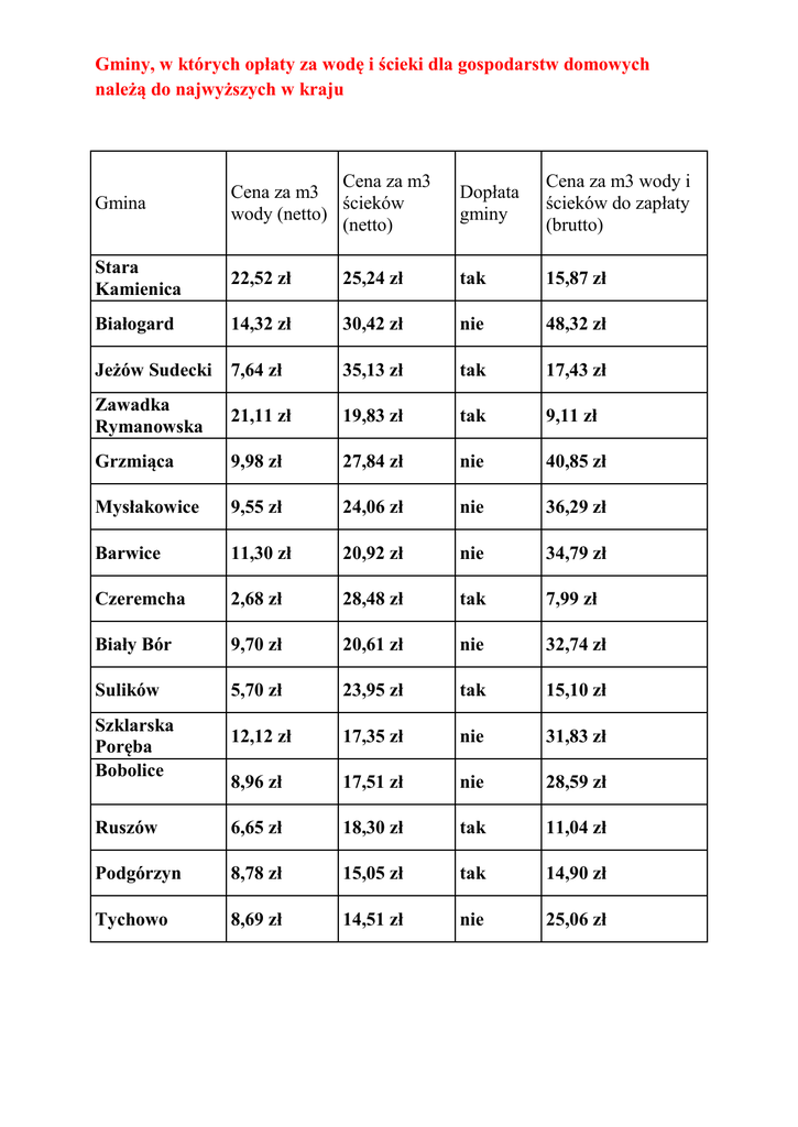 Gminy, w których opłaty za wodę i ścieki dla gospodarstw domowych należą do najwyższych w kraju Gmina Cena za m3 Cena za m3 ścieków wody (netto) (netto) Dopłata gminy Cena za m3 wody i ścieków do zapłaty (brutto) Stara Kamienica 22,52 zł 25,24 zł tak 15,87 zł Białogard 14,32 zł 30,42 zł nie 48,32 zł Jeżów Sudecki 7,64 zł 35,13 zł tak 17,43 zł Zawadka Rymanowska 21,11 zł 19,83 zł tak 9,11 zł Grzmiąca 9,98 zł 27,84 zł nie 40,85 zł Mysłakowice 9,55 zł 24,06 zł nie 36,29 zł Barwice 11,30 zł 20,92 zł nie 34,79 zł Czeremcha 2,68 zł 28,48 zł tak 7,99 zł Biały Bór 9,70 zł 20,61 zł nie 32,74 zł Sulików 5,70 zł 23,95 zł tak 15,10 zł Szklarska Poręba Bobolice 12,12 zł 17,35 zł nie 31,83 zł 8,96 zł 17,51 zł nie 28,59 zł Ruszów 6,65 zł 18,30 zł tak 11,04 zł Podgórzyn 8,78 zł 15,05 zł tak 14,90 zł Tychowo 8,69 zł 14,51 zł nie 25,06 zł