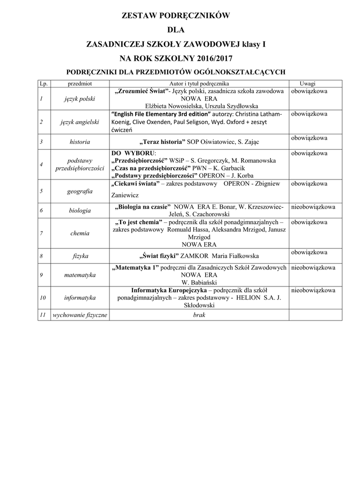ZESTAW PODRĘCZNIKÓW DLA ZASADNICZEJ SZKOŁY