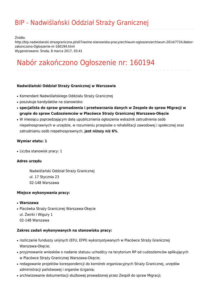 BIP - Nadwiślański Oddział Straży Granicznej Źródło: http://bip.nadwislanski.strazgraniczna.pl/s07/wolne-stanowiska-pracy/archiwum-ogloszen/archiwum-2014/7724,Naborzakonczono-Ogloszenie-nr-160194.html Wygenerowano: Środa, 8 marca 2017, 03:41 Nabór zakończono Ogłoszenie nr: 160194 Nadwiślański Oddział Straży Granicznej w Warszawie ● Komendant Nadwiślańskiego Oddziału Straży Granicznej ● poszukuje kandydatów na stanowisko: ● specjalista do spraw gromadzenia i przetwarzania danych w Zespole do spraw Migracji w grupie do spraw Cudzoziemców w Placówce Straży Granicznej Warszawa-Okęcie ● W miesiącu poprzedzającym datę upublicznienia ogłoszenia wskażnik zatrudnienia osób niepełnosprawnych w urzędzie, w rozumieniu przepisów o rehabilitacji zawodowej i społecznej oraz zatrudnianiu osób niepełnosprawnych, jest niższy niż 6%. Wymiar etatu: 1 ● Liczba stanowisk pracy: 1 Adres urzędu Nadwiślański Oddział Straży Granicznej ul. 17 Stycznia 23 02-148 Warszawa Miejsce wykonywania pracy: ● Warszawa ● Placówka Straży Granicznej Warszawa-Okęcie ul. Żwirki i Wigury 1 02-148 Warszawa Zakres zadań wykonywanych na stanowisku pracy: ● rozliczanie funduszy unijnych (EFU, EFPI) wykorzystywanych w Placówce Straży Granicznej Warszawa-Okęcie; ● przyjmowanie wniosków o nadanie statusu uchodźcy na terytorium RP od cudzoziemców aplikujących w Placówce Straży Granicznej Warszawa-Okęcie; ● redagowanie projektów korespondencji do komórek organizacyjnych Straży Granicznej, urzędów administracji państwowej i organów ścigania; ● archiwizowanie dokumentacji służbowej prowadzonej przez Zespół do spraw Migracji; ● sporządzanie zestawień statystycznych w celu zebrania informacji na temat rezultatów działań prowadzonych przez Zespół do spraw Migracji. Warunki pracy Warunki dotyczące charakteru pracy na stanowisku i sposobu wykonywania zadań - praca poza siedzibą urzędu; - praca o charakterze administracyjno – biurowym w systemie 8-godzinnym. Miejsce i otoczenie organizacyjno-techniczne stanowiska pracy - budynek nie jest przystosowany do poruszania się osób niepełnosprawnych ruchowo (brak podjazdów, brak pomieszczeń higieniczno – sanitarnych przystosowanych dla osób niepełnosprawnych); - pracownik wykonuje prace biurowe przy sztucznym oświetleniu z wykorzystaniem monitora ekranowego, drukarki, telefonu i faksu; - możliwość poruszania się po obiekcie. Wymagania związane ze stanowiskiem pracy niezbędne ● wykształcenie: wyższe ● doświadczenie zawodowe/staż pracy: 6 miesięcy doświadczenia zawodowego w obszarze procedur migracyjnych ● pozostałe wymagania niezbędne: ❍ podstawowa znajomość ustawy o Straży Granicznej; ❍ znajomość języków obcych: rosyjski lub angielski w stopniu komunikatywnym; ❍ umiejętność obsługi komputera; ❍ umiejętność pracy w zespole; ❍ komunikatywność; ❍ dyspozycyjność; ❍ kreatywność. wymagania dodatkowe ● 1 rok doświadczenia w pracy biurowej. Wymagane dokumenty i oświadczenia: ● życiorys i list motywacyjny ● oświadczenie kandydata o wyrażeniu zgody na przetwarzanie danych osobowych do celów rekrutacji ● oświadczenie kandydata o korzystaniu z pełni praw publicznych ● oświadczenie kandydata o nieskazaniu prawomocnym wyrokiem za umyślne przestępstwo lub umyślne przestępstwo skarbowe ● kopie dokumentów potwierdzających wykształcenie ● kopia dokumentu potwierdzającego posiadanie polskiego obywatelstwa lub oświadczenie o posiadaniu obywatelstwa polskiego ● kopia poświadczenia bezpieczeństwa uprawniającego do dostępu do informacji niejawnych oznaczonych klauzulą "poufne" lub oświadczenie o wyrażeniu zgody na przeprowadzenie postępowania sprawdzającego zgodnie z ustawą z dnia 5 sierpnia 2010 r. o ochronie informacji niejawnych (Dz. U. Nr 182, poz. 1228), Inne dokumenty i oświadczenia ● kopia dokumentu potwierdzającego niepełnosprawność - w przypadku kandydatów, którzy zamierzają skorzystać z pierwszeństwa w zatrudnieniu w przypadku, gdy znajdą się w gronie najlepszych kandydatów ● kopia świadectw pracy lub innych dokumentów potwierdzających wymagane doświadczenie zawodowe. Termin składania dokumentów: 01-06-2014 Miejsce składania dokumentów: Nadwiślański Oddział Straży Granicznej ul. 17 Stycznia 23 02-148 Warszawa z dopiskiem: „specjalista-kontroler PSG Warszawa-Okęcie” Informacje dodatkowe: tel. 22 500 33 48, 22 500 30 23 Inne informacje: 1.Proponowane wynagrodzenie w wysokości 2070,59 zł (brutto) + dodatek za wysługę lat. 2. Godziny pracy urzędu: 7:30 – 15:30. 3. Dokumenty należy składać osobiście w siedzibie lub listownie. Oferty otrzymane po terminie nie będą rozpatrywane (decyduje data złożenia oferty w siedzibie urzędu lub data stempla pocztowego). Rozpatrzeniu podlegają tylko kompletne oferty (w tym kserokopie dokumentów, wymagane oświadczenia). Rozpatrzeniu nie będą podlegać oferty bez własnoręcznego podpisu oraz niespełniające wymagań określonych w ogłoszeniu. Oferty odrzucone zostaną komisyjnie odrzucone. 4. Urząd w przypadku wyłonienia kandydata odpowiadającego jego oczekiwaniom, zastrzega sobie prawo do przerwania postępowania w zakresie naboru na niniejsze stanowisko służbowe bez przeprowadzenia rozmów z pozostałymi kandydatami. Wyłonieni na poszczególnych etapach postępowania kandydaci każdorazowo informowani są telefonicznie o dalszym trybie postępowania wobec nich. 5. Do składania ofert zachęcamy również osoby niepełnosprawne. Metryczka Data publikacji 21.05.2014 Data modyfikacji 24.06.2014 Rejestr zmian Podmiot udostępniający informację: Straż Graniczna Osoba wytwarzająca/odpowiadająca za informację: Karolina Kulita-Wysocka Osoba udostępniająca informację: Karolina Kulita-Wysocka Osoba modyfikująca informację: Karolina Kulita-Wysocka