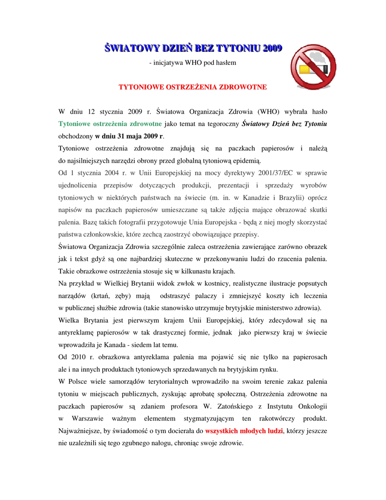 ŚWIATOWY DZIE Ń BEZ TYTONIU 2009