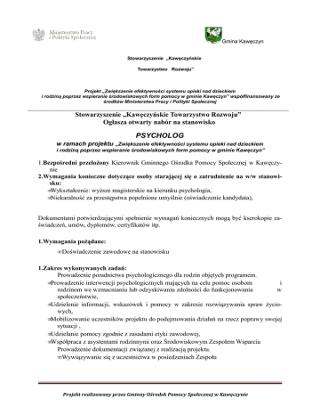 Gmina Kawęczyn Stowarzyszenie „Kawęczyńskie Towarzystwo Rozwoju” Projekt „Zwiększenie efektywności systemu opieki nad dzieckiem i rodziną poprzez wspieranie środowiskowych form pomocy w gminie Kawęczyn” współfinansowany ze środków Ministerstwa Pracy i Polityki Społecznej _________________________________________________________________________________ Stowarzyszenie „Kawęczyńskie Towarzystwo Rozwoju” Ogłasza otwarty nabór na stanowisko PSYCHOLOG w ramach projektu „Zwiększenie efektywności systemu opieki nad dzieckiem i rodziną poprzez wspieranie środowiskowych form pomocy w gminie Kawęczyn” 1.Bezpośredni przełożony Kierownik Gminnego Ośrodka Pomocy Społecznej w Kawęczynie 2.Wymagania konieczne dotyczące osoby starającej się o zatrudnienie na w/w stanowisku: •Wykształcenie: wyższe magisterskie na kierunku psychologia, •Niekaralność za przestępstwa popełnione umyślnie (oświadczenie kandydata), Dokumentami potwierdzającymi spełnienie wymagań koniecznych mogą być kserokopie zaświadczeń, umów, dyplomów, certyfikatów itp. 1.Wymagania pożądane: • Doświadczenie zawodowe na stanowisku 1.Zakres wykonywanych zadań: Prowadzenie poradnictwa psychologicznego dla rodzin objętych programem. •Prowadzenie interwencji psychologicznych mających na celu pomoc osobom i rodzinom we wzmacnianiu lub odzyskiwaniu zdolności do funkcjonowania w społeczeństwie, •Udzielenie informacji, wskazówek i pomocy w zakresie rozwiązywania spraw życiowych, •Mobilizowanie uczestników projektu do podejmowania działań na rzecz poprawy swojej sytuacji , •Udzielanie pomocy zgodnie z zasadami etyki zawodowej, •Współpraca z asystentami rodzinnymi oraz Środowiskowym Zespołem Wsparcia Prowadzenie dokumentacji związanej z realizacją projektu. • Wywiązywanie się z uczestnictwa w posiedzeniach Zespołu Projekt realizowany przez Gminny Ośrodek Pomocy Społecznej w Kawęczynie 1.Zakres uprawnień: •W zakresie wykonywania obowiązków wyżej określonych Psycholog ma prawo korzystania z należących do Zleceniodawcy pomieszczeń lokalowych, urządzeń biurowych, 1.Umiejętności: •Kompetencje kluczowe (komunikatywność, sumienność, rzetelność, dokładność, umiejętności interpersonalne, bardzo dobra organizacja pracy, odpowiedzialność, kreatywność, wysoki poziom kultury osobistej), •Dodatkowe kompetencje (umiejętność prognozowania, umiejętności rozwiązywania problemów, dokonywania analiz problemów zgłaszanych przez uczestników projektu), •Inne umiejętności: kierowanie pojazdem (prawo jazdy kat. B), obsługa urządzeń biurowych. 1.Rodzaj zatrudnienia: •Umowa - zlecenie. 1.Wymagane dokumenty: • list motywacyjny • życiorys – CV • kserokopie dokumentów potwierdzających doświadczenie • kserokopie dyplomów potwierdzających wykształcenie i posiadane kwalifikacje zawodowe • kserokopie zaświadczeń o ukończonych kursach, szkoleniach itp. • referencje • oświadczenie o wyrażeniu zgody na przetwarzanie danych osobowych do celów rekrutacji wg wzoru poniżej. 1.Oferujemy: •rozwojową pracę, •atrakcyjne wynagrodzenie, •stabilne warunki zatrudnienia, 1.Termin i miejsce składania dokumentów: Wymagane dokumenty aplikacyjne należy składać osobiście w biurze Stowarzyszenia lub przesłać pocztą na adres: Stowarzyszenie „Kawęczyńskie Towarzystwo Rozwoju”, Kawęczyn 39/3, 62-704 Kawęczyn, w zamkniętych kopertach z podanym adresem zwrotnym i dopiskiem „Konkurs na stanowisko PSYCHOLOG w Stowarzyszeniu „Kawęczyńskie Towarzystwo Rozwoju” w terminie do dnia 28.07.2011 r. do godz. 1200 Do dokumentów należy dołączyć zgodę na przetwarzanie danych osobowych tj. klauzulę: „Wyrażam zgodę na przetwarzanie moich danych osobowych zawartych w ofercie pracy dla potrzeb niezbędnych do realizacji procesu rekrutacji zgodnie z ustawą z dnia 29 sierpnia 1997 r. o ochronie danych osobowych (t. j. Dz. U. z 2002 r. Nr 101, poz. 926 ze zm.)”. Dodatkowe informacje można uzyskać pod numerem telefonu: 063 2885930. Informacje dodatkowe: •Aplikacje, które wpłyną do Stowarzyszenia po wyżej określonym terminie nie będą rozpatrywane. Projekt realizowany przez Gminny Ośrodek Pomocy Społecznej w Kawęczynie •Z kandydatami spełniającymi wymagania konieczne lub/i pożądane zostanie przeprowadzona rozmowa kwalifikacyjna, o której zostaną poinformowani telefonicznie. •Informacja o wyniku naboru będzie umieszczona na stronie internetowej oraz na tablicy ogłoszeń Stowarzyszenia „Kawęczyńskie Towarzystwo Rozwoju”. Prezes Zarządu /-/ Jarosław Król Projekt realizowany przez Gminny Ośrodek Pomocy Społecznej w Kawęczynie