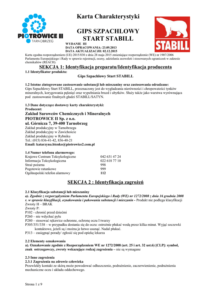 Karta Charakterystyki GIPS SZPACHLOWY START STABILL WYDANIE III DATA OPRACOWANIA: 23.09.2013 DATA AKTUALIZACJII: 02.12.2015 Karta zgodna rozporządzeniem (UE) 2015/830 z dnia 28 maja 2015 zmieniające rozporządzenie (WE) nr 1907/2006 Parlamentu Europejskiego i Rady w sprawie rejestracji, oceny, udzielania zezwoleń i stosowanych ograniczeń w zakresie chemikaliów (REACH). SEKCJA 1: Identyfikacja preparatu/Identyfikacja producenta 1.1 Identyfikator produktu: Gips Szpachlowy Start STABILL 1.2 Istotne zintegrowane zastosowanie substancji lub mieszaniny oraz zastosowania odradzane: Gips Szpachlowy Start STABILL, przeznaczony jest do wygładzania nierówności i chropowatości tynków mineralnych, korygowania pęknięć oraz wypełniania bruzd i ubytków. Służy także jako warstwa wyrównująca pod zastosowanie finalnych gładzi STABILL/SATYN. 1.3 Dane dotyczące dostawcy karty charakterystyki: Producent: Zakład Surowców Chemicznych i Mineralnych PIOTROWICE II Sp. z o.o. ul. Górnicza 7, 39-400 Tarnobrzeg Zakład produkcyjny w Tarnobrzegu Zakład produkcyjny w Zawichoście Zakład produkcyjny w Rybniku Tel.: (015) 836-41-42, 836-40-21 Email: [email protected] 1.4 Numer telefonu alarmowego: Krajowe Centrum Toksykologiczne Informacja Toksykologiczna Straż pożarna Pogotowie ratunkowe Ogólnopolski telefon alarmowy 042 631 47 24 022 618 77 10 998 999 112 SEKCJA 2 : Identyfikacja zagrożeń 2.1 Klasyfikacja substancji lub mieszaniny a). Zgodnie z rozporządzeniem Parlamentu Europejskiego i Rady (WE) nr 1272/2008 z dnia 16 grudnia 2008 r. w sprawie klasyfikacji, oznakowania i pakowania substancji i mieszanin - Produkt nie podlega klasyfikacji Zwroty H – BRAK Zwroty P: P102 - chronić przed dziećmi P260 – nie wdychać pyłu P280 – stosować rękawice ochronne, ochronę oczu I twarzy P305/351/338 – w przypadku dostania się do oczu: ostrożnie płukać wodą przez kilka minut. Wyjąć soczewki kontaktowe, jeżeli są i można je łatwo usunąć. Nadal płukać. P313 – zasięgnąć porady/ zgłosić się pod opiekę lekarza 2.2 Elementy oznakowania a). Oznakowanie zgodnie z Rozporządzeniem WE nr 1272/2008 (art. 25 i art. 32 ust.6) [CLP]: symbol, znak ostrzegawczy, zwroty wskazujące rodzaj zagrożenia – nie są wymagane 2.3 Inne zagrożenia 2.3.1 Zagrożenia na zdrowie człowieka Przewlekły kontakt ze skórą może powodować odłuszczenie, podrażnienie, zaczerwienienie, podrażnienia mechaniczne oczu i układu oddechowego. Strona 1 z 9 Karta Charakterystyki GIPS SZPACHLOWY START STABILL WYDANIE III DATA OPRACOWANIA: 23.09.2013 DATA AKTUALIZACJII: 02.12.2015 Karta zgodna rozporządzeniem (UE) 2015/830 z dnia 28 maja 2015 zmieniające rozporządzenie (WE) nr 1907/2006 Parlamentu Europejskiego i Rady w sprawie rejestracji, oceny, udzielania zezwoleń i stosowanych ograniczeń w zakresie chemikaliów (REACH). 2.3.2 Zagrożenie z środowisko Brak informacji 2.3.3 Cena właściwości PBT i vPvB Nie dotyczy SEKCJA 3: Skład/informacja o składnikach 3.1 Substancja Nie dotyczy 3.2 Mieszanina Mieszanka naturalnego spoiwa gipsowego, wypełniacza mineralnego i dodatków modyfikujących <1%. Lp Składnik Nr WE Zawartość [%] Klasyfikacja wg Nr CAS 1272/2008/WE 1 Dolomit Nr WE (EINECS) 240-440-2 < 55% Nie podlega klasyfikacji 45 % Nie podlega klasyfikacji Nr CAS 16389-88-1 2 Siarczan Wapnia Nr WE (EINECS) 231-900-3 Nr CAS 7778-18-9 Zgodnie z klasyfikacją substancji chemicznych żadna z substancji wchodzących w skład mieszaniny nie jest klasyfikowana jako niebezpieczna. W przypadku substancji zaklasyfikowanej jako niebezpieczne, końcowe stężenia ich w produkcie są mniejsze od wartości granicznych i nie wpływają na ostateczną klasyfikację produktu. Producent dysponuje kartami charakterystyki każdej substancji wchodzącej w skład produktu. SEKCJA 4: Środki pierwszej pomocy Uwaga:, Jeżeli nastąpią jakiekolwiek niepokojące objawy należy natychmiast skonsultować się z lekarzem. Przy długotrwałym kontakcie istnieje możliwość podrażnienia oczu i skóry. 4.1 Opis środków pierwszej pomocy Wdychanie: Wynieść poszkodowanego z miejsca narażenia na świeże powietrze, zapewnić spokój, okryć kocem. Jeżeli wystąpią jakiekolwiek niepokojące objawy (np. trudności w oddychaniu, kaszel, świszczący oddech) wezwać lekarza. Kontakt ze skórą: Zdjąć całą zanieczyszczoną odzież i buty. Skórę zmyć dużą ilością świeżej wody. Uprać odzież przed ponownym założeniem. Kontakt z oczami: Natychmiast płukać dużą ilością wody, przez przynajmniej 15 minut, trzymając powieki szeroko rozwarte. Jeżeli wystąpi podrażnienie oczu, pieczenie lub łzawienie, skonsultować się z lekarzem. Strona 2 z 9 Karta Charakterystyki GIPS SZPACHLOWY START STABILL WYDANIE III DATA OPRACOWANIA: 23.09.2013 DATA AKTUALIZACJII: 02.12.2015 Karta zgodna rozporządzeniem (UE) 2015/830 z dnia 28 maja 2015 zmieniające rozporządzenie (WE) nr 1907/2006 Parlamentu Europejskiego i Rady w sprawie rejestracji, oceny, udzielania zezwoleń i stosowanych ograniczeń w zakresie chemikaliów (REACH). Połknięcie: Nie wywoływać wymiotów. Przepłukać jamę ustną dużą ilością wody, nie połykać. Bezwzględnie nie podawać nic do picia osobie nieprzytomnej. Skonsultować się z lekarzem – pokazać opakowanie na etykiecie. 4.2 Najważniejsze ostre i opóźnione objawy oraz skutki narażenia Wdychanie: Kaszel, podrażnienie błon śluzowych oraz dróg oddechowych, uczucie senności i zawroty głowy. Kontakt ze skórą: Zaczerwienienie, pieczenie, podrażnienie skóry oraz błony śluzowych. Powtarzający się kontakt produktu ze skórą powoduje nadmierne wysuszenie oraz pękanie skóry. Kontakt z oczami: Zaczerwienienie, łzawienie, obrzęk, ból. Połknięcie: Nudności, wymioty. 4.3 Wskazania dotyczące wszelkiej natychmiastowej pomocy lekarskiej i szczególnego postępowania z poszkodowanym O sposobie postępowania z poszkodowanym decyduje lekarz po dokładnej ocenie poszkodowa