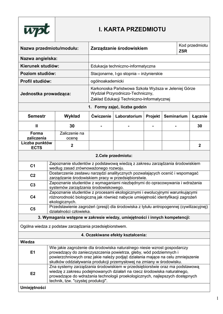 I. KARTA PRZEDMIOTU Nazwa przedmiotu/modułu: Kod przedmiotu ZSR Zarządzanie środowiskiem Nazwa angielska: Kierunek studiów: Edukacja techniczno-informatyczna Poziom studiów: Stacjonarne, I-go stopnia – inżynierskie Profil studiów: ogólnoakademicki Jednostka prowadząca: Karkonoska Państwowa Szkoła Wyższa w Jeleniej Górze Wydział Przyrodniczo-Techniczny, Zakład Edukacji Techniczno-Informatycznej 1. Formy zajęć, liczba godzin Semestr Wykład Ćwiczenie II 30 - Forma zaliczenia Liczba punktów ECTS Zaliczenie na ocenę Laboratorium Projekt Seminarium - 2 - - Łącznie 30 2 2.Cele przedmiotu: C1 C2 C3 C4 C5 Zapoznanie studentów z podstawową wiedzą z zakresu zarządzania środowiskiem według zasad zrównoważonego rozwoju. Dostarczenie zestawu narzędzi analitycznych pozwalających ocenić i wspomagać zarządzanie środowiskiem pracy w przedsiębiorstwie. Zapoznanie studentów z wymaganiami niezbędnymi do opracowywania i wdrażania systemów zarządzania środowiskowego. Zapoznanie studentów z procesami ekologicznymi i ewolucyjnymi warunkującymi różnorodność biologiczną jak również nabycie umiejętność identyfikacji zagrożeń ekologicznych. Przedstawienie zagrożeń (presji) dla środowiska z tytułu antropogennej (cywilizacyjnej) działalności człowieka. 3. Wymagania wstępne w zakresie wiedzy, umiejętności i innych kompetencji: Ogólna wiedza z podstaw zarządzania przedsiębiorstwem. 4. Oczekiwane efekty kształcenia: Wiedza E1 E2 Wie jakie zagrożenie dla środowiska naturalnego niesie wzrost gospodarczy prowadzący do zanieczyszczenia powietrza, gleby, wód podziemnych i powierzchniowych oraz jakie należy podjąć działania mające na celu zmniejszenie skutków oddziaływania produkcji przemysłowej na zmiany w środowisku. Zna systemy zarządzania środowiskiem w przedsiębiorstwie oraz ma podstawową wiedzę z zakresu podejmowanych działań na rzecz środowiska naturalnego, prowadzące do wdrażania technologii proekologicznych, najlepszych dostępnych technik, tzw. "czystej produkcji". Umiejętności 1 Student posiada umiejętności rozumienia i analizowania zagadnień związanych z ochroną środowiska, którą potrafi wykorzystać do prawidłowej oceny zagrożeń i E3 podjęcia działań prawnych oraz administracyjnych mających na celu ich zmniejszenie lub całkowitą likwidację. Kompetencje społeczne Wie że systematyczna praca oraz potrzeba ciągłego uczenia się pozwoli poszerzyć zakres posiadanej wiedzy, którą wykorzysta do samodzielnego podejmowania E4 optymalnych decyzji w procesach gospodarczych, w praktyce administracji publicznej, jak również dotyczących rozwoju infrastruktury z uwzględnieniem kryteriów ochrony środowiska. 5. Treści programowe: Forma zajęć: Wykład Wyk1 Wyk2 Wyk3 Wyk4 Wyk5 Wyk5 Wyk6 Wyk7 Wyk8 Wyk9 Wyk10 Wyk11 Wyk12 Wprowadzenie do tematyki ochrony środowiska na podstawie omówienia literatury - Dylematy XXI w., Składniki środowiska (powietrze, woda, gleba), Zanieczyszczenia, Odpady Kalendarium trzech ostatnich dekad formowania się ruchu na rzecz środowiska - Zagrożenia, Światowe wydarzenia stymulujące działania na rzecz ochrony środowiska, Krajowe wydarzenia na rzecz ochrony środowiska, Organizacje ekologiczne Definicje dotyczące ekosystemu - strategie zrównoważonego rozwoju globalnego - Ekologia, przyroda, sozologia, ochrona środowiska - definicje, Ekosystem, Strategie zrównoważonego rozwoju globalnego Spełnienie potrzeb populacji ludzkiej, a globalne zasoby środowiska - przemysł, infrastruktura a środowisko - Podział zasobów środowiska, Ogólna charakterystyka wybranych składników środowiska, Kryzys energetyczny, Ślad ekologiczny Rolnictwo ekologiczne, lasy i obszary chronione - Rolnictwo ekologiczne - akty prawne, Kryteria produkcji ekologicznej, Rolnictwo ekologiczne w Polsce, Lasy i obszary chronione, Obszary chronione w Polsce Atmosfera - tło naturalne i jego przekształcenia oraz możliwości ich ograniczenia - Atmosfera - części składowe, Zanieczyszczenia atmosfery, Jakość powietrza na Dolnym Śląsku Hydrosfera - tło naturalne i jego przekształcenia oraz możliwości ich ograniczenia - Woda i jej właściwości, Woda w przyrodzie, Zanieczyszczenia wód, Jakość wód na Dolnym Śląsku Litosfera - ochrona wód gruntowych, gleb i powierzchni - Litosfera - definicja, Gleby, Zanieczyszczenia litosfery, Jakość gleb na Dolnym Śląsku (raport WIOŚ za 2008 r.) Zintegrowane zarządzanie środowiskiem - definicje, modele, systemy ISO - Rys historyczny, Strategia zrównoważonego rozwoju, Zintegrowane systemy zarządzania "Czysta energia" - klucz do rozwiązania globalnych problemów ekosystemu - Strategie ograniczenia emisji zanieczyszczeń do środowiska, Czysta produkcja, Odnawialne źródła energii - czysta energia, Uwarunkowania wynikające z członkowstwa w UE Systemy zarządzania ISO - Strategie ograniczenia emisji zanieczyszczeń do środowiska, Standardy ISO serii 14000, Wdrażanie normy ISO 14001, Proces certyfikacji Podstawy prawne ochrony środowiska - Regulacje prawne, Ochrona środowiska, Dostęp do informacji, Pozostałe akty prawne System administracyjny zarządzania środowiskiem - Stanowienie prawa i ustawy, Instytucje ochrony środowiska, Organy doradcze, Organizacje i instytucje związane z ochroną środowiska Liczba godzin 2 2 2 2 2 2 2 2 2 2 2 2 2 2 Wyk13 Ochrona środowiska w hierarchii celów firmy - Zarządzanie ochroną środowiska jako strategia konkurencyjna, Geneza znormalizowanych systemów zarządzania środowiskowego 2 Wyk14 Sektor społeczny (NGO) 2 Wyk15 Poprawa ocen, konsultacje, wpisanie ocen 2 Suma godzin - wykłady 30 6. Narzędzia dydaktyczne: 1. Prezentacje multimedialne 2. Komputer, rzutnik 3. Tabele, zestawienia instytucji zajmujących się ochroną środowiska 7. Sposoby oceny (F – formująca, P – podsumowująca) F1. Napisanie referatu z ochrony środowiska (dopuszcza do napisania kolokwium zaliczeniowego). F2. P