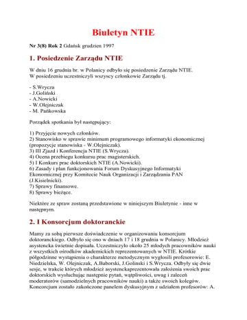 Biuletyn NTIE Nr 3(8) Rok 2 Gdańsk grudzien 1997 1. Posiedzenie Zarządu NTIE W dniu 16 grudnia br. w Polanicy odbyło się posiedzenie Zarządu NTIE. W posiedzeniu uczestniczyli wszyscy członkowie Zarządu tj. - S.Wrycza - J.Goliński - A.Nowicki - W.Olejniczak - M. Pańkowska Porządek spotkania był następujący: 1) Przyjęcie nowych członków. 2) Stanowisko w sprawie minimum programowego informatyki ekonomicznej (propozycje stanowiska - W.Olejniczak). 3) III Zjazd i Konferencja NTIE (S.Wrycza). 4) Ocena przebiegu konkursu prac magisterskich. 5) I Konkurs prac doktorskich NTIE (A.Nowicki). 6) Zasady i plan funkcjonowania Forum Dyskusyjnego Informatyki Ekonomicznej przy Komitecie Nauk Organizacji i Zarządzania PAN (J.Kisielnicki). 7) Sprawy finansowe. 8) Sprawy bieżące. Niektóre ze spraw zostaną przedstawione w niniejszym Biuletynie - inne w następnym. 2. I Konsorcjum doktoranckie Mamy za sobą pierwsze doświadczenie w organizowaniu konsorcjum doktoranckiego. Odbyło się ono w dniach 17 i 18 grudnia w Polanicy. Młodzież asystencka świetnie dopisała. Uczestniczyło około 25 młodych pracowników nauki z wszystkich ośrodków akademickich reprezentowanych w NTIE. Krótkie półgodzinne wystąpienia o charakterze metodycznym wygłosili profesorowie: E. Niedzielska, W. Olejniczak, A.Baborski, J.Golinski i S.Wrycza. Odbyły się dwie sesje, w trakcie których młodzież asystenckaprezentowała założenia swoich prac doktorskich wysłuchując następnie pytań, wątpliwości, uwag i zaleceń moderatorów (samodzielnych pracowników nauki) a także swoich kolegów. Koncorcjum zostało zakończone panelem dyskusyjnym z udziałem profesorów: A. Nowickiego, A.Gospodarowicza i J.Golińskiego. Z całą pewnością nastąpiła integracja młodego rzutu pracowników naukowo dydaktycznych reprezentujących informatykę ekonomiczną. To właśnie założenie było jednym z ważkich czynników powołania NTIE. Pragnę złożyć gorące podziękowania organizatorom koncorcjum z Instytutu Informatyki Ekonomicznej z Akademii Ekonomicznej we Wrocławiu - prof. A. Nowickiemu i jego znakomitemu Zespołowi. Oddzielne podziękowania należą się firmie TETA - sponsorowi, który był uprzejmy sfinansować przedsięwzięcie. Najwyższym jednak wyrazem uznania, zarówno dla organizatorów jak i sponsorów, była wysoka ocena potrzeby i użyteczności organizowania takiego konsorcjum wyrażana przez jego uczestników. 3. Konkurs prac magisterskich Jury I konkursu na najlepsze prace magisterskie z dziedziny informatyki ekonomicznej NTIE ogłosiło swoje wyniki konkursu. Są one następujące: Nagroda I stopnia (1200 zł) - Paweł Afelt - “Zastosowanie metod i technik sztucznej inteligencji w programowaniu zapotrzebowania na energię elektryczną” ( promotor prof. Jerzy Zieliński Uniwersytet Łódzki), Nagroda II stopnia (800 zł) - Mirosław Rusin - “System DELPHI jako implementacja techniki obiektowej” ( promotor prof. Stanisław Wrycza Uniwersytet Gdański), Nagroda III stopnia ( 600 zł) - Paweł Gorczyca - “Narzędzia informatyczne w analizie technicznej Giełdy ( promotor, prof. Jan Goliński Szkoła Główna Handlowa w Warszawie) Wręczenie nagród nastąpi z udziałem prasy 14 stycznia w warszawskim Business Centre Club. 4. Nowi członkowie Na posiedzeniu w dniu 16 grudnia deklaracje członkowskie złożyli i zostali przyjęci: - prof. Jacek Kryt ( Ryerson Politechnic University, Toronto, Kanada) - prof. dr hab. Agnieszka Szewczyk (Uniwersytet Szczeciński), - mgr Ayman Maktabi (Syria), - mgr Dorota Grzelak (Uniwersytet Gdański), - mgr Aleksandra Gwizdała (Uniwersytet Gdański), - mgr Witold Rybiński (Uniwersytet Gdański), - mgr Arkadiusz Owczarzy (AE Wrocław). Serdecznie witam w naszym Towarzystwie i zapraszam do współpracy. 5. II konkurs NTIE na najlepsze prace magisterskie z dziedziny informatyki ekonomicznej. Stosownie do Regulaminu, prace konkursowe na II już konkurs należy przesłać w nieprzekraczalnym terminie do 31 stycznia 1998 roku na następujący adres: Szkoła Główna Handlowa Katedra Informatyki Gospodarczej, Al. Niepodległości 162 02-554 Warszawa Zarząd NTIE powołał jury II Konkursu w skład, którego wchodzą: - prof. dr Wiesław Flakiewicz, członek honorowy NTIE - przewodniczący oraz członkinie: - prof. dr hab. Agnieszka Szewczyk - dr Małgorzata Pańkowska. Konkurs dotyczy prac magisterskich napisanych w okresie 1.01.-31,12.1997r. 6. I już Święta . . . Wszystkim członkom NTIE składam serdeczne podziękowania za całoroczną współpracę, przekazując najlepsze świąteczne i noworoczne życzenia pomyślności i powodzenia życiu osobistym, zawodowym i społecznym. Stanisław Wrycza Prezes NTIE
