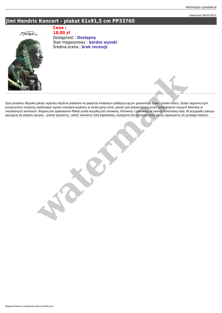 Informacje o produkcie Utworzono 08-03-2017 Jimi Hendrix Koncert - plakat 61x91,5 cm PP33760 Cena : 18,00 zł er m ar k Dostępność : Dostępny Stan magazynowy : bardzo wysoki Średnia ocena : brak recenzji w at Opis produktu Wysoka jakość wydruku Wydruk plakatów na papierze kredowym półbłyszczącym gwarantuje żywe i trwałe kolory. Dzięki zagranicznym producentom możemy zaoferować wysoki standard wydruku w atrakcyjnej cenie. Jakość jest potwierdzona przez tysiące opinii naszych Klientów w niezależnych serwisach. Bezpieczne opakowanie Plakat przed wysyłką jest rolowany, foliowany i pakowany w twardą kartonową tubę. W przypadku zakupu pasującej do plakatu oprawy - plakat oprawimy, całość owiniemy folią bąbelkową, następnie tak zabezpieczony obraz zapakujemy do grubego kartonu. Wygenerowano w programie www.oscGold.com