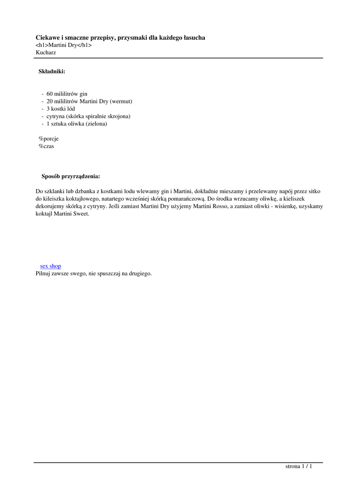 Ciekawe i smaczne przepisy, przysmaki dla każdego łasucha <h1>Martini Dry</h1> Kucharz Składniki: - 60 mililitrów gin 20 mililitrów Martini Dry (wermut) 3 kostki lód cytryna (skórka spiralnie skrojona) 1 sztuka oliwka (zielona) %porcje %czas Sposób przyrządzenia: Do szklanki lub dzbanka z kostkami lodu wlewamy gin i Martini, dokładnie mieszamy i przelewamy napój przez sitko do kileiszka koktajlowego, natartego wcześniej skórką pomarańczową. Do środka wrzucamy oliwkę, a kieliszek dekorujemy skórką z cytryny. Jeśli zamiast Martini Dry użyjemy Martini Rosso, a zamiast oliwki - wisienkę, uzyskamy koktajl Martini Sweet. sex shop Pilnuj zawsze swego, nie spuszczaj na drugiego. strona 1 / 1