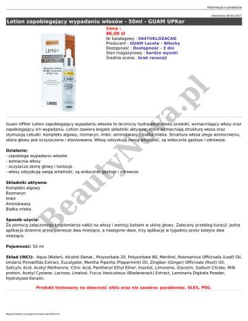 Informacje o produkcie Utworzono 08-03-2017 Lotion zapobiegający wypadaniu włosów - 50ml - GUAM UPKer Cena : 86,00 zł a. pl Nr katalogowy : 0447UKLOZACAD Producent : GUAM Lacote - Włochy Dostępność : Dostępność - 3 dni Stan magazynowy : bardzo wysoki Średnia ocena : brak recenzji yN ov Guam UPKer Lotion zapobiegający wypadaniu włosów to leczniczy hydro-alkoholowy produkt, wzmacniający włosy oraz zapobiegający ich wypadaniu. Lotion zawiera bogate składniki aktywne, które wzmacniają strukturę włosa oraz stymulują cebulki: kompleks algowy, rozmaryn, imbir, aminokwasy i białka mleka. Struktura włosa ulega wzmocnieniu, skóra głowy jest oczyszczona i stonizowana. Włosy odzyskują swoją witalność, są widocznie gęstsze i zdrowsze. ea Składniki aktywne: Kompleks algowy Rozmaryn Imbir Aminokwasy Białka mleka ut Działanie: - zapobiega wypadaniu włosów - wzmacnia włosy - oczyszcza skórę głowy i tonizuje - włosy odzyskują swoją witalność, są widocznie gęstsze i zdrowsze B Sposób użycia: Za pomocą załączonego kroplomierza nałóż na włosy i wetrzyj balsam w skórę głowy. Zalecany przebieg kuracji: jedna aplikacja dziennie przez pierwsze dwa miesiące, a następnie dwie, trzy aplikację w tygodniu przez kolejne dwa miesiące. Pojemność: 50 ml Skład (INCI): Aqua (Water), Alcohol Denat., Polysorbate 20, Polysorbate 80, Menthol, Rosmarinus Officinalis (Leaf) Oil, Undaria Pinnatifida Extract, Eucalyptol, Mentha Piperita (Pippermint) Oil, Zingiber (Ginger) Officinale (Root) Oil, Salicylic Acid, Acetyl Methionne, Citric Acid, Panthenyl Ethyl Ether, Inositol, Limonene, Glycerin, Sodium Citrate, Milk protein, Acetyl Cystene, Lactose, Linalool, Fucus Vesiculosus (Bladerwrack) Extract, Laminaria Digitata Powder, Hydrolyzed Keratin. Produkt testowany na obecność niklu oraz nie zawiera: parabenów, SLES, PEG. Wygenerowano w programie www.oscGold.com