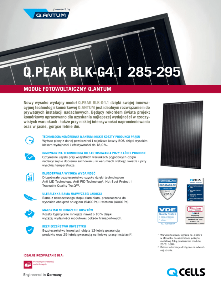 Q.PEAK BLK-G4.1 285-295 MODUŁ FOTOWOLTAICZNY Q.ANTUM Nowy wysoko wydajny moduł Q.PEAK BLK-G4.1 dzięki swojej innowacyjnej technologii komórkowej Q.ANTUM jest idealnym rozwiązaniem do prywatnych instalacji nadachowych. Będący rekordem świata projekt komórkowy opracowano dla uzyskania najlepszej wydajności w rzeczywistych warunkach - także przy niskiej intensywności napromieniowania oraz w jasne, gorące letnie dni. TECHNOLOGIA KOMÓRKOWA Q.ANTUM: NISKIE KOSZTY PRODUKCJI PRĄDU Wyższe plony z danej powierzchni i najniższe koszty BOS dzięki wysokim klasom wydajności i efektywności do 18,0 %. INNOWACYJNA TECHNOLOGIA DO ZASTOSOWANIA PRZY KAŻDEJ POGODZIE Optymalne uzyski przy wszystkich warunkach pogodowych dzięki nadzwyczajnie dobremu zachowaniu w warunkach słabego światła i przy wysokiej temperaturze. DŁUGOTRWAŁA WYSOKA WYDAJNOŚĆ Długotrwałe bezpieczeństwo uzysku dzięki technologiom Anti LID Technology, Anti PID Technology1, Hot-Spot Protect i Traceable Quality Tra.Q™. GWARANCJA UZYSKU MOCY ANTI PID TECHNOLOGY (APT) HOT-SPOT PROTECT (HSP) ULTRALEKKA RAMA NAJWYŻSZEJ JAKOŚCI Rama z nowoczesnego stopu aluminium, przeznaczona do wysokich obciążeń śniegiem (5400 Pa) i wiatrem (4000 Pa). TRACEABLE QUALITY (TRA.Q ™) PL MAKSYMALNE OBNIŻENIE KOSZTÓW Koszty logistyczne mniejsze nawet o 10 % dzięki wyższej wydajności modułowej boksów transportowych. BEZPIECZEŃSTWO INWESTYCJI Bezpieczeństwo inwestycji objęte 12-letnią gwarancją produktu oraz 25-letnią gwarancją na liniową pracę instalacji2. IDEALNE ROZWIĄZANIE DLA: Prywatnych instalacji nadachowych ANTI LID TECHNOLOGY (ALT) PL MOD:27898 Quality Tested wysoka niezawodniść nieznaczna degradacja regularna kontrola produktu ID. 40032587 photon.info/laboratory Najlepszy polikrystaliczny moduł fotowoltaiczny 2014 Q.PRO-G2 235 Test przeprowadzony na 174 modułach Warunki testowe: Ogniwa na -1500 V w stosunku do uziemionej, pokrytej metalową folią powierzchni modułu, 25 °C, 168 h 2 Dalsze informacje dostępne na odwrotnej stronie. 1 SPECYFIKACJA MECHANICZNA PL Wymiary 1670 mm × 1000 mm × 32 mm (łącznie z ramą) Waga 18,8 kg Przednia powłoka 3,2 mm termicznie wzmocnione szkło z technologią antyrefleksyjną Tylna powłoka Folia wielowarstwowa Rama Czarny, aluminium anodowane Ogniwo 6 × 10 monokrystaliczne ogniwa słoneczne Q.ANTUM Gniazdo przyłączeniowe 66-77 mm × 115-90 mm × 15-19 mm Klasa ochronności IP67, z diodami obejściowymi Kabel 4 mm² kabla solarnego; (+) ≥ 1000 mm, (-) ≥ 1000 mm Urządzenie wtykowe Multi-Contact MC4 a MC4 intermateable, IP68 1670 mm 980 mm 150 mm 345 mm 6 × otwór uziemienia ø 4,5 mm Rama Etykieta produktu 951 mm ≥1000 mm Kabel przyłączeniowy ze złączem wtykowym 1000 m m Skrzynka przyłączeniowa 8 × otwór odprowadzania wody 4 × punkt mocowania (DETAL A) DETAL A 32 mm 16 mm 8,5 mm 24,5 mm PARAMETRY ELEKTRYCZNE KLASY DZIAŁANIA 285 290 295 MINIMALNA WYDAJNOŚĆ W STANDARDOWYCH WARUNKACH TESTOWYCH, STC1 (TOLERANCJA MOCY +5 W / -0 W) Moc w punkcie MPP 2 PMPP [W] 285 290 295 ISC [A] 9,56 9,63 9,70 Napięcie jałowe* UOC [V] 38,91 39,19 39,48 Prąd w punkcie MPP* IMPP [A] 8,98 9,07 9,17 Napięcie w punkcie MPP* UMPP [V] 31,73 31,96 32,19 η [%] ≥ 17,1 ≥ 17,4 ≥ 17,7 218,3 Minimum Prąd zwarcia* Efektywność2 MINIMALNA WYDAJNOŚĆ W NORMALNYCH WARUNKACH EKSPLOATACJI, NOC 3 PMPP [W] 210,9 214,6 Prąd zwarcia* ISC [A] 7,71 7,77 7,82 Napięcie jałowe* UOC [V] 36,38 36,65 36,92 Prąd w punkcie MPP* IMPP [A] 7,04 7,12 7,20 Napięcie w punkcie MPP* UMPP [V] 29,95 30,14 30,33 Tolerancje przy pomiarach STC ± 3 %; NOC ± 5 % 3 800 W/m², NOCT, widmo AM 1.5 G GWARANCJA WYDAJNOŚCI Q CELLS WZGLĘDNY STOPIEŃ SPRAWNOŚCI W ODNIESIENIU DO MOCY ZNAMIONOWEJ [%] PL 2 100 WYDAJNOŚĆ PRZY NISKIM NASŁONECZNIENIU Minimalnie 98 % mocy znamionowej w ciągu pierwszego roku. Następnie spadek o maks. 0,6 % na rok. Przynajmniej 92,6 % mocy znamionowej po 10 latach. Przynajmniej 83,6 % mocy znamionowej po 25 latach. Q CELLS Standard w przemyśle dla gwarancji liniowych* Standard w przemyśle dla gwarancji stopniowych* 98 95 90 85 80 75 0 5 10 15 * Wartości standardowe, wartości rzeczywiste mogą się różnić 20 Uśrednione warunki gwarancyjne oferowane przez 10 przedsiębiorstw z branży PV o największej mocy produkcyjnej w 2014 r. (stan na wrzesień 2014 r.) * 25 LATA Wszystkie dane w granicach tolerancji pomiaru. Pełna gwarancja dotycząca produktu i wydajności zgodnie z aktualnie obowiązującymi gwarancjami spółek dystrybucyjnych Q CELLS w danym państwie. 110 100 90 80 200 400 600 800 1000 Irradiance [W/m²] NASŁONECZNIENIE [W/M²] Typowa wydajność modułu w warunkach niskiego napromieniowania porównując z warunkami STC (25 °C, 1000 W/m²). WSPÓŁCZYNNIKI TEMPERATURY Temperaturowy współczynnik prądu ISC α [% / K] + 0,04 Temperaturowy współczynnik napięcia UOC β [% / K] Temperaturowy współczynnik mocy PMPP γ [% / K] − 0,39 Temperatura ogniw przy pracy znamionowej NOCT [°C] USYS [V] 1000 Klasa bezpieczeństwa II IR [A] 20 Ochrona przeciwpożarowa C [Pa] 4000 / 5400 Dopuszczalna temperatura modułu przy pracy ciągłej − 40 °C – +85 °C − 0,28 45 PARAMETRY DLA POŁĄCZENIA SYSTEMU Maksymalne napięcie systemu Maksymalny prąd wsteczny Obciążenie wiatrem / śniegiem (Test obciążenia zgodnie z IEC 61215) KWALIFIKACJE I CERTYFIKATY PARTNER VDE Quality Tested; IEC 61215 (wer. 2); IEC 61730 (wer. 1), klasa stosowania A Niniejsza karta charakterystyki odpowiada normie DIN EN 50380. WSKAZÓWKA: Należy koniecznie przestrzegać wskazówek zamieszczonych w instrukcji instalacji. Dalsze informacje dotyczące prawidłowego używania produktu znajdują się w instrukcji instalacji i obsługi lub mogą zostać uzyskane w serwisie technicznym. Hanwha Q CELLS GmbH Sonnenallee 17-21, 06766 Bitterfeld-Wolfen, Germany | TEL +49 (0)3494 66 99-23444 | FAX +49 (0)3494 66 99-23000 | EMAIL [email protected] | WEB www.q-cells.com Zastrzegamy sobie 