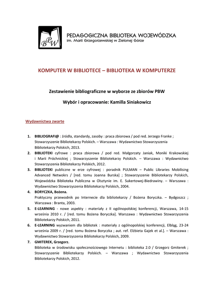 KOMPUTER W BIBLIOTECE – BIBLIOTEKA W KOMPUTERZE Zestawienie bibliograficzne w wyborze ze zbiorów PBW Wybór i opracowanie: Kamilla Siniakowicz Wydawnictwa zwarte 1. 2. 3. 4. 5. 6. 7. BIBLIOGRAFI@ : źródła, standardy, zasoby : praca zbiorowa / pod red. Jerzego Franke ; Stowarzyszenie Bibliotekarzy Polskich. – Warszawa : Wydawnictwo Stowarzyszenia Bibliotekarzy Polskich, 2013. BIBLIOTEKI cyfrowe : praca zbiorowa / pod red. Małgorzaty Janiak, Moniki Krakowskiej i Marii Próchnickiej ; Stowarzyszenie Bibliotekarzy Polskich. – Warszawa : Wydawnictwo Stowarzyszenia Bibliotekarzy Polskich, 2012. BIBLIOTEKI publiczne w erze cyfrowej : poradnik PULMAN – Public Libraries Mobilising Advanced Netwokrs / [red. tomu Joanna Burska] ; Stowarzyszenie Bibliotekarzy Polskich, Wojewódzka Biblioteka Publiczna w Olsztynie im. E. Sukertowej-Biedrawiny. – Warszawa : Wydawnictwo Stowarzyszenia Bibliotekarzy Polskich, 2004. BORYCZKA, Bożena. Praktyczny przewodnik po Internecie dla bibliotekarzy / Bożena Boryczka. – Bydgoszcz ; Warszawa : Branta, 2003. E-LEARNING - nowe aspekty : materiały z II ogólnopolskiej konferencji, Warszawa, 14-15 września 2010 r. / [red. tomu Bożena Boryczka]. Warszawa : Wydawnictwo Stowarzyszenia Bibliotekarzy Polskich, 2011. E-LEARNING wyzwaniem dla bibliotek : materiały z ogólnopolskiej konferencji, Elbląg, 23-24 września 2009 r. / [red. tomu Bożena Boryczka ; aut. ref. Elżbieta Gajek et al.]. – Warszawa : Wydawnictwo Stowarzyszenia Bibliotekarzy Polskich, 2009. GMITEREK, Grzegorz. Biblioteka w środowisku społecznościowego Internetu : biblioteka 2.0 / Grzegorz Gmiterek ; Stowarzyszenie Bibliotekarzy Polskich. – Warszawa ; Wydawnictwo Stowarzyszenia Bibliotekarzy Polskich, 2012. 8. 9. 10. 11. 12. 13. 14. 15. 16. 17. 18. GRYGROWSKI, Dariusz. Dokumenty nieksiążkowe w bibliotece / Dariusz Grygrowski ; Stowarzyszenie Bibliotekarzy Polskich. – Warszawa : Wydawnictwo Stowarzyszenia Bibliotekarzy Polskich, 2001. KISILOWSKA, Małgorzata. Biblioteka w sieci – sieć w bibliotece : wybrane społeczne i kulturowe aspekty współczesnego bibliotekarstwa / Małgorzata Kisilowska ; Stowarzyszenie Bibliotekarzy Polskich. – Warszawa : Wydawnictwo Stowarzyszenia Bibliotekarzy Polskich, 2010. NOWE media w bibliotece : materiały polsko-niemieckiej konferencji bibliotekarzy, Zielona Góra 14-16 kwietnia 2004 = Neue Medien in der Bibliothek : Materialen aus der deutschpolnischen Konferenz der Bibliothekaren und Bibliothekarinnen, Zielona Góra den 14-16. April 2004 / [red. Katarzyna Raczyńska]. – Zielona Góra : „Pro Libris”, 2004. PACEK, Jarosław. Bibliografia w zmieniającym się środowisku informacyjnym / Jarosław Pacek ; Stowarzyszenie Bibliotekarzy Polskich. – Warszawa : Wydawnictwo Stowarzyszenia Bibliotekarzy Polskich, 2010. PARTNERZY bibliotek : model komunikacji z otoczeniem / pod red. Izabeli Jurczak i Elżbiety Okularczyk ; Wyższa Szkoła Humanitas, Sosnowiec. – Dodr. – Łódź : Firma Księgarska Wiesława Juszczyka ; [Sosnowiec] : Oficyna Wydawnicza Humanitas, 2010. PRAKTYCZNE aspekty automatyzacji bibliotek publicznych : materiały z VII ogólnopolskiej konferencji pt.”Automatyzacja bibliotek pulicznych” Warszawa, 22-24 listopada 2006 r. / [red. tomu Elżbieta Górska]. – Warszawa : Wydawnictwo SBP - Stowarzyszenia Bibliotekarzy Polskich, 2007. RADWAŃSKI, Aleksander. Jak komputeryzować bibliotekę : poradnik / Aleksander Radwański. – Warszawa : Wydawnictwo Stowarzyszenia Bibliotekarzy Polskich, 2000. REGIONALNE sieci współpracy – strategie, narzędzia, realizacje : IX ogólnopolska konferencja „Automatyzacja bibliotek publicznych”, Warszawa, 25-25 listopada 2010 r. / [red. tomu Katarzyna Materska]. – Warszawa : Wydawnictwo Stowarzyszenia Bibliotekarzy Polskich, 2011. ŚCIĄGA dla bibliotekarzy : strony www bibliotek, instytucji kultury, fundacji, serwisów informacyjnych, blogów i inne adresy przydatne w codziennej pracy bibliotekarza / oprac. Grażyna Bilska. – Wyd. 2 popr. i uzup. – Warszawa : Wydawnictwo SBP – Stowarzyszenia Bibliotekarzy Polskich, 2012. ŚWIAT w obrazach : zbiory graficzne w instytucjach kultury – ich typologia, organizacja i funkcje / pod red. Małgorzaty Komzy. – Wrocław : Wydawnictwo Uniwersytetu Wrocławskiego, 2009. UNOWOCZEŚNIENIE organizacji i metod pracy bibliotek w świetle zmieniających się potrzeb czytelników : edycja II : materiały konferencji, Opole, 16-17 listopada 2011 r. / pod red. Wandy Matwiejczuk i Danuty Szewczyk-Kłos ; Uniwersytet Opolski. – Opole : Wydawnictwo Uniwersytetu Opolskiego, 2012.. Artykuł w wydawnictwie zwartym 1. BREWCZYŃSKA, Magdalena. Wykorzystanie platformy edukacyjnej Moodle w Bibliotece Pedagogicznej KujawskoPomorskiego Centrum Edukacji Nauczycieli we Włocławku / Magdalena Brewczyńska, Agata Safian. // W : E-learning wyzwaniem dla bibliotek – S. 120-127. 2. CHARKIEWICZ, Adam. Szkolenie biblioteczne online w Szkole Głównej Handlowej w Warszawie w kontekście globalnej sieci cyfrowej / Adam Charkiewicz. // W: E-learning wyzwaniem dla bibliotek – S. 114-119. 3. DERFERT-WOLF, Lidia. Dogonić Google? / Lidia Derfekt-Wolf. // W : Biblioteka w kryzysie czy kryzys w bibliotece? – S. 53-62. 4. DOBRZYŃSKA-LANKOSZ, Ewa. Biblioteka cyfrowa jako jeden z przejawów aktywności współczesnej biblioteki akademickiej / Ewa Dobrzyńska-Lankosz.// W : Biblioteka w kryzysie czy kryzys w bibliotece? – S. 63-68. 5. DOROŻKO, Jerzy. Budujemy e-szkołę : krótki przegląd możliwości / Jerzy Dorożko.// W : E-learning wyzwaniem dla bibliotek – S. 87-91. 6. GABRYSIAK, Mariusz. Dolnośląski Zasób Biblioteczny w systemie ALEPH / Mariusz Gabrysiak.// W : Regionalne sieci współpracy – strategie, narzędzia, realizacje – S. 94-97. 7. GAJEK, Elżbieta. E-learning w edukacji / Elżbieta Gajek.// W : E-learning wyzwaniem dla bibliotek – S. 8-21. 8. GREGORCZYK, Grażyna. E-learning jako wartość dodana / Grażyna Gregorczyk.// W : E-lea
