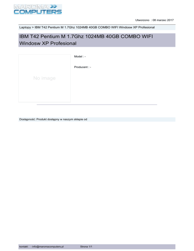 Utworzono : 08 marzec 2017 Laptopy > IBM T42 Pentium M 1.7Ghz 1024MB 40GB COMBO WIFI Windosw XP Profesional IBM T42 Pentium M 1.7Ghz 1024MB 40GB COMBO WIFI Windosw XP Profesional Model : - s r te Producent : - No image C a Dostępność: Produkt dostępny w naszym sklepie od m ro a M kontakt : - [email protected] Strona 1/1 m o u p