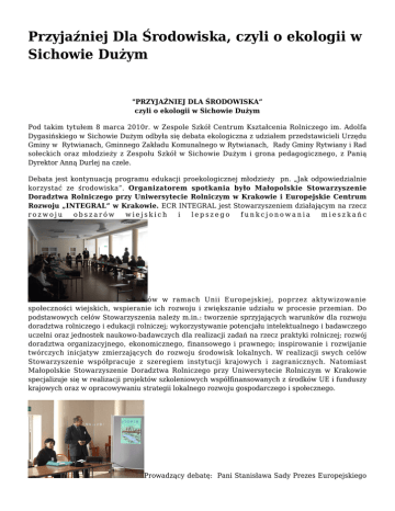 Przyjaźniej Dla Środowiska, czyli o ekologii w Sichowie Dużym "PRZYJAŹNIEJ DLA ŚRODOWISKA” czyli o ekologii w Sichowie Dużym Pod takim tytułem 8 marca 2010r. w Zespole Szkół Centrum Kształcenia Rolniczego im. Adolfa Dygasińskiego w Sichowie Dużym odbyła się debata ekologiczna z udziałem przedstawicieli Urzędu Gminy w Rytwianach, Gminnego Zakładu Komunalnego w Rytwianach, Rady Gminy Rytwiany i Rad sołeckich oraz młodzieży z Zespołu Szkół w Sichowie Dużym i grona pedagogicznego, z Panią Dyrektor Anną Durlej na czele. Debata jest kontynuacją programu edukacji proekologicznej młodzieży pn. „Jak odpowiedzialnie korzystać ze środowiska”. Organizatorem spotkania było Małopolskie Stowarzyszenie Doradztwa Rolniczego przy Uniwersytecie Rolniczym w Krakowie i Europejskie Centrum Rozwoju „INTEGRAL” w Krakowie. ECR INTEGRAL jest Stowarzyszeniem działającym na rzecz rozwoju obszarów wiejskich i lepszego funkcjonowania mieszkańc ów w ramach Unii Europejskiej, poprzez aktywizowanie społeczności wiejskich, wspieranie ich rozwoju i zwiększanie udziału w procesie przemian. Do podstawowych celów Stowarzyszenia należy m.in.: tworzenie sprzyjających warunków dla rozwoju doradztwa rolniczego i edukacji rolniczej; wykorzystywanie potencjału intelektualnego i badawczego uczelni oraz jednostek naukowo-badawczych dla realizacji zadań na rzecz praktyki rolniczej; rozwój doradztwa organizacyjnego, ekonomicznego, finansowego i prawnego; inspirowanie i rozwijanie twórczych inicjatyw zmierzających do rozwoju środowisk lokalnych. W realizacji swych celów Stowarzyszenie współpracuje z szeregiem instytucji krajowych i zagranicznych. Natomiast Małopolskie Stowarzyszenie Doradztwa Rolniczego przy Uniwersytecie Rolniczym w Krakowie specjalizuje się w realizacji projektów szkoleniowych współfinansowanych z środków UE i funduszy krajowych oraz w opracowywaniu strategii lokalnego rozwoju gospodarczego i społecznego. Prowadzący debatę: Pani Stanisława Sady Prezes Europejskiego Centrum Rozwoju „INTEGRAL” w Krakowie i Pan Sylwester Smoleń z Akademii Rolniczej w Krakowie, skupili się na zagadnieniach dotyczących sposobów ochrony i zachowania środowiska naturalnego. Zwrócili uwagę uczestników spotkania m.in. na: - działania przez które można zapewnić wdrażanie zrównoważonego rozwoju, - zagadnienia z zakresu sposobów ochrony i korzystania z zasobów wodnych, - działania prośrodowiskowe związane z odpadami, - ochronę różnorodności biologicznej. Wójt Gminy Rytwiany Grzegorz Forkasiewicz w swoim wystąpieniu przedstawił pokrótce zadania, jakie Gmina realizuje obecnie w zakresie ochrony środowiska, problemy związane z gospodarką wodno- ściekową, gospodarką odpadami komunalnymi na terenie Gminy a także ambitne plany ekologiczne na przyszłość. Omówił także obecnie realizowane inwestycje, które wpłyną korzystnie na ekologię w Gminie Rytwiany. Kierownik Gminnego Zakładu Komunalnego w Rytwianach Piotr Błąk przybliżył temat odbioru odpadów od mieszkańców Gminy, segregacji u źródła oraz zbiorowego zaopatrzenia mieszkańców w wodę pitną. Swój wkład w przebieg debaty włożyła młodzież z Zespołu Szkół Centrum Kształcenia Rolniczego w Sichowie Dużym, która z dużym zaangażowaniem i w bardzo interesujący sposób przedstawiła zagadnienia z zakresu ekologii, a także swoje poglądy na sprawy związane z ochroną środowiska naturalnego. Młodzież zaprezentowała również prace plastyczne wykonane w ramach konkursu pt. „Nasze środowisko naszym okiem”. W czasie debaty dominowała przede wszystkim troska o środowisko naturalne, o przyszłość wspólnego domu - ziemi i jej mieszkańców. Na zakończenie spotkania młodzież otrzymała zaświadczenia o ukończeniu szkoleń oraz nagrody za najciekawsze prace wykonane w ramach konkursu. Spotkanie zakończono wspólnym pamiątkowym zdjęciem. Zobacz również: www.zsrsichow.strefa.pl/zsr/news.php www.ecr-integral.org.pl www.msdr.edu.pl Bronisława Widanka Gmina Rytwiany - www.rytwiany.com.pl