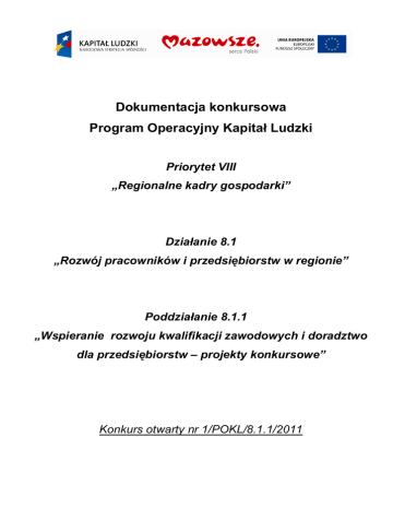 Dokumentacja konkursowa Program Operacyjny Kapitał Ludzki Priorytet VIII „Regionalne kadry gospodarki” Działanie 8.1 „Rozwój pracowników i przedsiębiorstw w regionie” Poddziałanie 8.1.1 „Wspieranie rozwoju kwalifikacji zawodowych i doradztwo dla przedsiębiorstw – projekty konkursowe” Konkurs otwarty nr 1/POKL/8.1.1/2011 Ogłoszenie prasowe Człowiek – najlepsza inwestycja Mazowiecka Jednostka Wdrażania Programów Unijnych (MJWPU) ogłasza konkurs ze środków Europejskiego Funduszu Społecznego na składanie wniosków o dofinansowanie projektów w ramach Programu Operacyjnego Kapitał Ludzki 2007-2013, Priorytetu VIII „Regionalne kadry gospodarki”, Działania 8.1 „Rozwój pracowników i przedsiębiorstw w regionie”, Poddziałania 8.1.1 „Wspieranie rozwoju kwalifikacji zawodowych i doradztwo dla przedsiębiorstw – projekty konkursowe” Typy projektów do realizacji w ramach konkursu: - ogólne i specjalistyczne szkolenia oraz doradztwo związane ze szkoleniami dla kadr zarządzających i pracowników przedsiębiorstw w zakresie m.in.: zarządzania, identyfikacji potrzeb w zakresie kwalifikacji pracowników, organizacji pracy, elastycznych form pracy, wdrażania technologii produkcyjnych przyjaznych środowisku, wykorzystania w prowadzonej działalności technologii informacyjnych i komunikacyjnych; - doradztwo dla mikro-, małych i średnich przedsiębiorstw (MMSP), w tym dla osób fizycznych prowadzących działalność gospodarczą, w szczególności w zakresie ekonomii, finansów, zarządzania zasobami ludzkimi lub rachunkowości (z wyłączeniem doradztwa związanego z procesami inwestycyjnymi). Wnioski o dofinansowanie projektów można składać osobiście, kurierem lub pocztą od 16 lutego 2011r. do zamknięcia konkursu (tj. do wyczerpania określonego limitu środków) od poniedziałku do piątku w godz. od 8.00 do 16.00 w Mazowieckiej Jednostce Wdrażania Programów Unijnych, w Głównym Punkcie Informacyjnym w Warszawie, przy ul. Jagiellońskiej 74, lub Lokalnych Punktach Informacyjnych w Ciechanowie, Ostrołęce, Płocku, Radomiu, Siedlcach. O terminie złożenia wniosku decyduje data złożenia wniosku w Głównym Punkcie Informacyjnym w Warszawie lub w jednym z Lokalnych Punktów Informacyjnych zlokalizowanych w Ciechanowie, Ostrołęce, Płocku, Radomiu, Siedlcach lub data stempla pocztowego. O dofinansowanie mogą występować wszystkie podmioty – z wyłączeniem osób fizycznych (nie dotyczy osób prowadzących działalność gospodarczą lub oświatową na podstawie przepisów odrębnych), które spełnią kryteria określone w dokumentacji konkursowej, z wyłączeniem podmiotów wymienionych w art. 207 ustawy z dnia 27 sierpnia 2009 r. o finansach publicznych (Dz. U. Nr 157, poz. 1240). Na dofinansowanie realizacji projektów wyłonionych w ramach konkursu przeznaczona jest kwota 11 114 371,00 PLN. Dokumentacja Konkursowa jest dostępna do wglądu w MJPWU w Głównym Punkcie Informacyjnym w Warszawie oraz w Lokalnych Punktach Informacyjnych w Ciechanowie, Ostrołęce, Płocku, Radomiu, Siedlcach. oraz na stronie internetowej www.mazowia.eu i www.mazovia.pl. Dodatkowe informacje można uzyskać w Wydziale Informacji i Szkoleń Beneficjentów oraz pod numerem infolinii: 0 801 101 101,e-mail: [email protected] Ogłoszenie współfinansowane przez Unię Europejską w ramach Europejskiego Funduszu Społecznego 2 SPIS TREŚCI I. Przedmiot konkurs……………………………………………………………………………………………………4 II. Informacje ogólne…………………………………………………………………...………………......................4 2.1. Informacje o konkursie…………………………………………………………..……………………………. .. 4 2.2. Kwota środków przeznaczona na dofinansowanie projektów…………………………………………........ 5 2.3. Forma finansowania…………………………………………………………………………….……………… ..5 2.4. Procedura wyboru projektów do realizacji…………………………………………………………….............7 2.5. Podstawa prawna i dokumenty programowe……………………………………………..……....………….16 III. Wymagania konkursowe………………………………………………………………………………...………..17 3.1. Podmioty uprawnione do ubiegania się o dofinansowanie projektu ...................................................... 17 3.2. Wymagania odnośnie grupy docelowej ................................................................................................. 18 3.3. Wymagania czasowe ............................................................................................................................ 18 3.4. Wymagania finansowe ........................................................................................................................... 19 3.5. Wymagania wynikające z przepisów dotyczących pomocy publicznej.................................................. 23 3.6. Wskaźniki pomiaru celu......................................................................................................................... 29 3.7. Wymagania dotyczące partnerstwa ....................................................................................................... 31 3.8. Wymagania dotyczące innowacyjności i współpracy ponadnarodowej ................................................. 33 3.9. Wymagania odnośnie przygotowania wniosku o dofinansowanie ......................................................... 32 3.10. Wymagania związane z realizacją projektu ......................................................................................... 33 3.11. Wymagane załączniki ................................................................................................