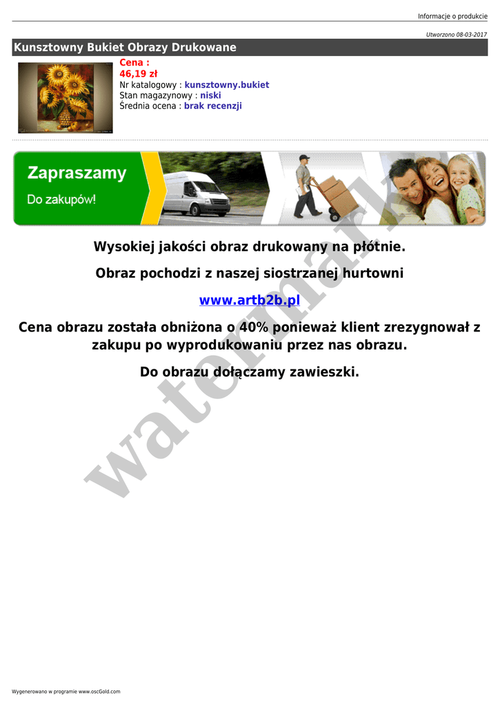 Informacje o produkcie Utworzono 08-03-2017 Kunsztowny Bukiet Obrazy Drukowane Cena : 46,19 zł er m ar k Nr katalogowy : kunsztowny.bukiet Stan magazynowy : niski Średnia ocena : brak recenzji Wysokiej jakości obraz drukowany na płótnie. Obraz pochodzi z naszej siostrzanej hurtowni www.artb2b.pl Cena obrazu została obniżona o 40% ponieważ klient zrezygnował z zakupu po wyprodukowaniu przez nas obrazu. w at Do obrazu dołączamy zawieszki. Wygenerowano w programie www.oscGold.com er m ar k at w Numer katalogowy: 1790A_1O Ilość elementów: 1 Rozmiar całkowity: 50x60cm
