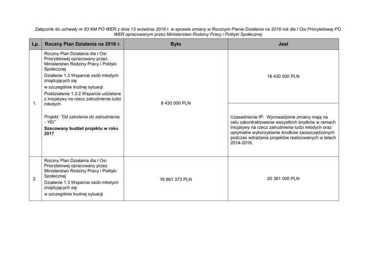 Załącznik do uchwały nr 83 KM PO WER z dnia 13 września 2016 r. w sprawie zmiany w Rocznym Planie Działania na 2016 rok dla I Osi Priorytetowej PO WER opracowanym przez Ministerstwo Rodziny Pracy i Polityki Społecznej Lp. Roczny Plan Działania na 2016 r. 1. Roczny Plan Działania dla I Osi Priorytetowej opracowany przez Ministerstwo Rodziny Pracy i Polityki Społecznej Działanie 1.3 Wsparcie osób młodych znajdujących się w szczególnie trudnej sytuacji Poddziałanie 1.3.2 Wsparcie udzielane z Inicjatywy na rzecz zatrudnienia ludzi młodych Było 16 430 000 PLN 8 430 000 PLN Projekt: ”Od szkolenia do zatrudnienia - YEI” Szacowany budżet projektu w roku 2017 2. Roczny Plan Działania dla I Osi Priorytetowej opracowany przez Ministerstwo Rodziny Pracy i Polityki Społecznej Działanie 1.3 Wsparcie osób młodych znajdujących się w szczególnie trudnej sytuacji Jest Uzasadnienie IP: Wprowadzone zmiany mają na celu zakontraktowanie wszystkich środków w ramach Inicjatywy na rzecz zatrudnienia ludzi młodych oraz optymalne wykorzystanie środków zaoszczędzonych podczas wdrażania projektów realizowanych w latach 2014-2016. 16 861 373 PLN 20 361 000 PLN Poddziałanie 1.3.2 Wsparcie udzielane z Inicjatywy na rzecz zatrudnienia ludzi młodych Uzasadnienie IP: Wprowadzone zmiany mają na celu zakontraktowanie wszystkich środków w ramach Inicjatywy na rzecz zatrudnienia ludzi młodych oraz optymalne wykorzystanie środków zaoszczędzonych podczas wdrażania projektów realizowanych w latach 2014-2016. Projekt: ”Od szkolenia do zatrudnienia - YEI” Szacowany budżet projektu w roku 2018 3. Roczny Plan Działania dla I Osi Priorytetowej opracowany przez Ministerstwo Rodziny Pracy i Polityki Społecznej Działanie 1.3 Wsparcie osób młodych znajdujących się w szczególnie trudnej sytuacji Poddziałanie 1.3.2 Wsparcie udzielane z Inicjatywy na rzecz zatrudnienia ludzi młodych 36 791 000 PLN 25 291 373 PL N Uzasadnienie IP: Wprowadzone zmiany mają na celu zakontraktowanie wszystkich środków w ramach Inicjatywy na rzecz zatrudnienia ludzi młodych oraz optymalne wykorzystanie środków zaoszczędzonych podczas wdrażania projektów realizowanych w latach 2014-2016. Projekt: ”Od szkolenia do zatrudnienia - YEI” Szacowany budżet projektu ogółem 4. Roczny Plan Działania dla I Osi Priorytetowej opracowany przez Ministerstwo Rodziny Pracy i Polityki Społecznej Działanie 1.3 Wsparcie osób młodych znajdujących się w szczególnie trudnej sytuacji 23 240 243 PLN 33 807 249,90 PLN 2 Poddziałanie 1.3.2 Wsparcie udzielane z Inicjatywy na rzecz zatrudnienia ludzi młodych Uzasadnienie IP: Wprowadzone zmiany mają na celu zakontraktowanie wszystkich środków w ramach Inicjatywy na rzecz zatrudnienia ludzi młodych oraz optymalne wykorzystanie środków zaoszczędzonych podczas wdrażania projektów realizowanych w latach 2014-2016. Projekt: ”Od szkolenia do zatrudnienia - YEI” Szacowany wkład UE 5. Roczny Plan Działania dla I Osi Priorytetowej opracowany przez Ministerstwo Rodziny Pracy i Polityki Społecznej Działanie 1.3 Wsparcie osób młodych znajdujących się w szczególnie trudnej sytuacji Poddziałanie 1.3.2 Wsparcie udzielane z Inicjatywy na rzecz zatrudnienia ludzi młodych Projekt: ”Od szkolenia do zatrudnienia - YEI” Kryterium dostępu nr 2 6. Roczny Plan Działania dla I Osi Priorytetowej opracowany przez Ministerstwo Rodziny Pracy i Polityki Społecznej Działanie 1.3 Wsparcie osób młodych znajdujących się w szczególnie trudnej sytuacji Uczestnikami projektu są osoby młode, w tym osoby z niepełnosprawnościami, w wieku 15-24 lat bez pracy, które nie uczestniczą w kształceniu lub szkoleniu (tzw. kategoria NEET), w tym w szczególności osoby zagrożone wykluczeniem społecznym. Wsparciem nie będą objęte osoby, które brały udział w projektach w ramach poddziałania 1.3.1 realizowanego w trybie konkursowym przez MRPiPS. Projekt skierowany jest do osób z niepełnosprawnościami w proporcji co najmniej takiej samej, jak proporcja osób z niepełnosprawnościami w wieku 15-24 lata zarejestrowanych w danym województwie w stosunku do ogólnej liczby zarejestrowanych osób bezrobotnych w wieku 15- 24 lata. Uczestnikami projektu są osoby bierne zawodowo, w tym osoby z niepełnosprawnościami, w wieku 15-24 lat bez pracy, które nie uczestniczą w kształceniu lub szkoleniu (tzw. kategoria NEET), w tym w szczególności osoby zagrożone wykluczeniem społecznym. Wsparciem nie będą objęte osoby, które brały udział w projektach w ramach poddziałania 1.3.1 realizowanego w trybie konkursowym przez MRPiPS. Uzasadnienie IP: Zapis zgodny z zapisami PO WER. Zmieniono w związku ze skierowaniem projektu jedynie do osób biernych zawodowo Projekt skierowany jest do osób z niepełnosprawnościami w proporcji co najmniej takiej samej, jak proporcja osób z niepełnosprawnościami w wieku 18-24 lata zarejestrowanych w danym województwie w stosunku do ogólnej liczby zarejestrowanych osób bezrobotnych w wieku 18- 24 lata. 3 Poddziałanie 1.3.2 Wsparcie udzielane z Inicjatywy na rzecz zatrudnienia ludzi młodych Uzasadnienie IP: Zmieniono przedział wiekowy, aby możliwe było wyliczenie właściwych proporcji z dostępnych statystyk. Projekt: ”Od szkolenia do zatrudnienia - YEI” Kryterium dostępu nr 5 7. Roczny Plan Działania dla I Osi Priorytetowej opracowany przez Ministerstwo Rodziny Pracy i Polityki Społecznej Działanie 1.3 Wsparcie osób młodych znajdujących się w szczególnie trudnej sytuacji Poddziałanie 1.3.2 Wsparcie udzielane z Inicjatywy na rzecz zatrudnienia ludzi młodych Do 28.02.2018 r. 960 osób ukończy udział w projekcie, 900 osób uzyska kwalifikacje zawodowe, a 1200 osób będzie kontynuowało udział w projekcie. Do 31.12.2017 r. 450 osób uzyska kwalifikacje zawodowe, a 1200 osób będzie kontynuowało udział w projekcie. Projekt: ”Od szkolenia do zatrudnienia - YEI” Kryterium dostępu nr 6 8. Roc