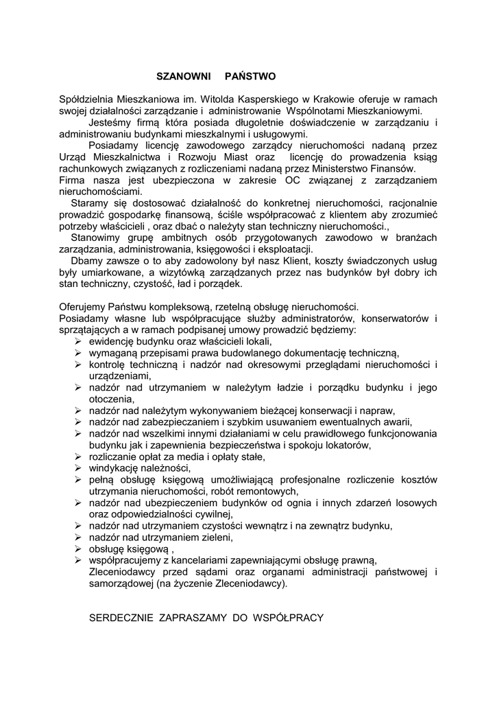 SZANOWNI PAŃSTWO Spółdzielnia Mieszkaniowa im. Witolda Kasperskiego w Krakowie oferuje w ramach swojej działalności zarządzanie i administrowanie Wspólnotami Mieszkaniowymi. Jesteśmy firmą która posiada długoletnie doświadczenie w zarządzaniu i administrowaniu budynkami mieszkalnymi i usługowymi. Posiadamy licencję zawodowego zarządcy nieruchomości nadaną przez Urząd Mieszkalnictwa i Rozwoju Miast oraz licencję do prowadzenia ksiąg rachunkowych związanych z rozliczeniami nadaną przez Ministerstwo Finansów. Firma nasza jest ubezpieczona w zakresie OC związanej z zarządzaniem nieruchomościami. Staramy się dostosować działalność do konkretnej nieruchomości, racjonalnie prowadzić gospodarkę finansową, ściśle współpracować z klientem aby zrozumieć potrzeby właścicieli , oraz dbać o należyty stan techniczny nieruchomości., Stanowimy grupę ambitnych osób przygotowanych zawodowo w branżach zarządzania, administrowania, księgowości i eksploatacji. Dbamy zawsze o to aby zadowolony był nasz Klient, koszty świadczonych usług były umiarkowane, a wizytówką zarządzanych przez nas budynków był dobry ich stan techniczny, czystość, ład i porządek. Oferujemy Państwu kompleksową, rzetelną obsługę nieruchomości. Posiadamy własne lub współpracujące służby administratorów, konserwatorów i sprzątających a w ramach podpisanej umowy prowadzić będziemy: ewidencję budynku oraz właścicieli lokali, wymaganą przepisami prawa budowlanego dokumentację techniczną, kontrolę techniczną i nadzór nad okresowymi przeglądami nieruchomości i urządzeniami, nadzór nad utrzymaniem w należytym ładzie i porządku budynku i jego otoczenia, nadzór nad należytym wykonywaniem bieżącej konserwacji i napraw, nadzór nad zabezpieczaniem i szybkim usuwaniem ewentualnych awarii, nadzór nad wszelkimi innymi działaniami w celu prawidłowego funkcjonowania budynku jak i zapewnienia bezpieczeństwa i spokoju lokatorów, rozliczanie opłat za media i opłaty stałe, windykację należności, pełną obsługę księgową umożliwiającą profesjonalne rozliczenie kosztów utrzymania nieruchomości, robót remontowych, nadzór nad ubezpieczeniem budynków od ognia i innych zdarzeń losowych oraz odpowiedzialności cywilnej, nadzór nad utrzymaniem czystości wewnątrz i na zewnątrz budynku, nadzór nad utrzymaniem zieleni, obsługę księgową , współpracujemy z kancelariami zapewniającymi obsługę prawną, Zleceniodawcy przed sądami oraz organami administracji państwowej i samorządowej (na życzenie Zleceniodawcy). SERDECZNIE ZAPRASZAMY DO WSPÓŁPRACY